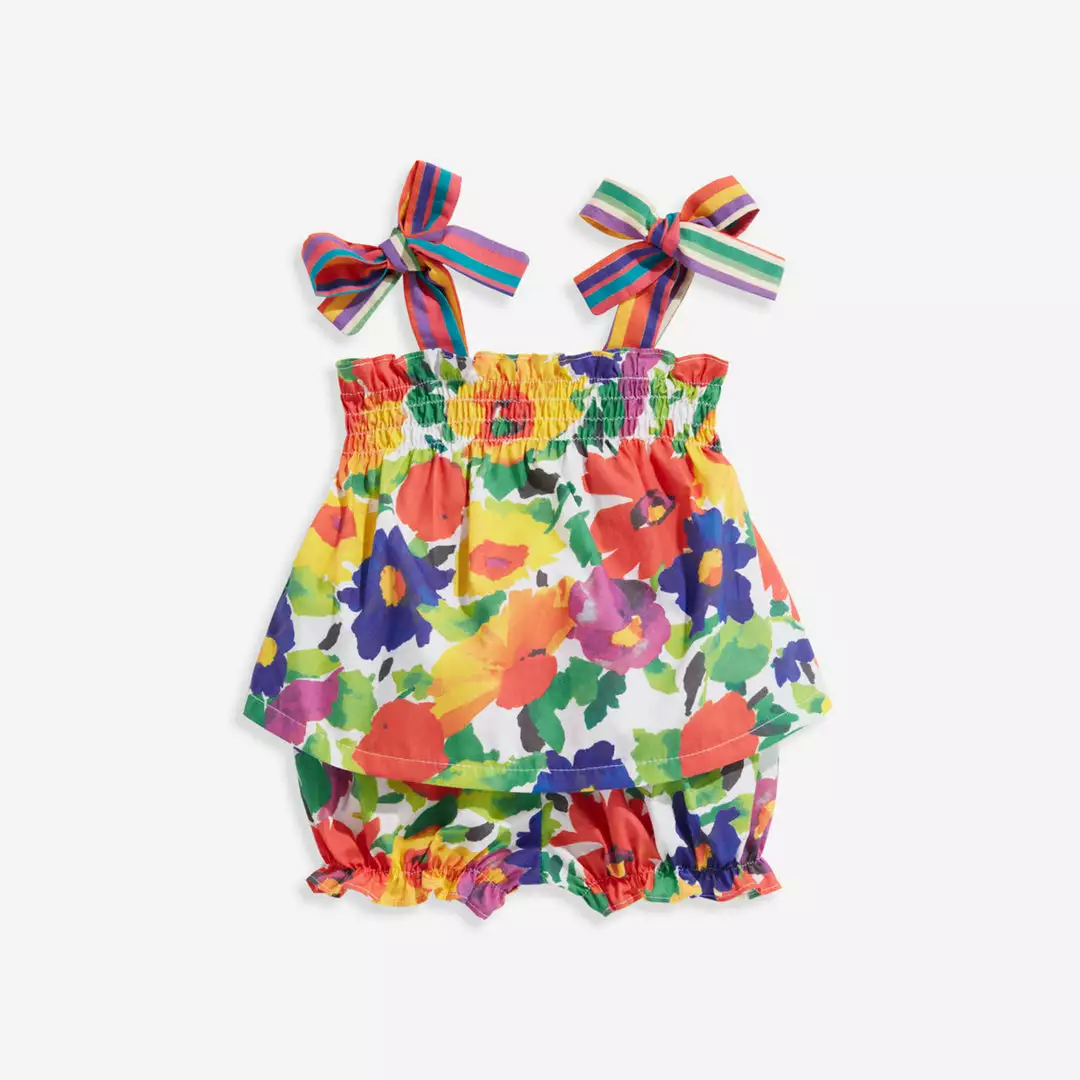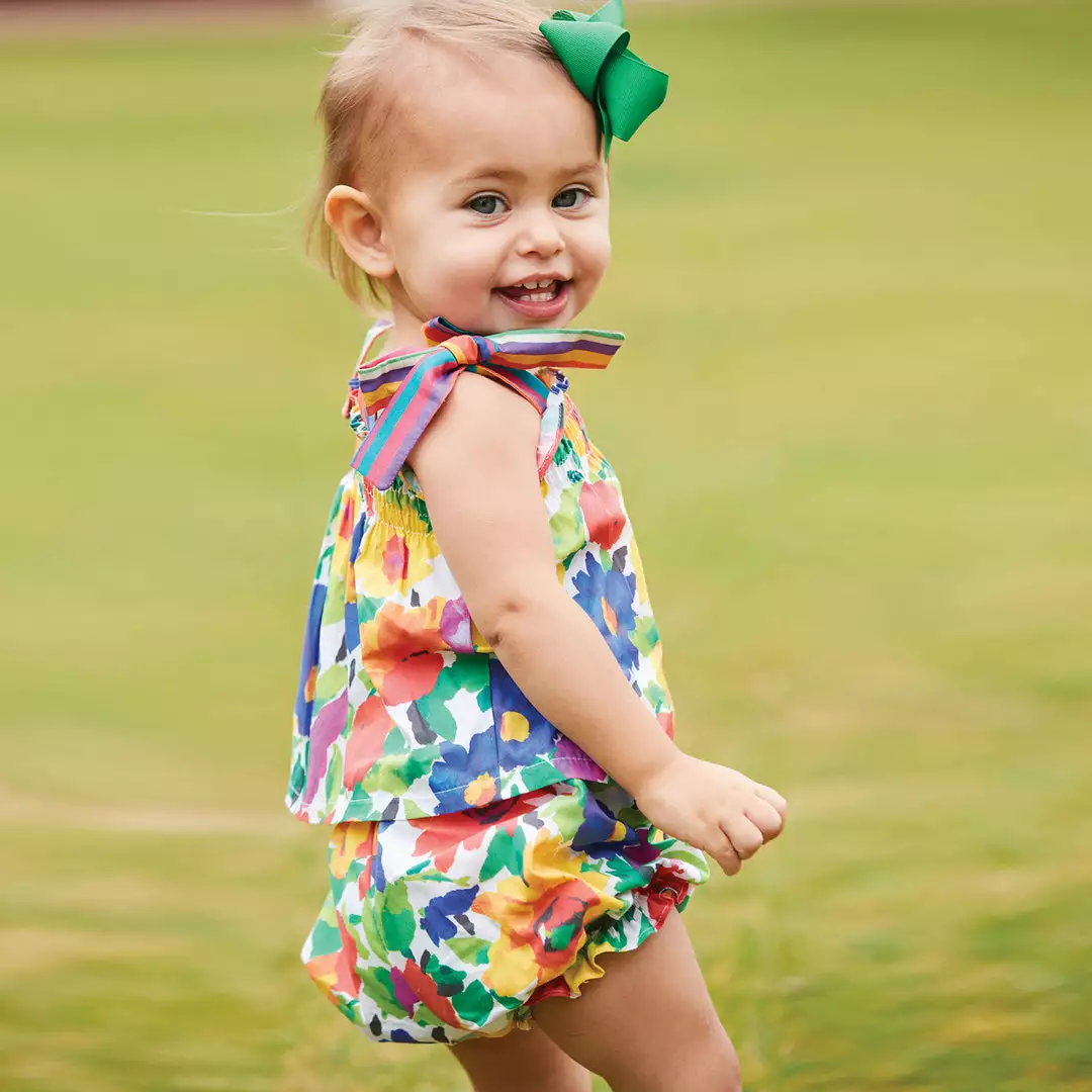 An absolute classic, the Shoulder Tie Bloomer Set will be a perfect addition to her curated wardrobe. This floral set accented with bows will bring out the most colorful personality in any baby girl.