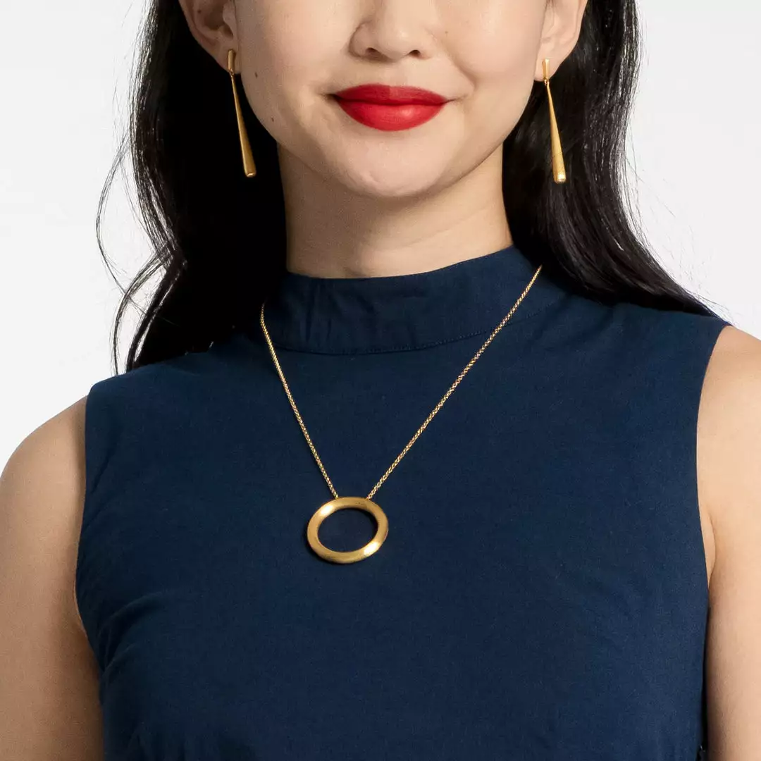 A fine rolo chain passes through the statement-making brushed gold hoop of the Dune Pendant. Featuring silicone slides, this necklace can be adjusted to the length of your choosing to create a seamless stack.