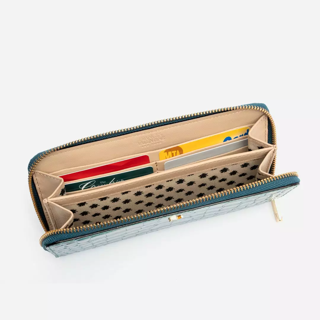 Zip around closure. Middle divider. Currency pocket. Fits all cards.