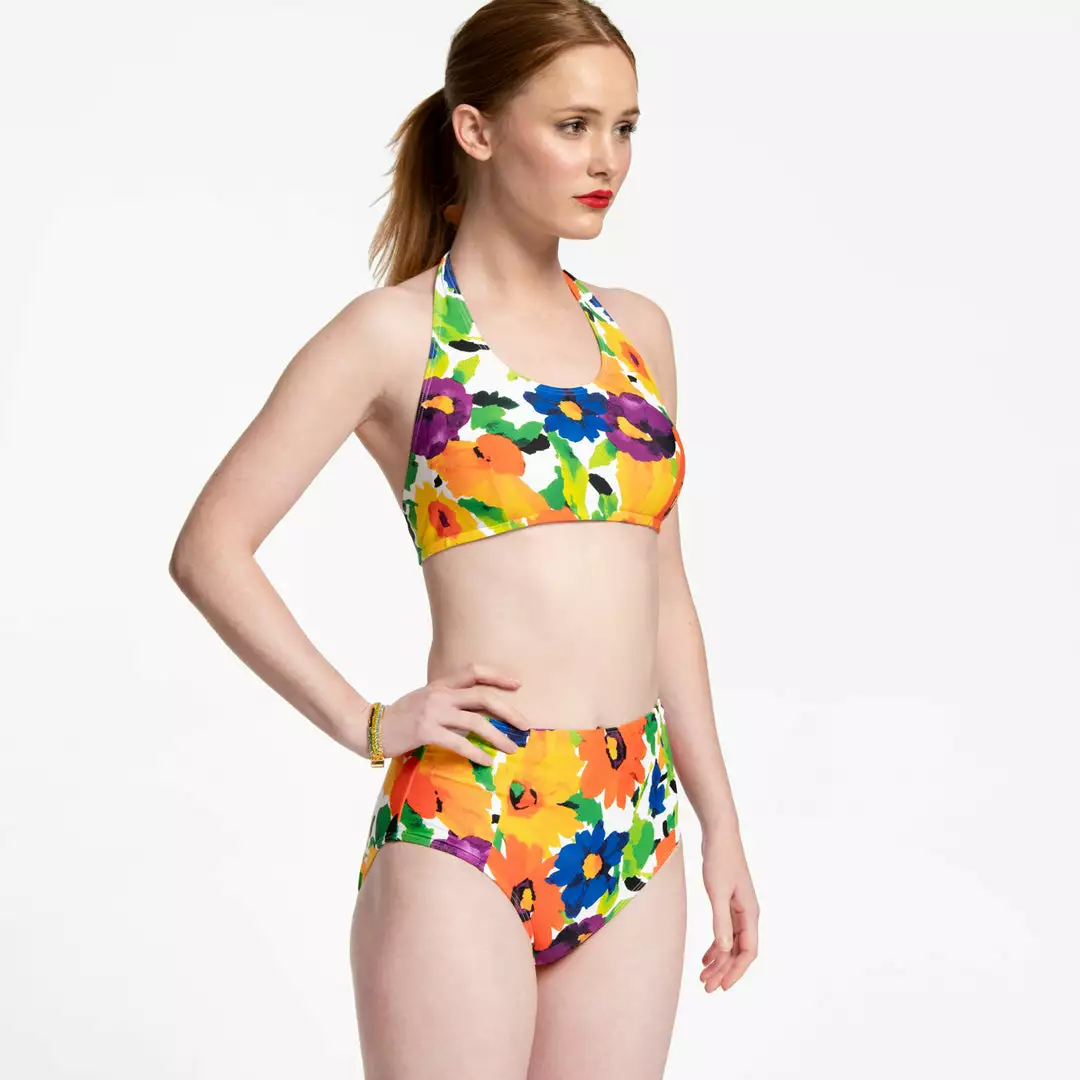 Our brand new swimsuit collection includes the Addy Two Piece. The Addy features a halter top (with built in bra support) and high waisted bottom.