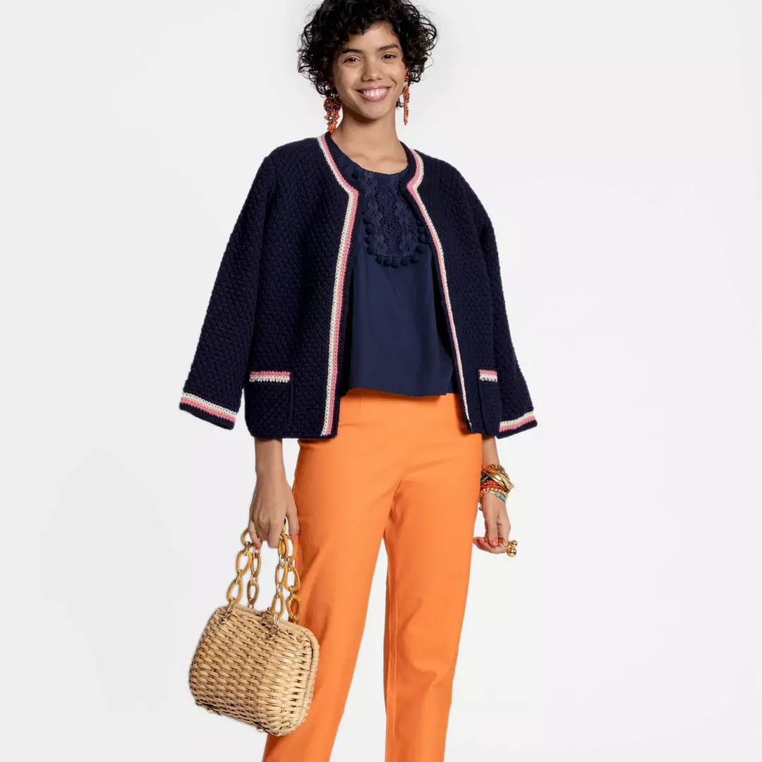 The Angie Border Cardigan, inspired by Elyce’s vintage sweater collection. Our cardi coat silhouette features an eye catching navy and oyster crochet border. Crafted in lambswool and lined with matching satin lining this cardigan is a show stopper. Paired with a statement necklace and your favorite t shirt or a crisp white button down, the options are endless.