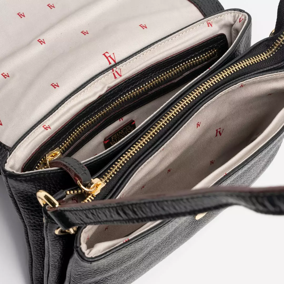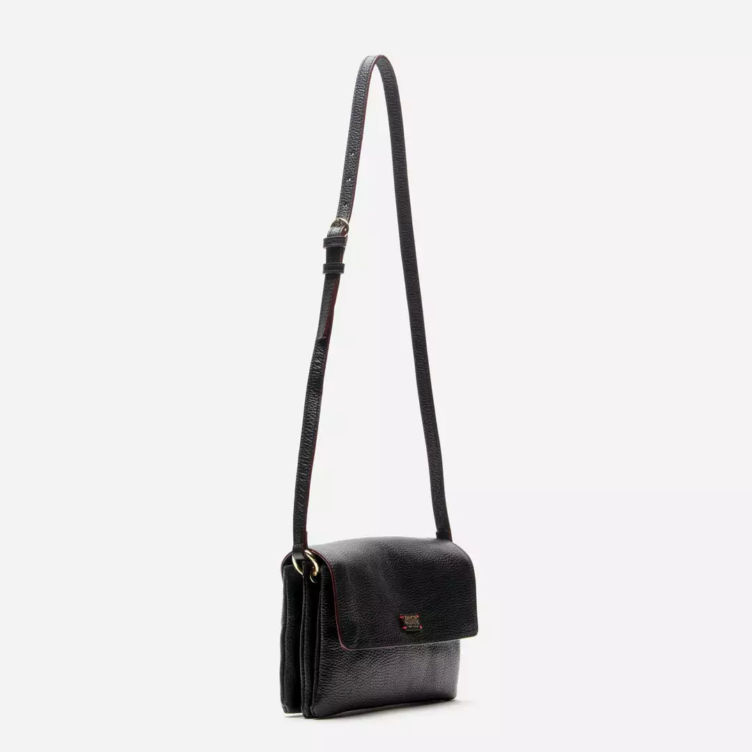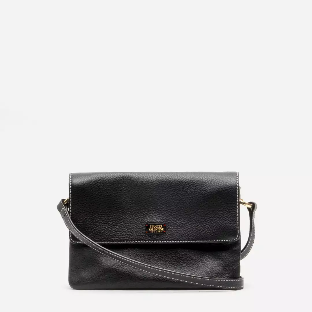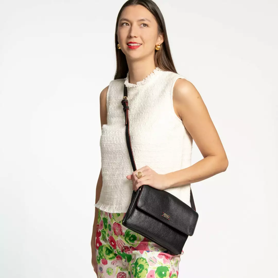 Tumbled leather. Interior slip pocket. Adjustable crossbody strap. Cotton twill asterisk dot lining. Magnetic flap closure.