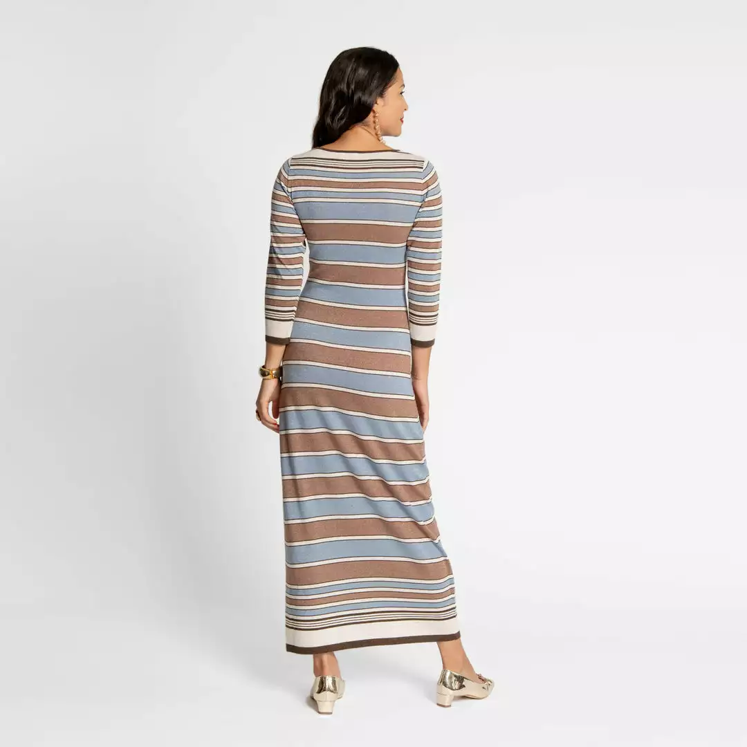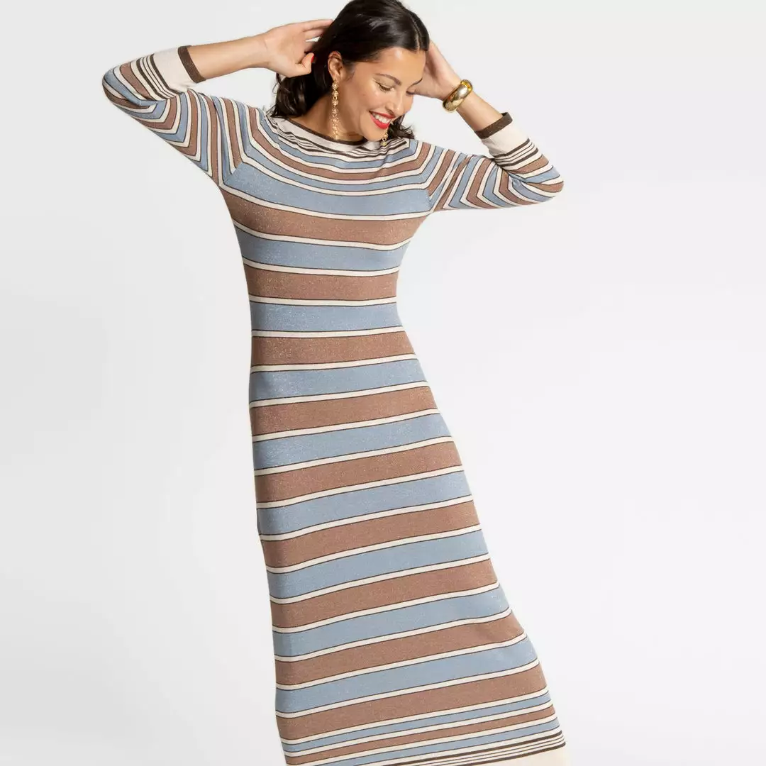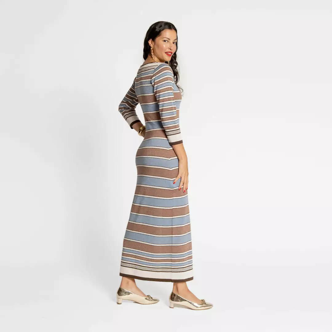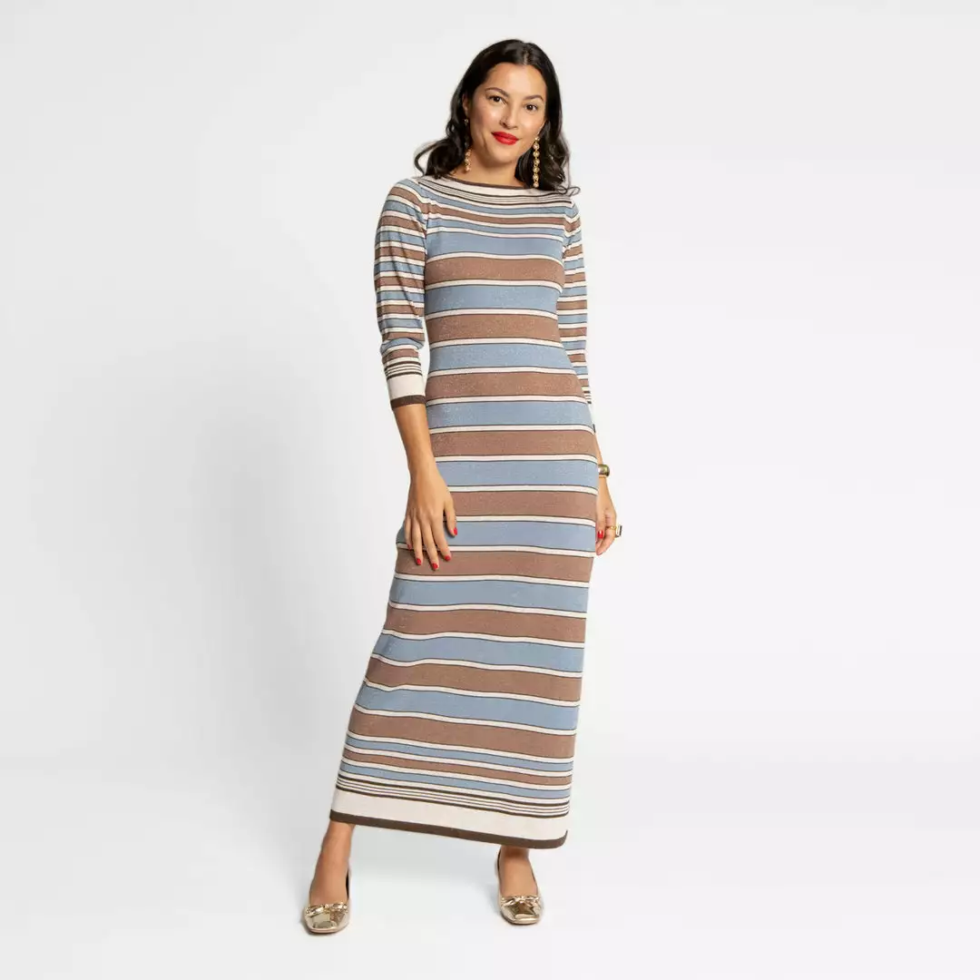 Introducing the Bianca Maxi Dress woven in custom FV stripes. This flattering dress is woven with a light lurex thread for a fun sheen! A more body conscious silhouette than our Colorblock Maxi, this style is sure to make an entrance at every event.