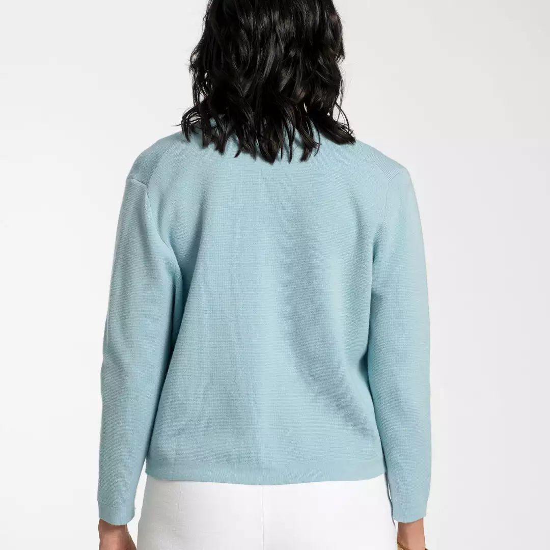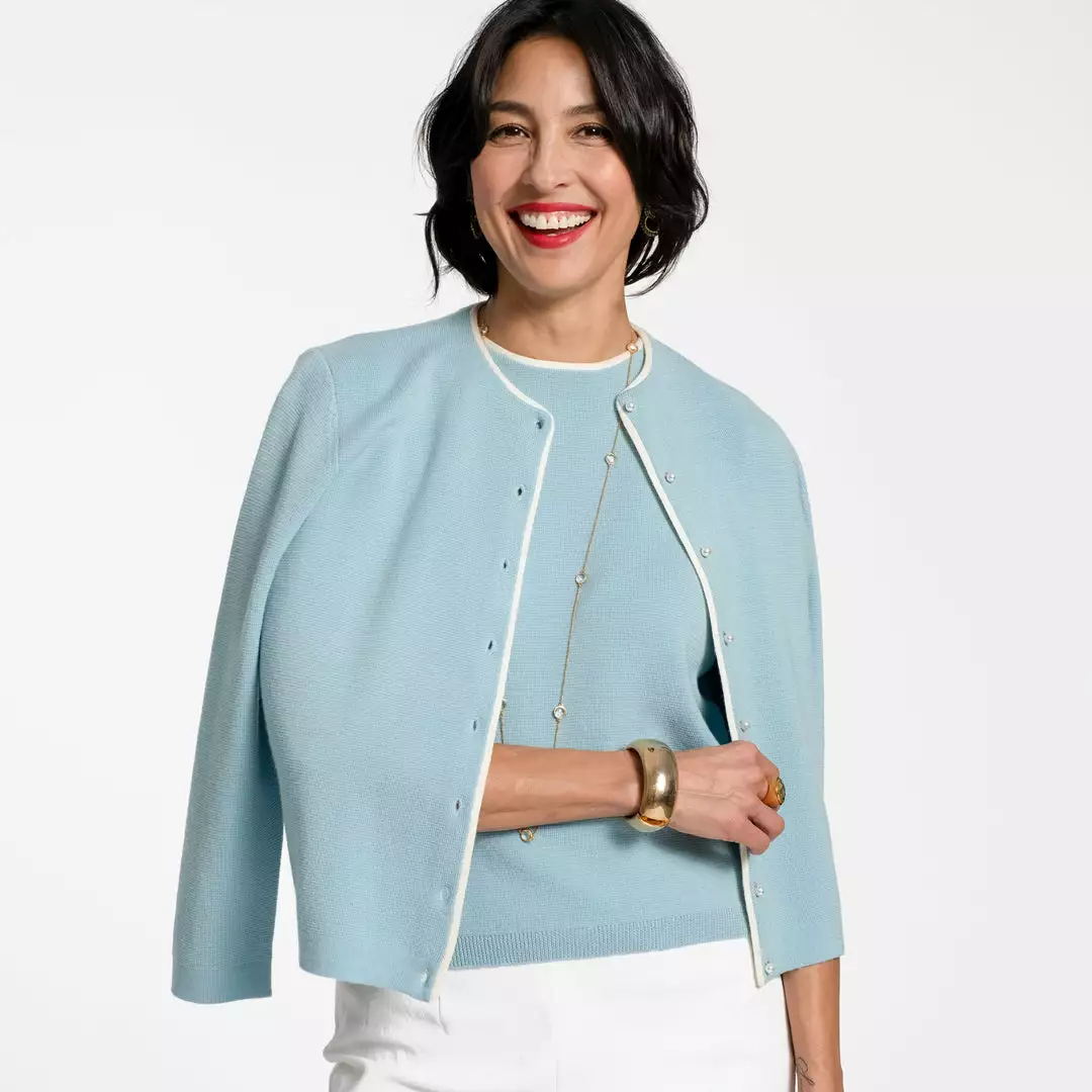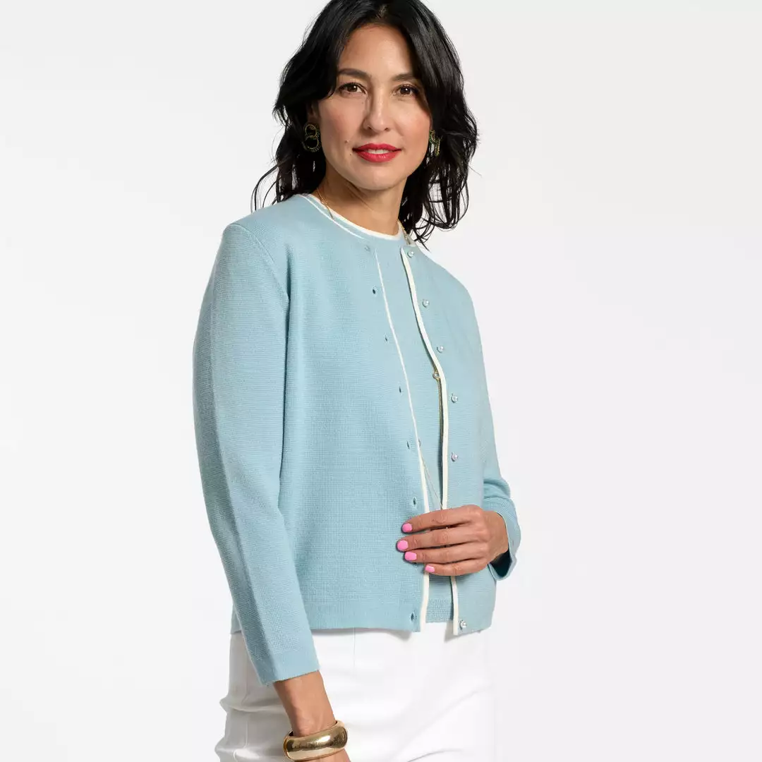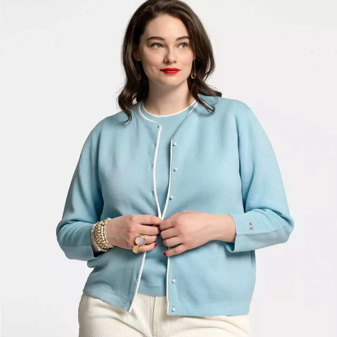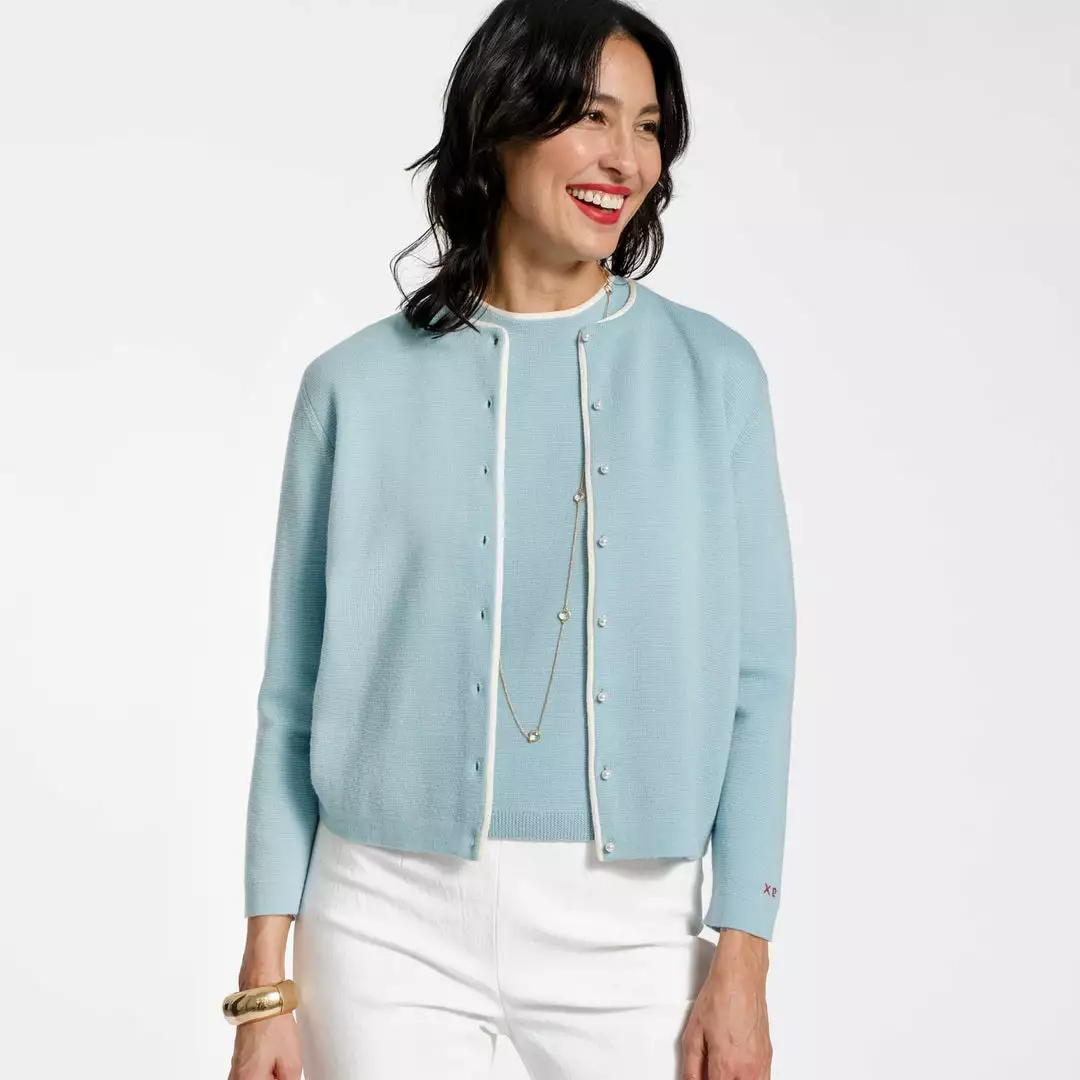 Our favorite Darling Cardigan receives an update in light blue merino and contrast oyster piping detail. Paired with our coordinating Shell Sweater, this sweater is perfect for every day and every occasion.
