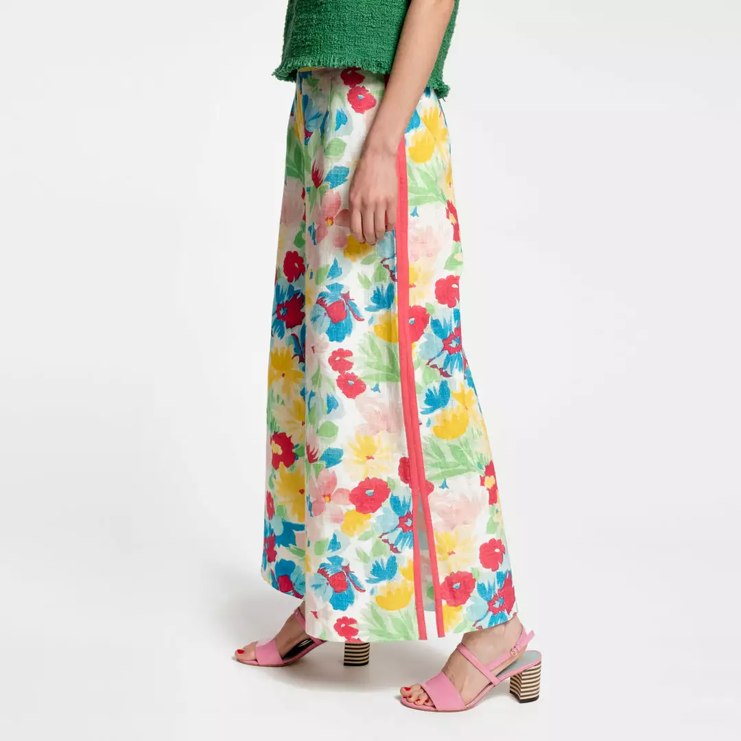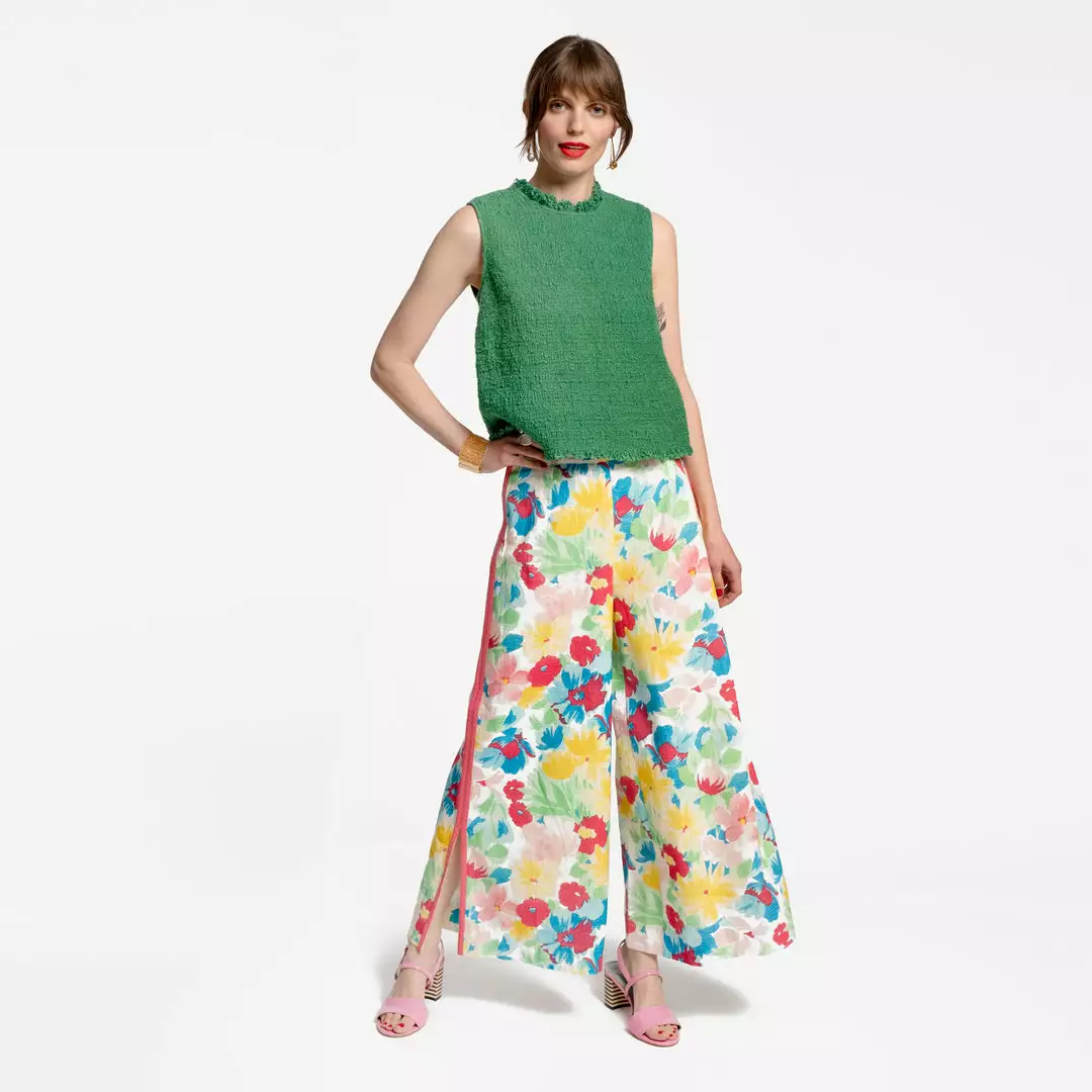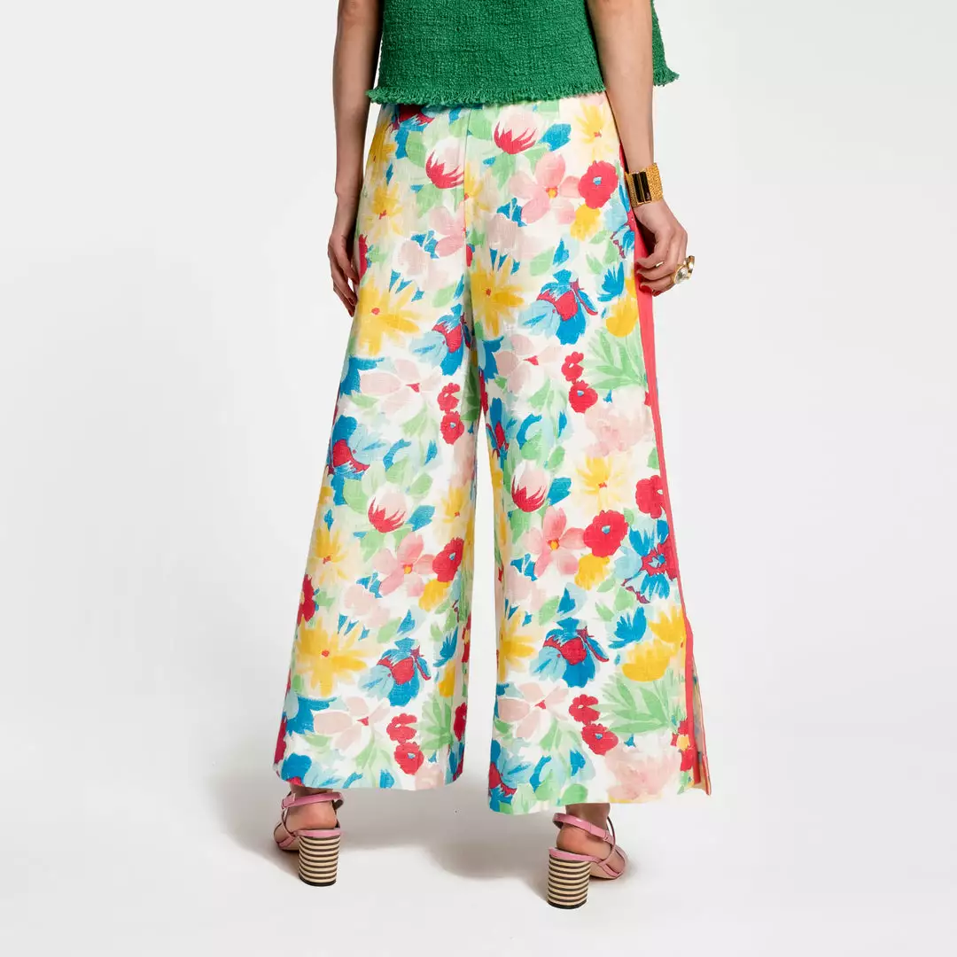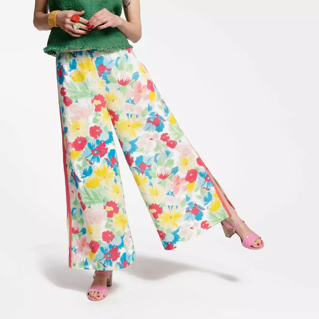 The Palazzo Pant featuring our new hibiscus print is a show stopper indeed. Paired with any of our solid tops you have an outfit that is ready for any event, day or night. Tuxedo Stripe detail down the side and a slit at the ankle make these pants perfect to pair with our warm weather shoes.