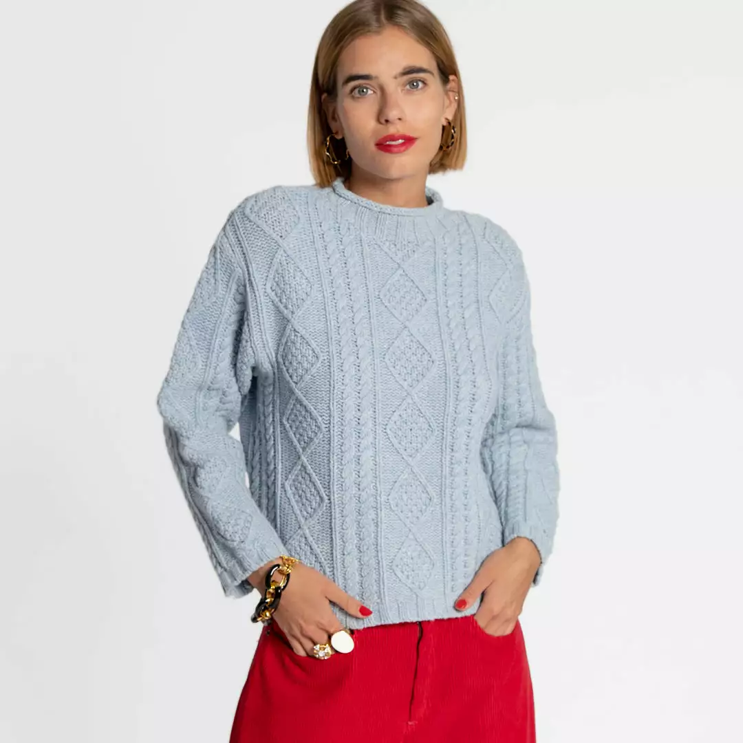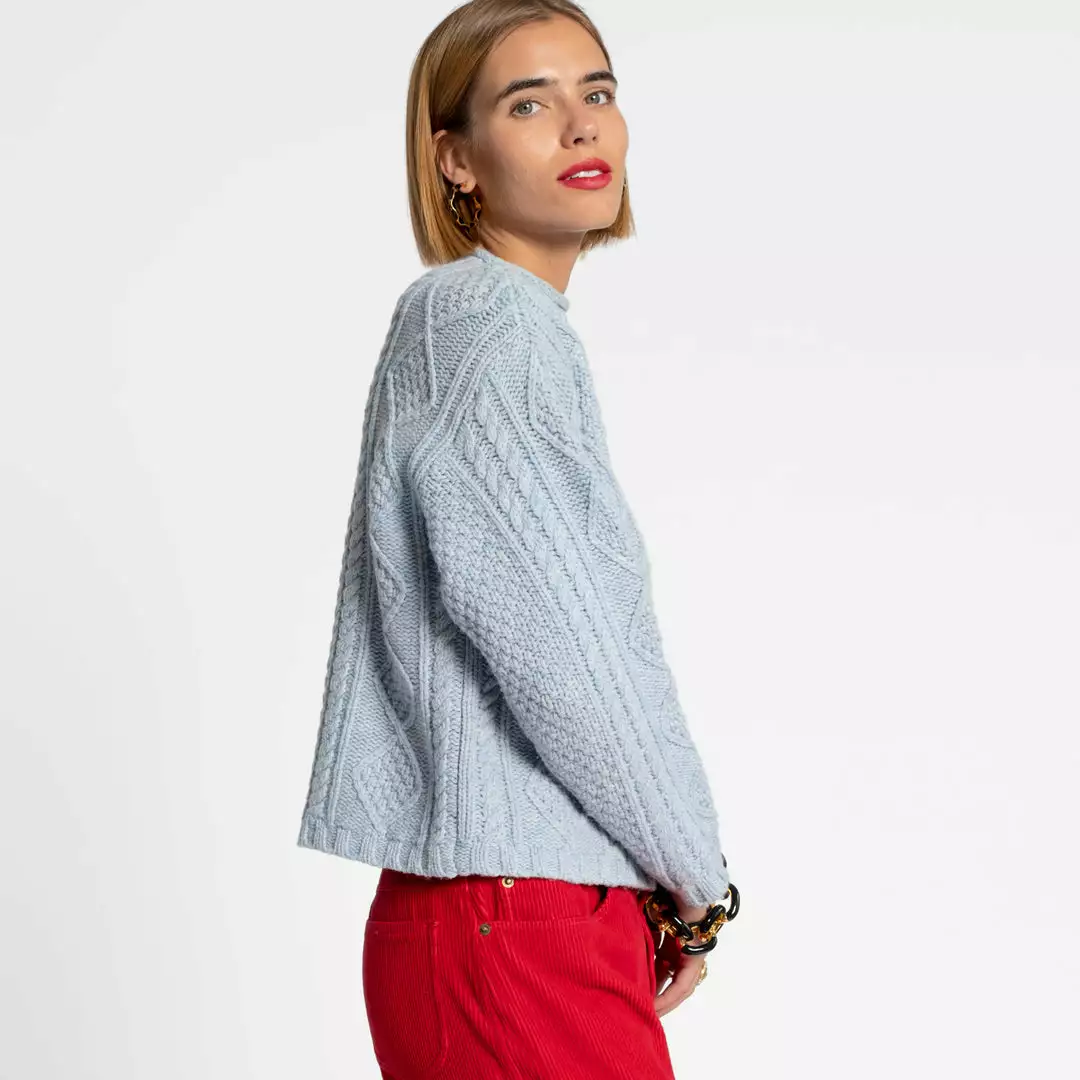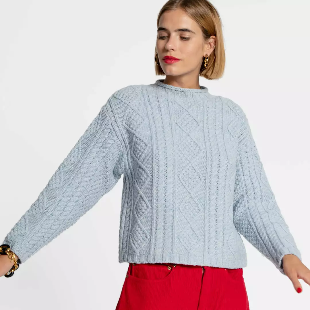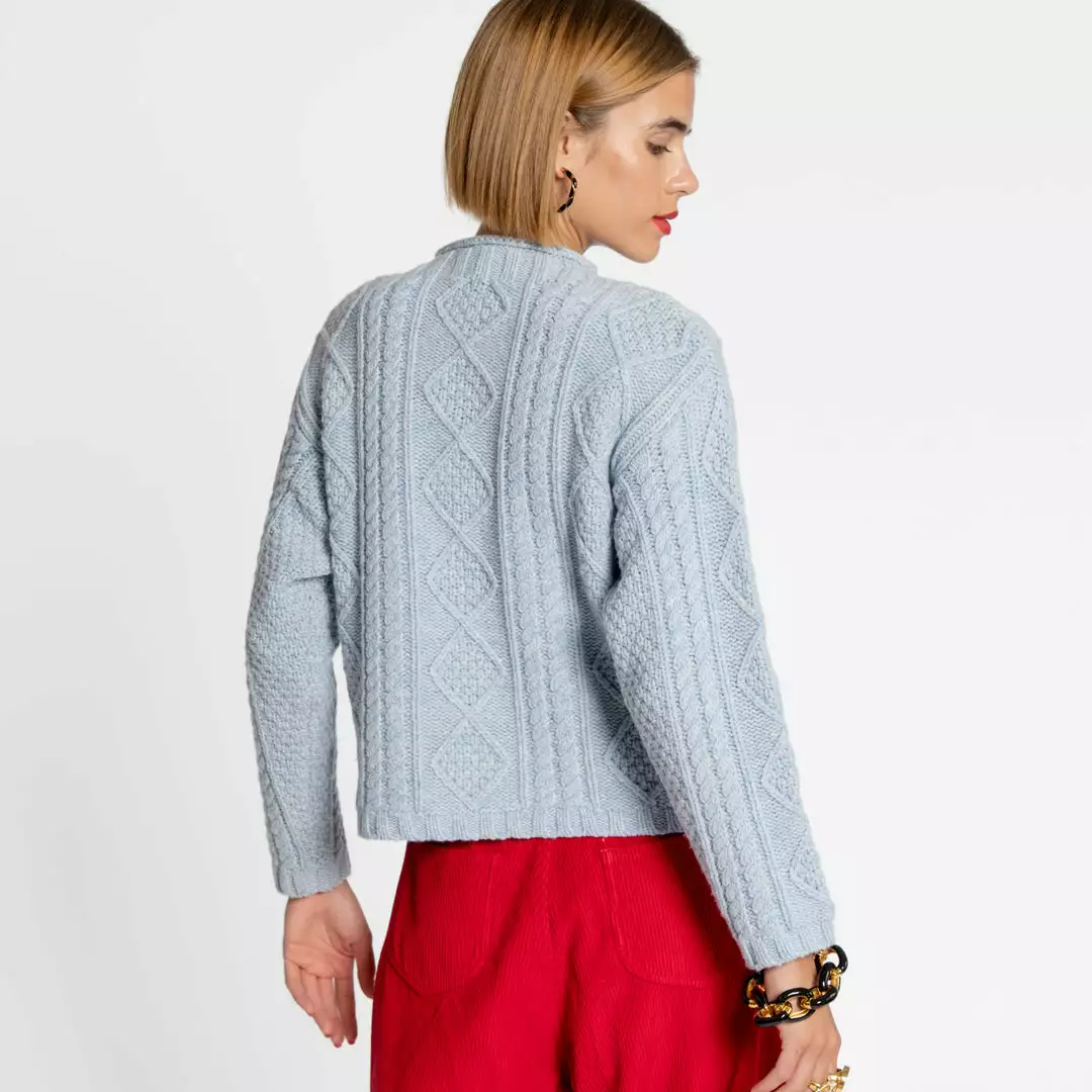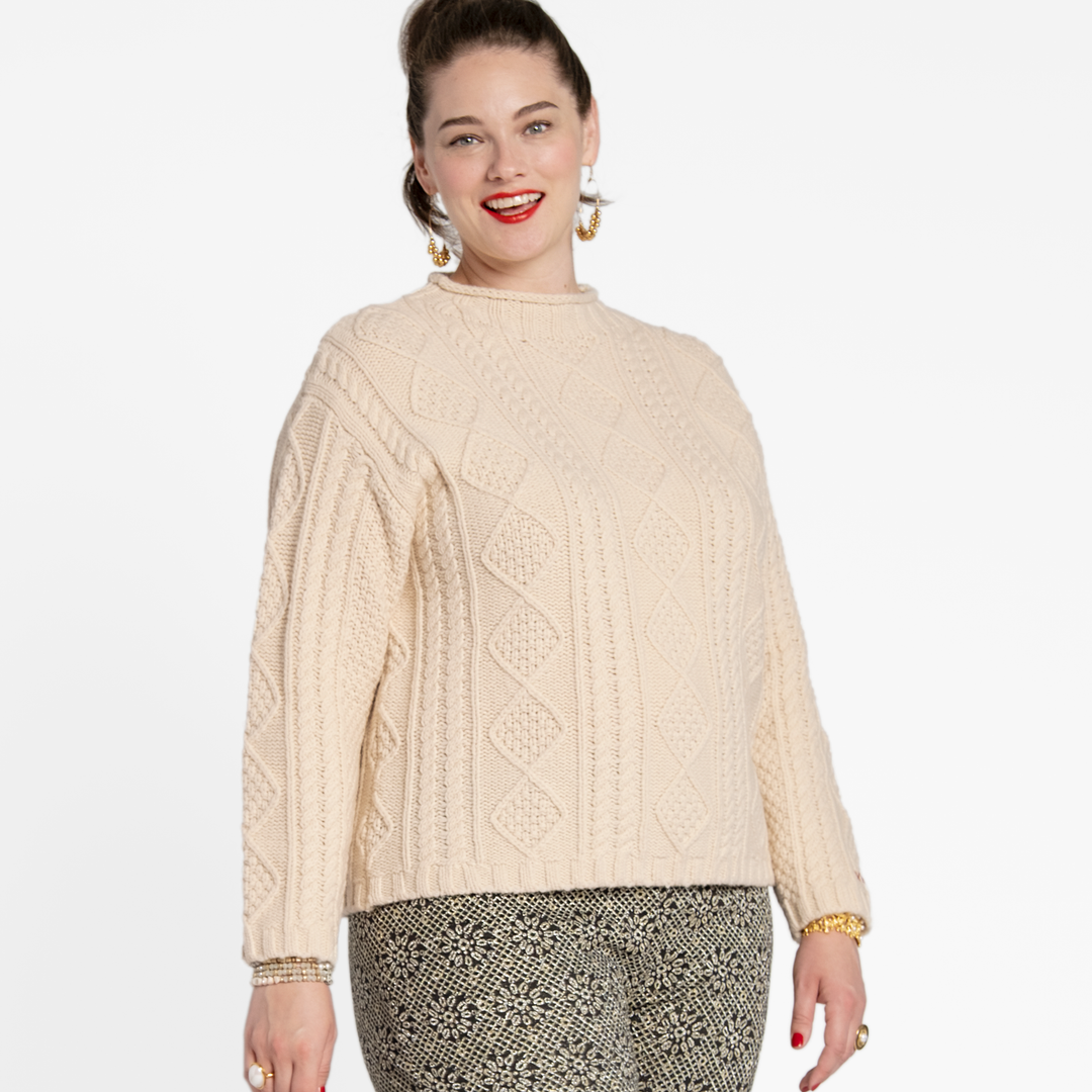 Introducing the Wool Fisherman Skipper Pullover, a classic “Aran” style cable pullover with roll edge collar and drop sleeves. This effortless classic can be worn anywhere and easily styled with your favorite pieces.Â