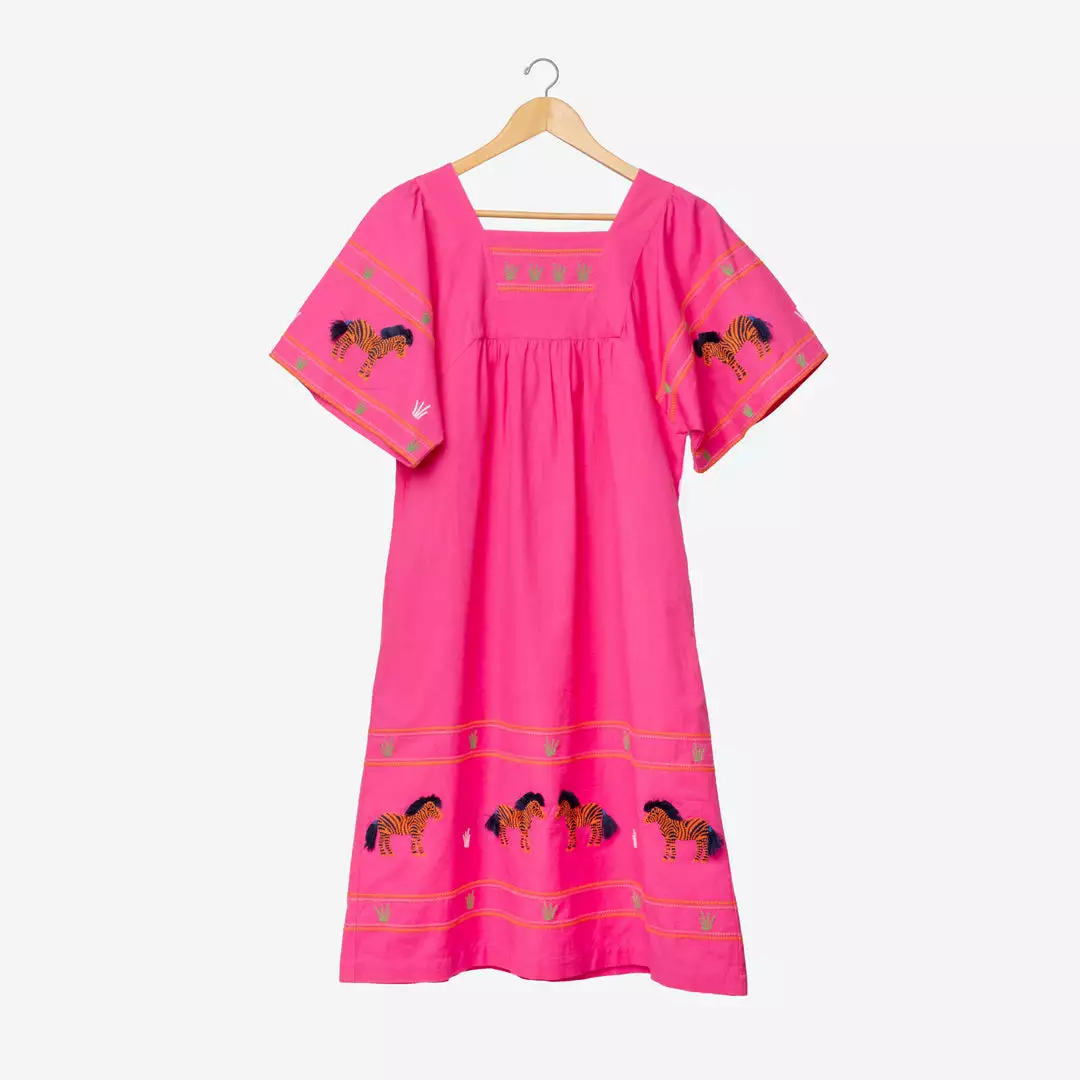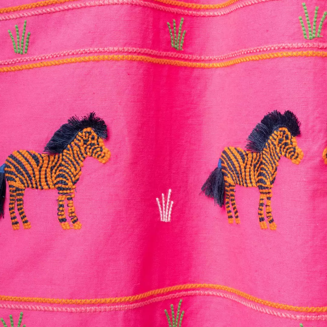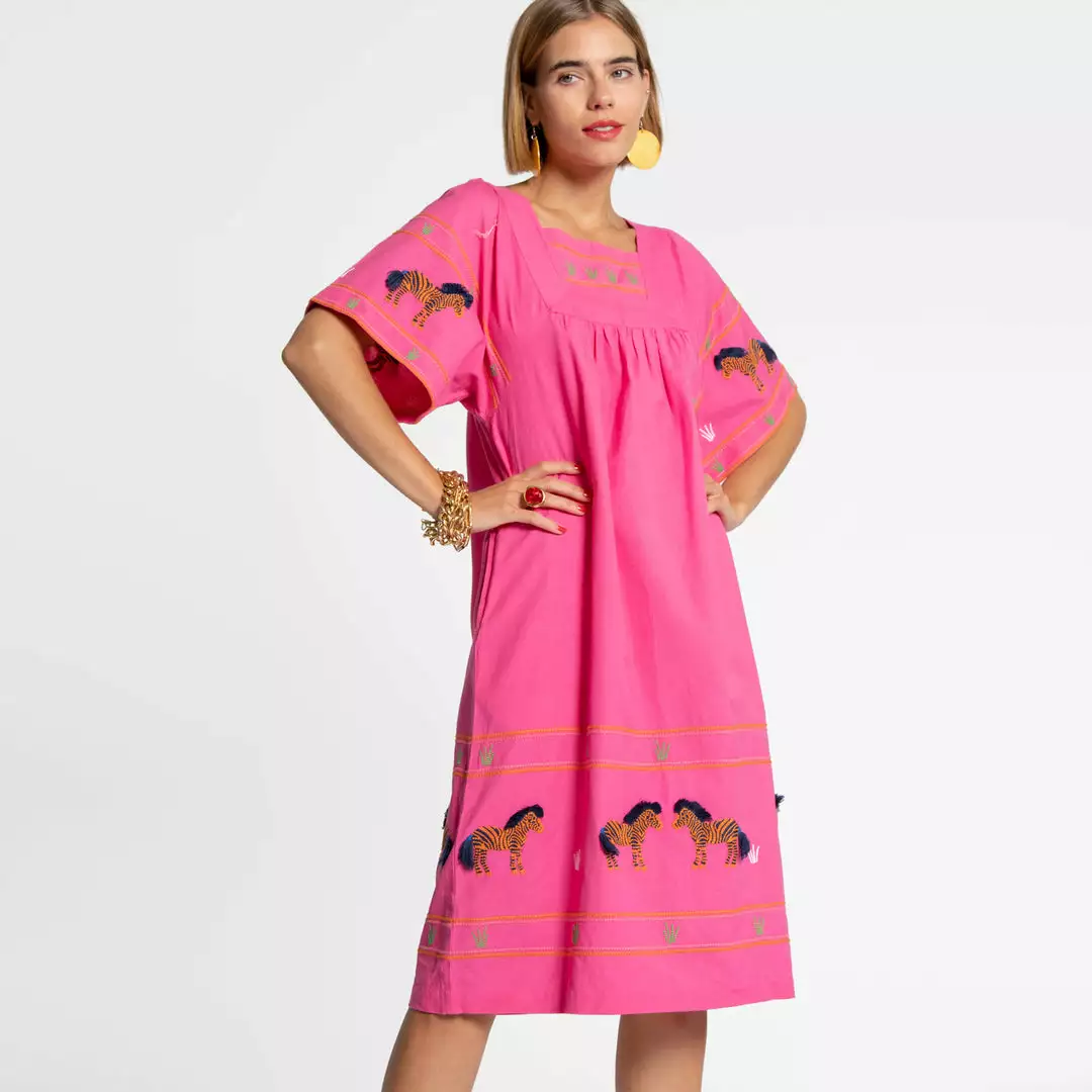 The Zebra Picnic Dress is a breezy must have for all of your sunny days. Colorful zebra embroidery and fringe details add pops of color to this new warm weather staple. Pair with any of our baskets and sandals for a perfect outfit.