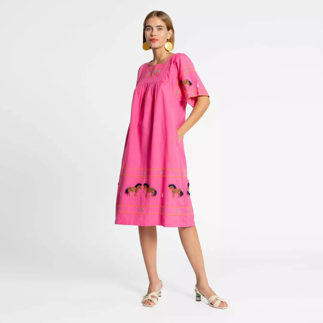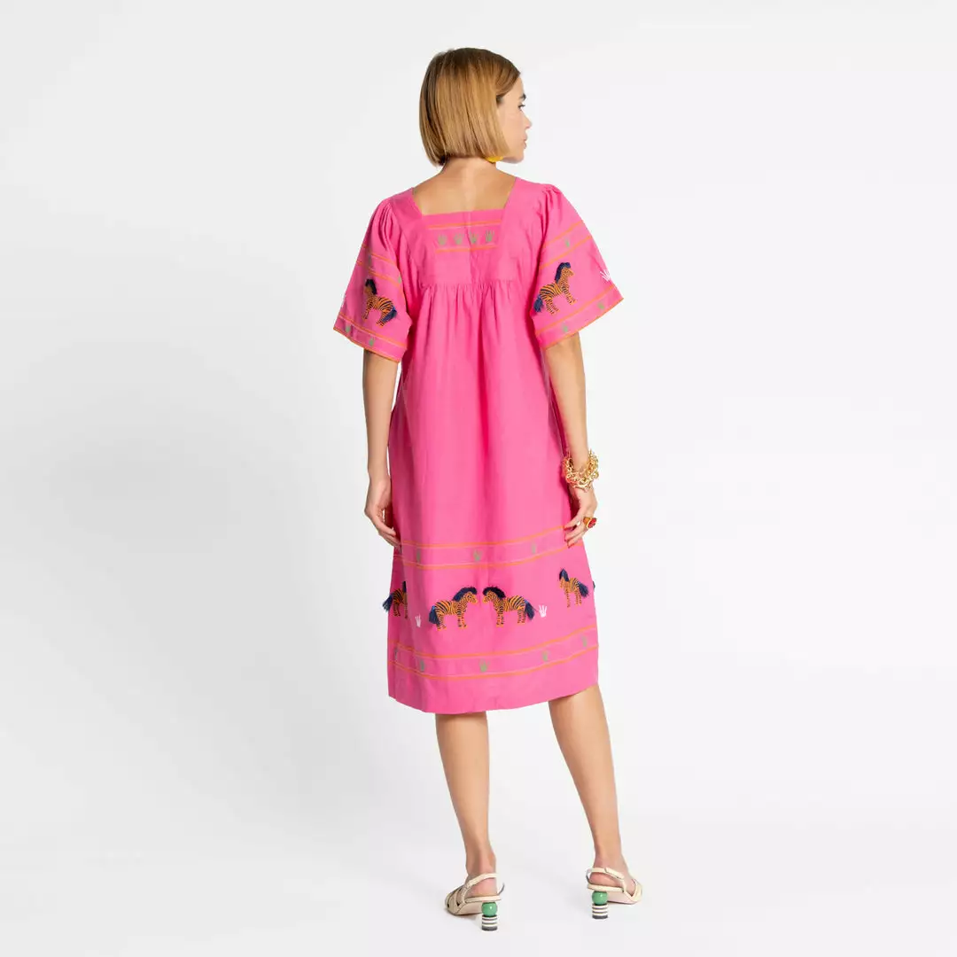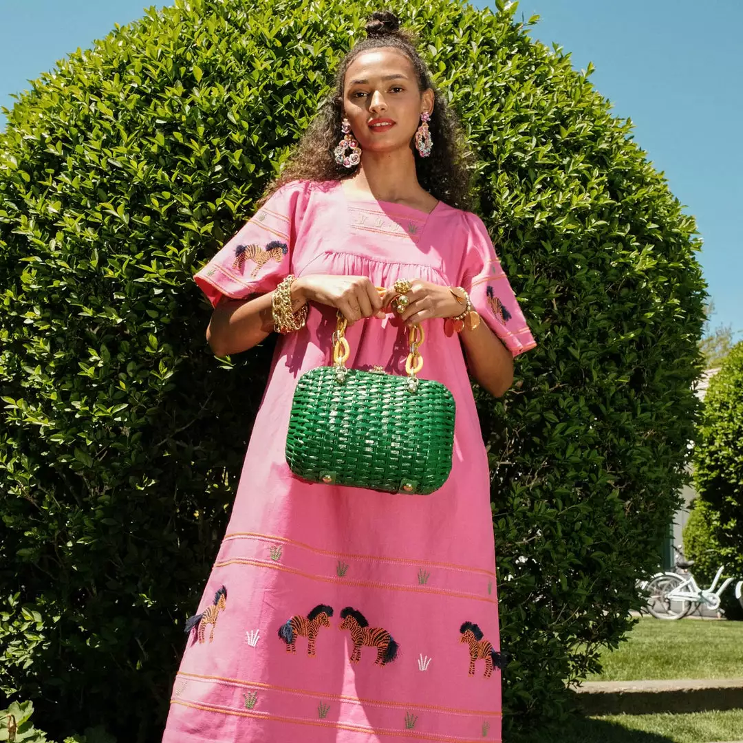 The Zebra Picnic Dress is a breezy must have for all of your sunny days. Colorful zebra embroidery and fringe details add pops of color to this new warm weather staple. Pair with any of our baskets and sandals for a perfect outfit.