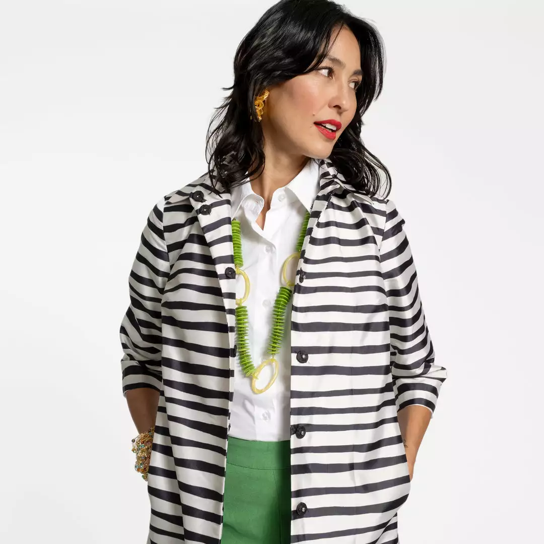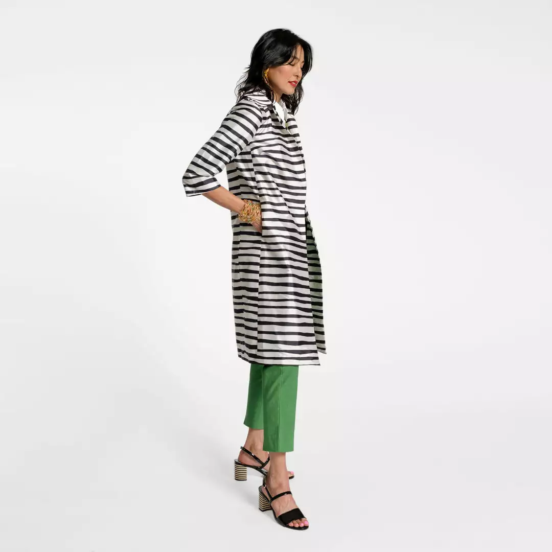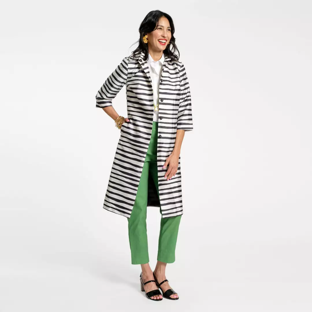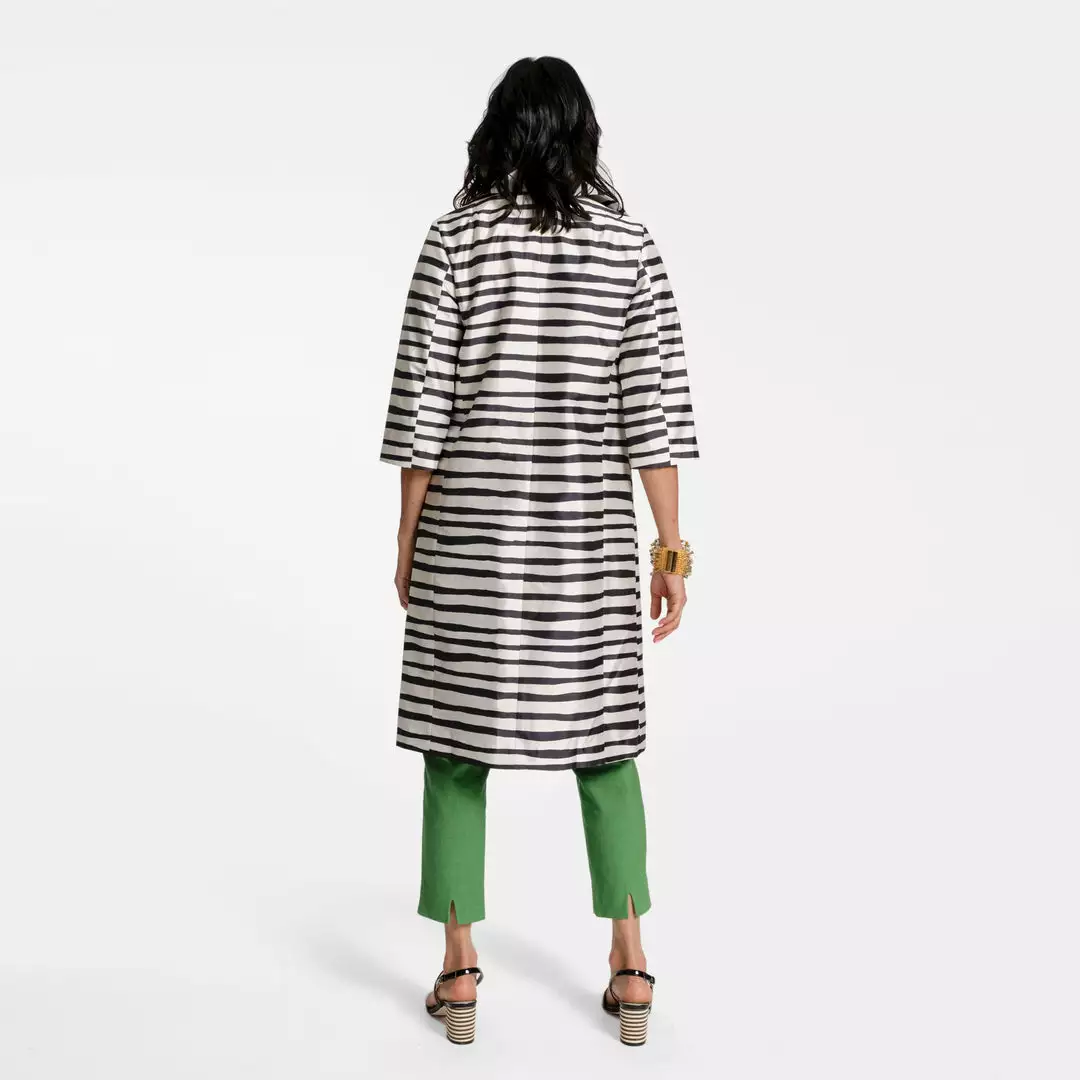 Our Painterly Stripe Balmacaan in striking black and oyster is both bold and lightweight, perfect to wear as an all day statement piece or layered on brisk Spring days.