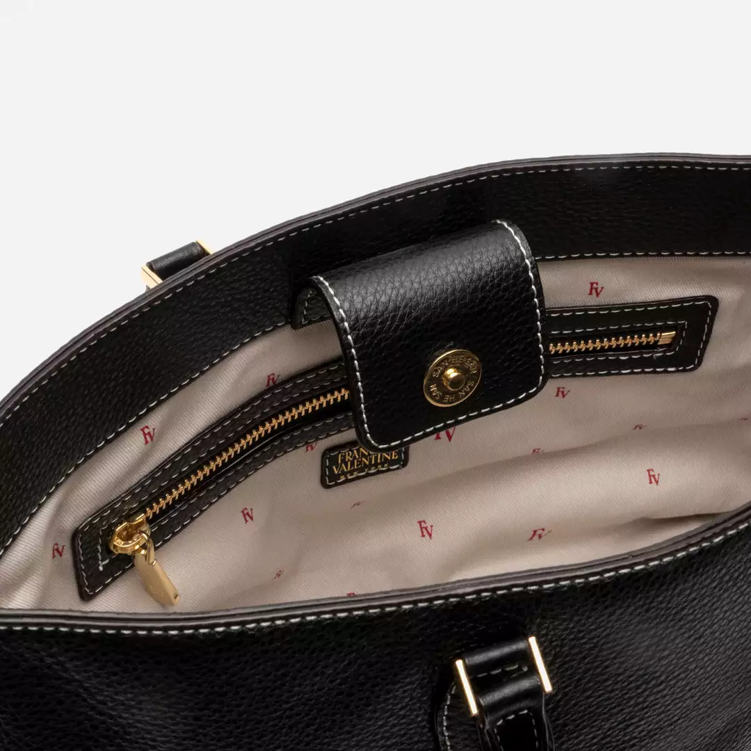 Tumbled leather tote. Magnetic flap closure. FV cotton twill lining. Metal Feet.