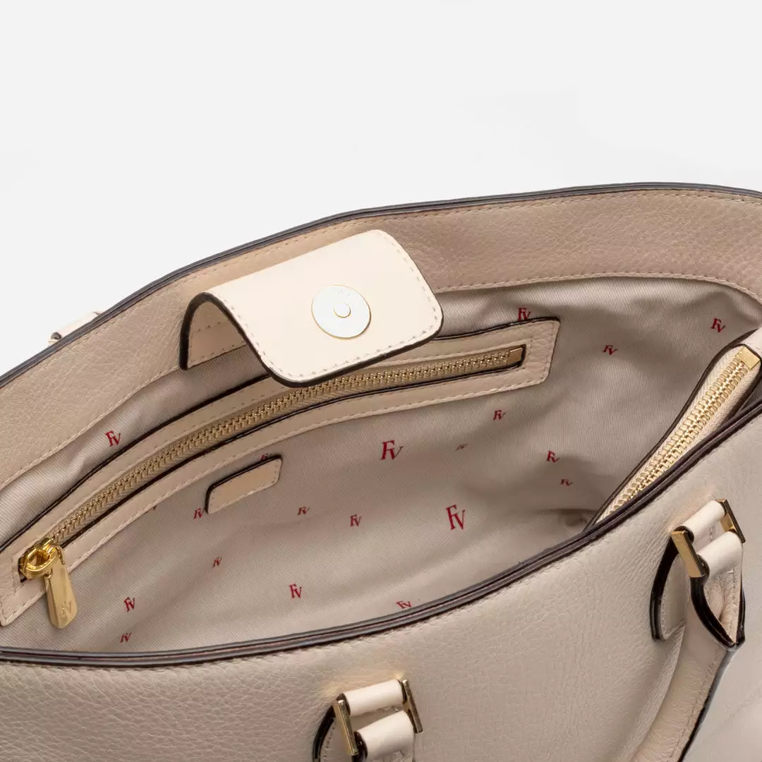 Tumbled leather tote. Magnetic flap closure. FV cotton twill lining. Metal Feet.