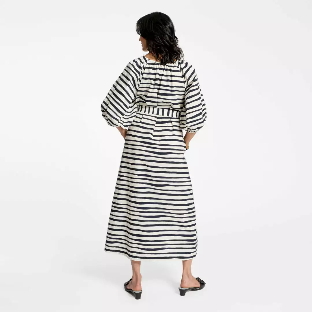 We love to think of a black and white stripe as a neutral that can be dressed up with pops of color in the form of jewelry and accessories. Adding to its versatility, this dress can be worn belted or not.