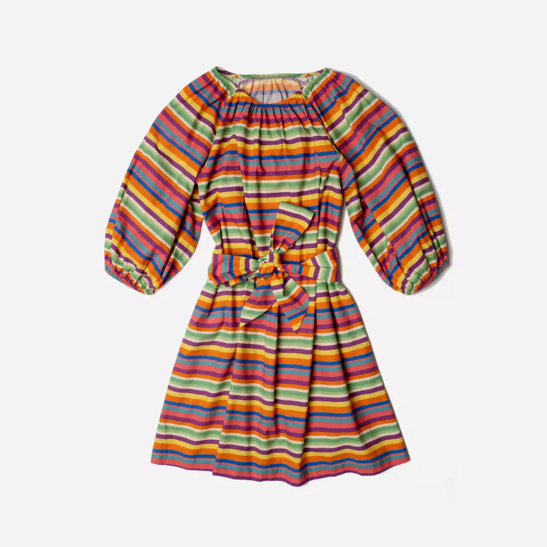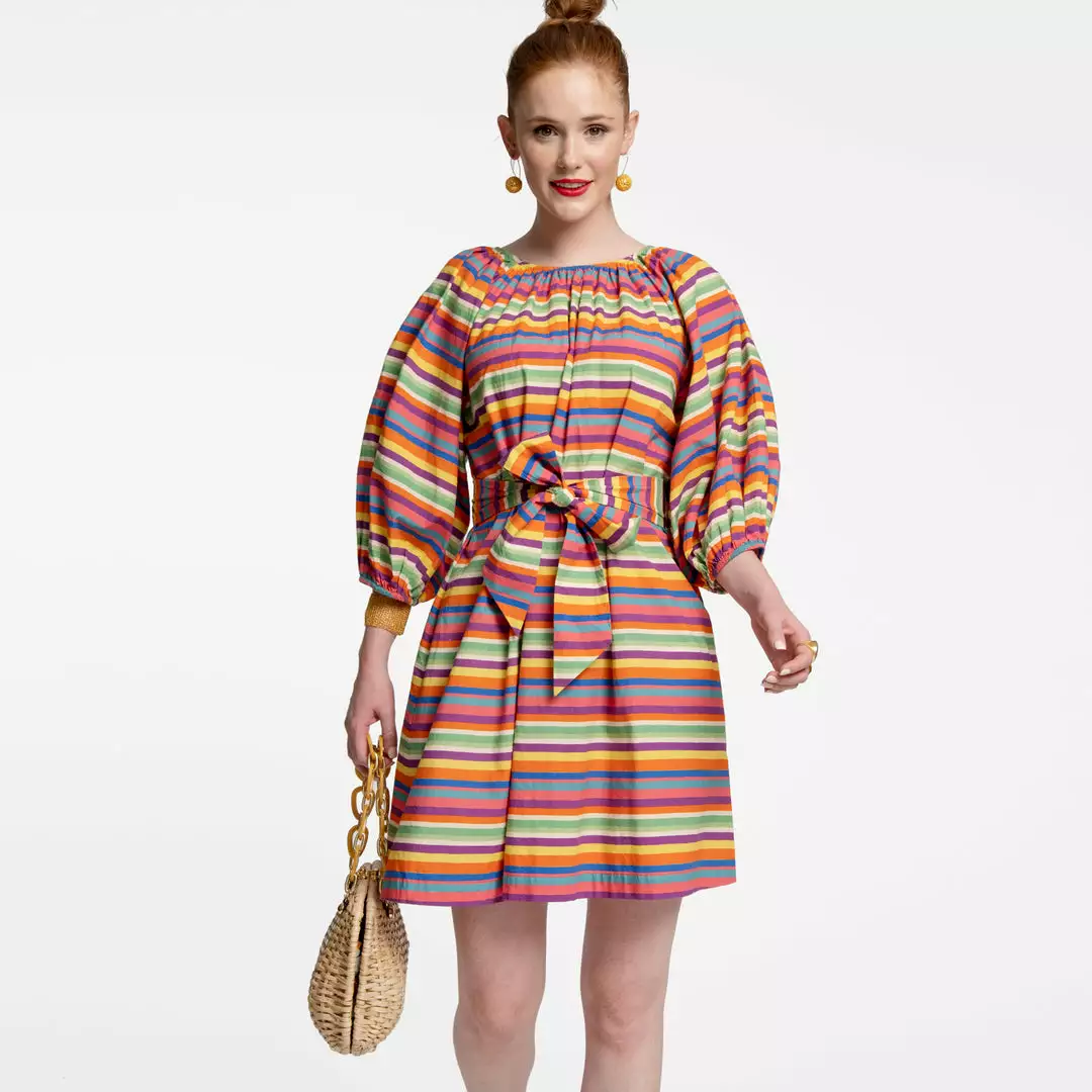 Our Bliss Mini Dress features our Candy Stripe print, which is reminiscent of warm summer days heading into town for ice cream and candy. This mini length dress on cotton poplin can be worn belted or not and has a dramatic balloon sleeve with elastic wrist and neckline.