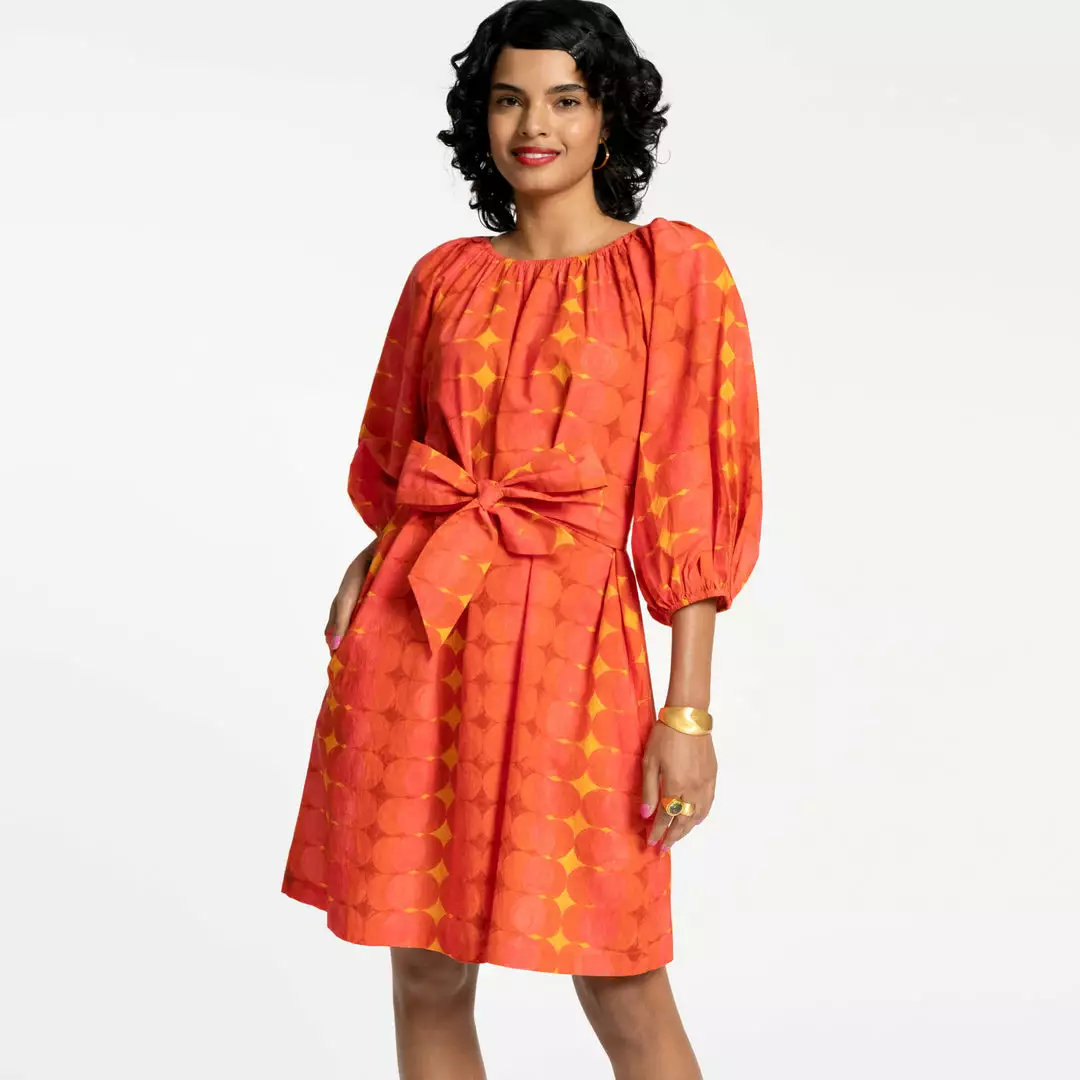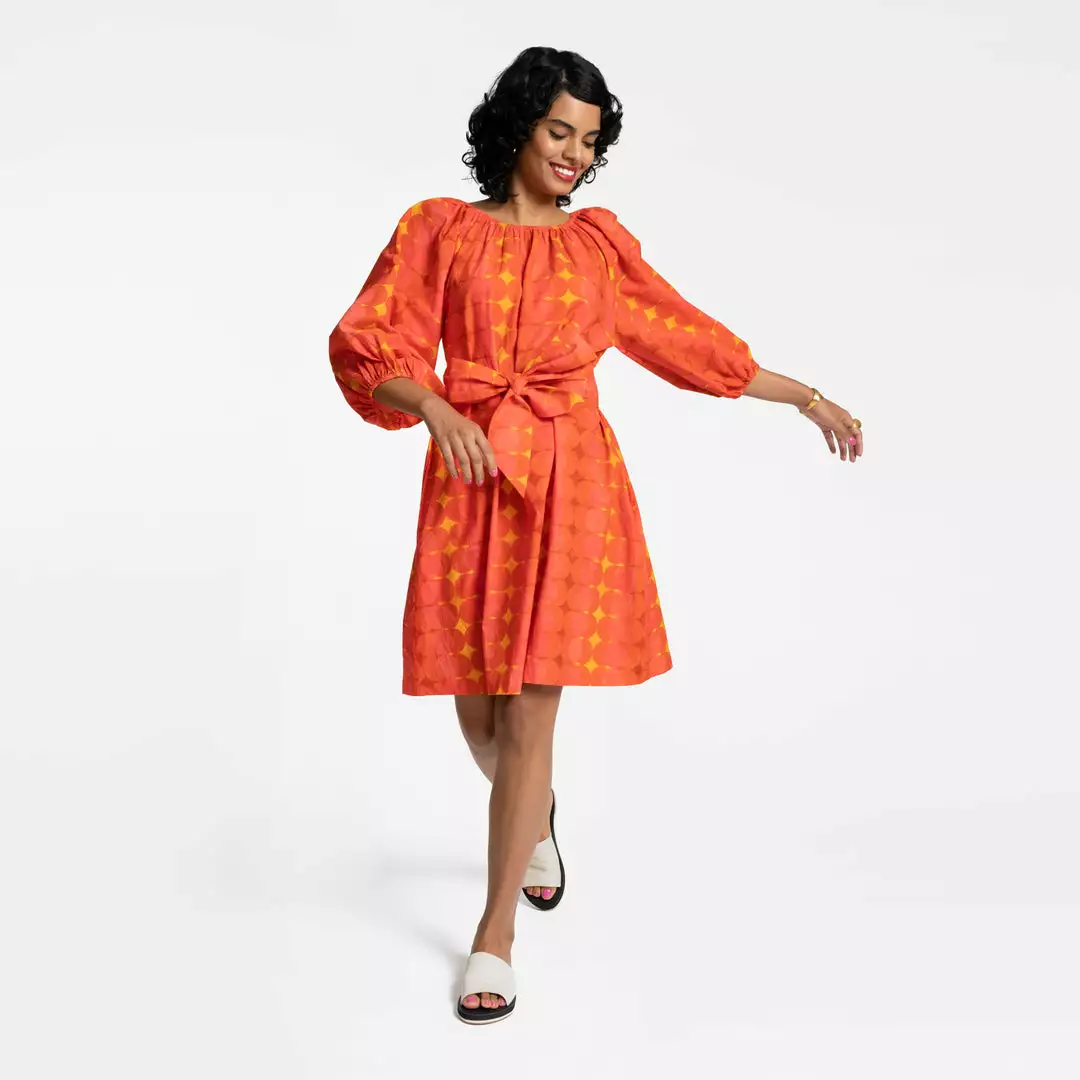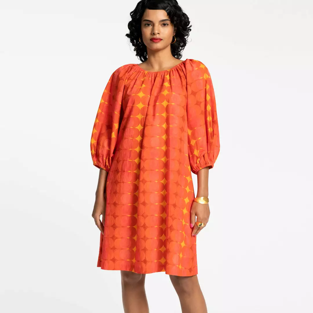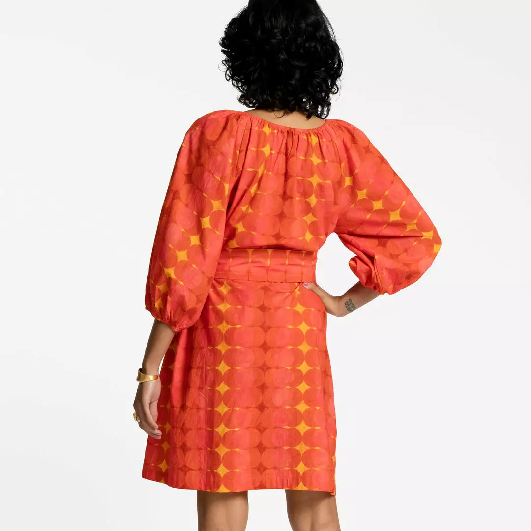 Our Bliss Mini Dress features our new summer circle print, offering the perfect pop of color! This mini length dress on cotton poplin can be worn belted or not and has a dramatic balloon sleeve with elastic wrist and neckline.
