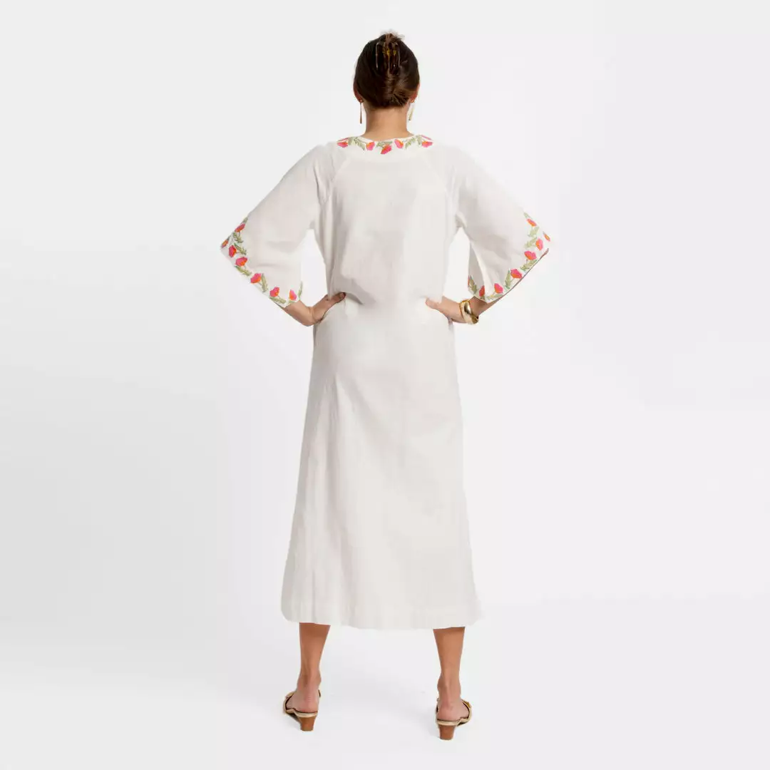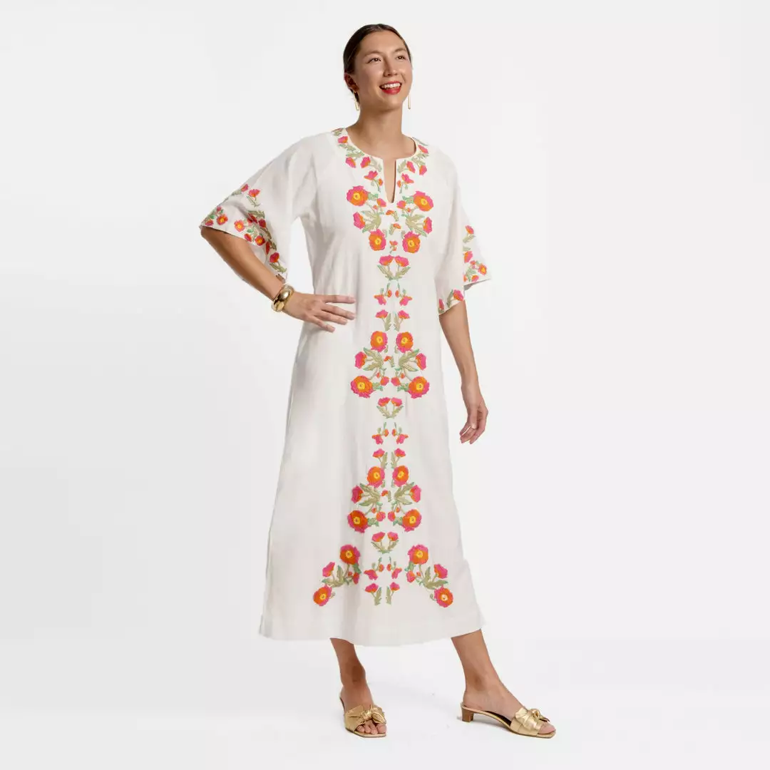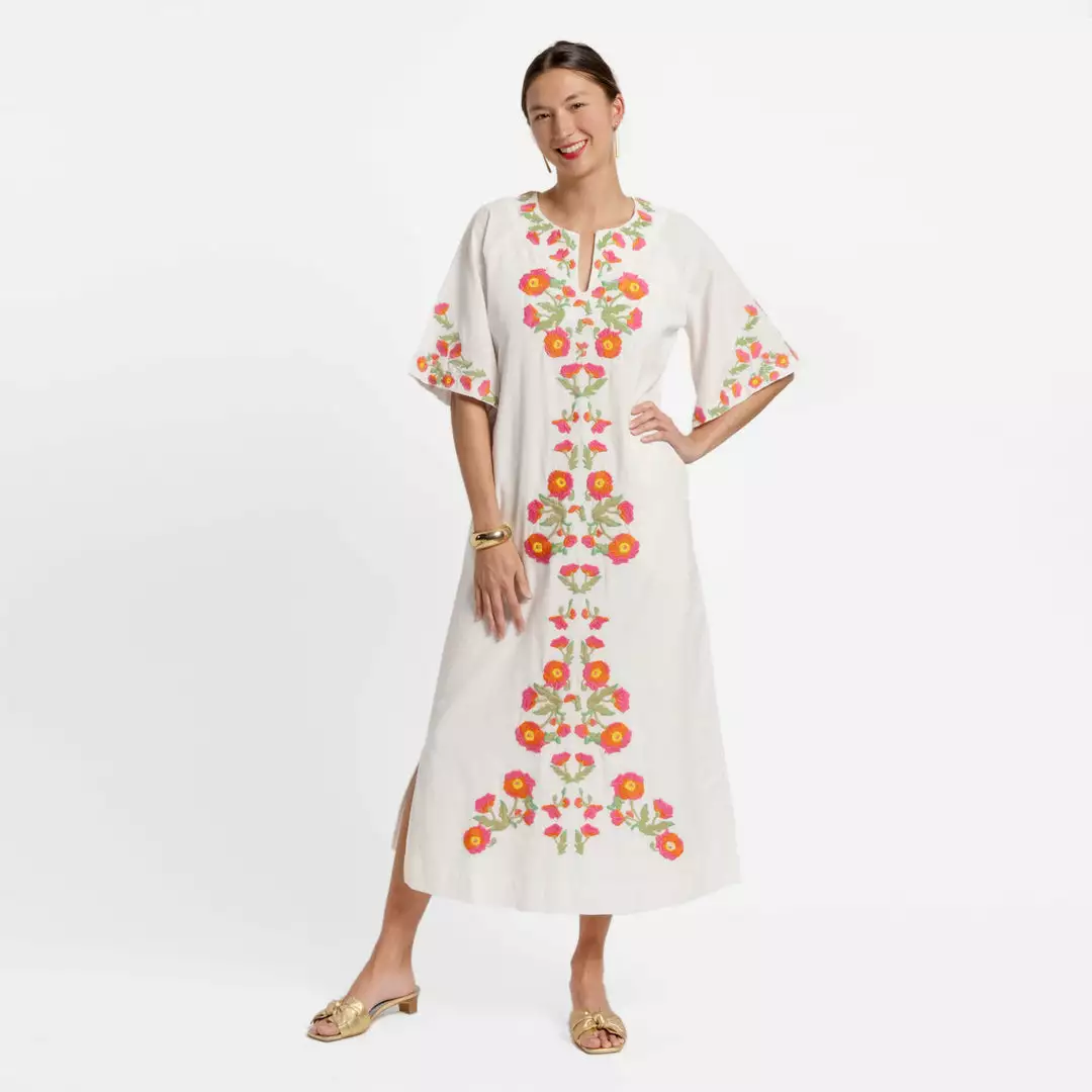 One of our best selling pieces receives a refresh, introducing the Charming Caftan. Featuring custom poppy floral embroidery, this versatile caftan will be a bright spot in your closet.