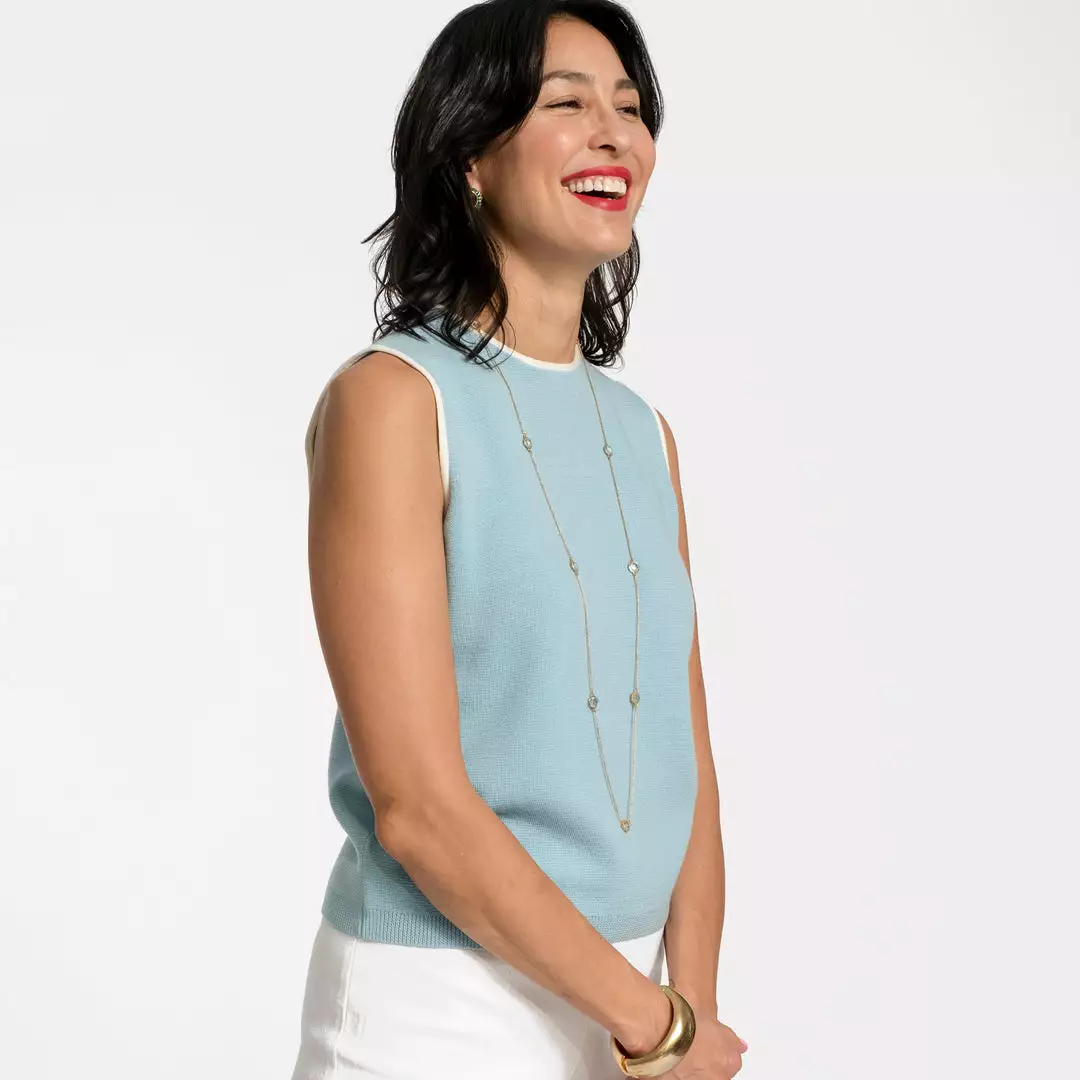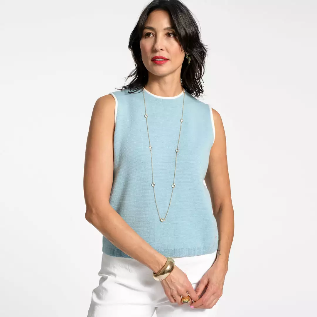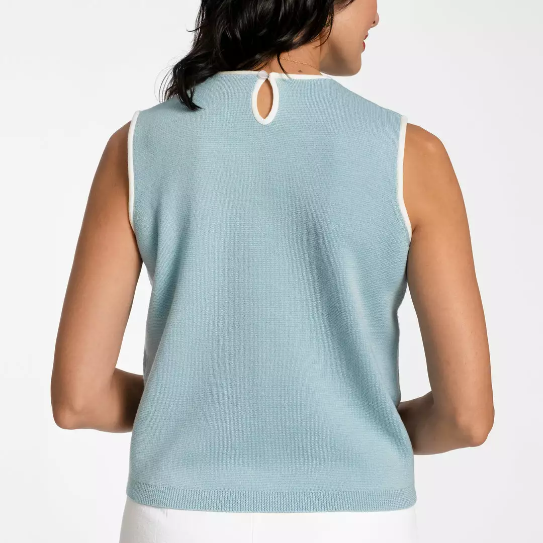 Worn on its own or paired with our matching Darling Cardigan, our Darling Shell in light blue merino with contrast oyster piping detail is simply perfect.