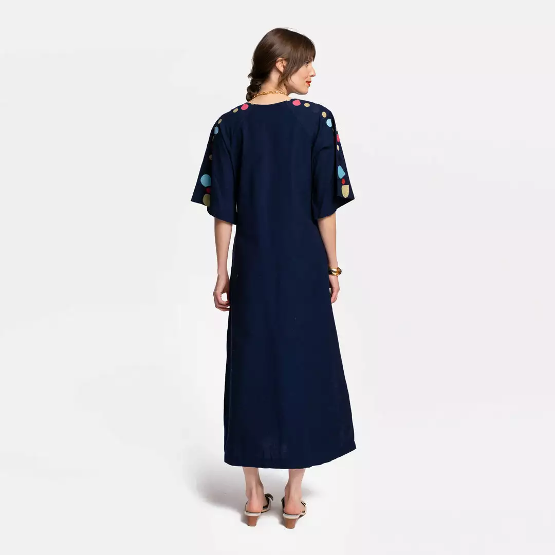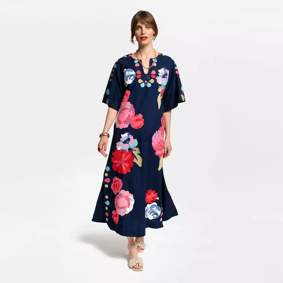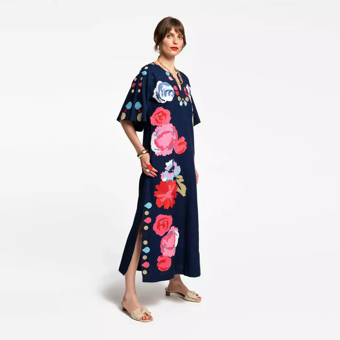 Our new Delight Caftan is a medium weight caftan perfectly adorned with embroidered Peonies throughout the bodice. This is an update of our bestselling Peacock caftan, perfect for a chilly summer evening or a temperate garden party!Â