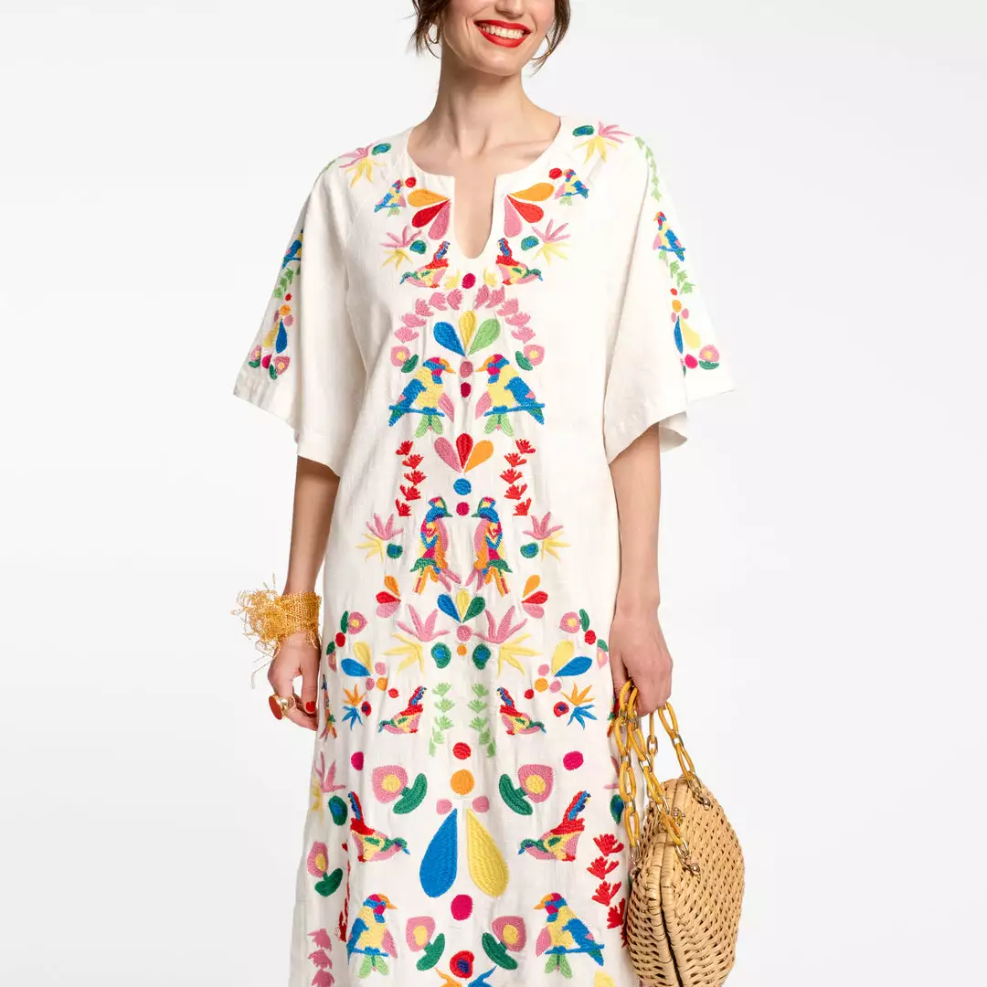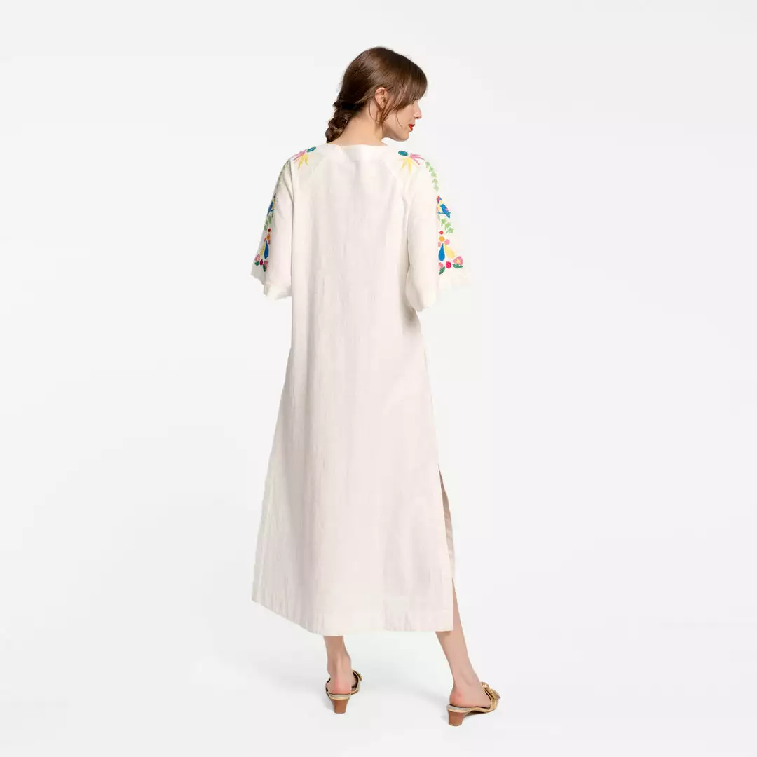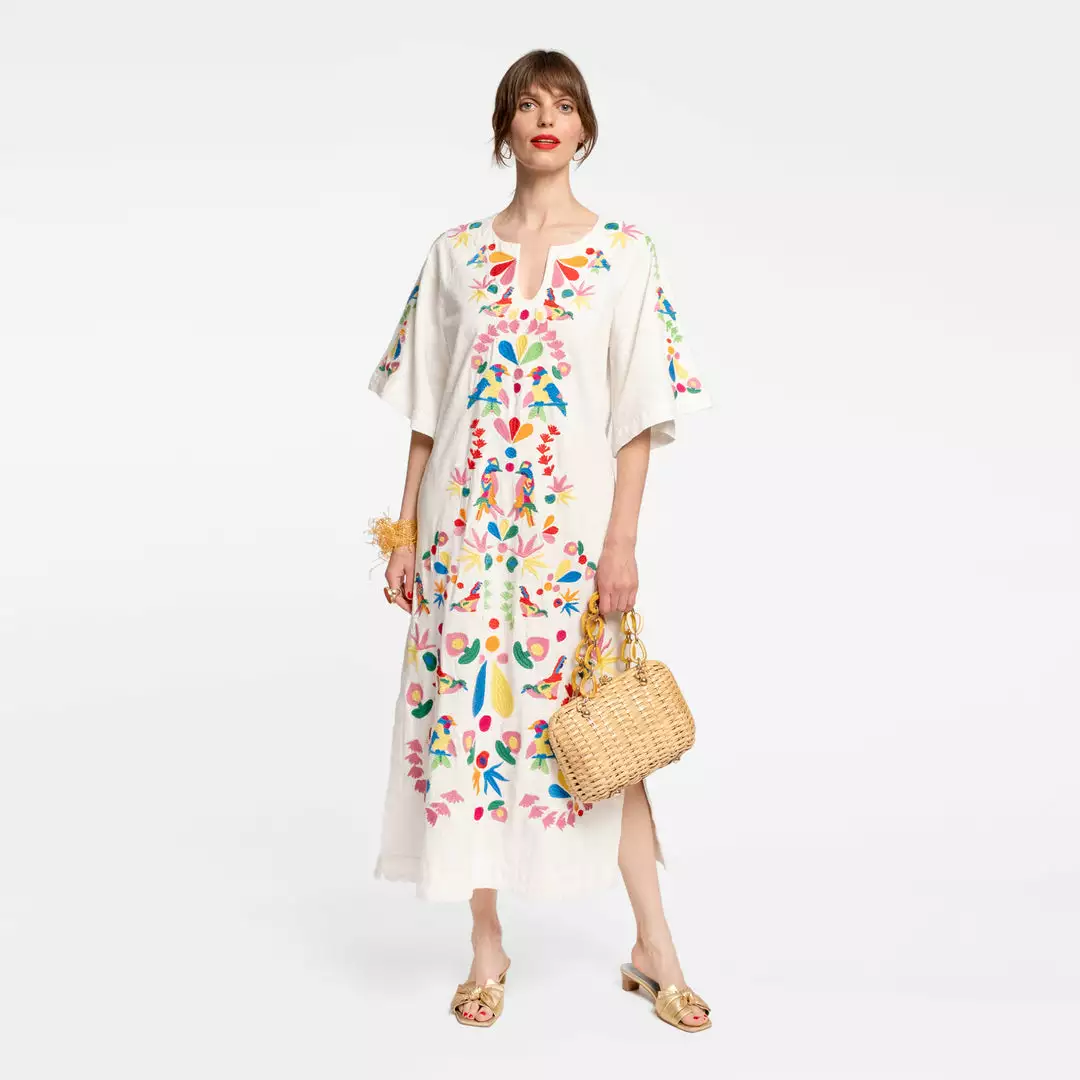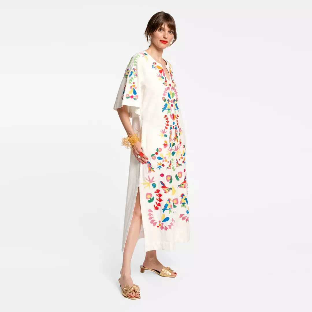 Our new Dreamy Caftan features bold colorful Bird is the Word embroidery on an oyster cotton linen base. This caftan silhouette features our signature maxi length with slits on each side providing both comfort and style.