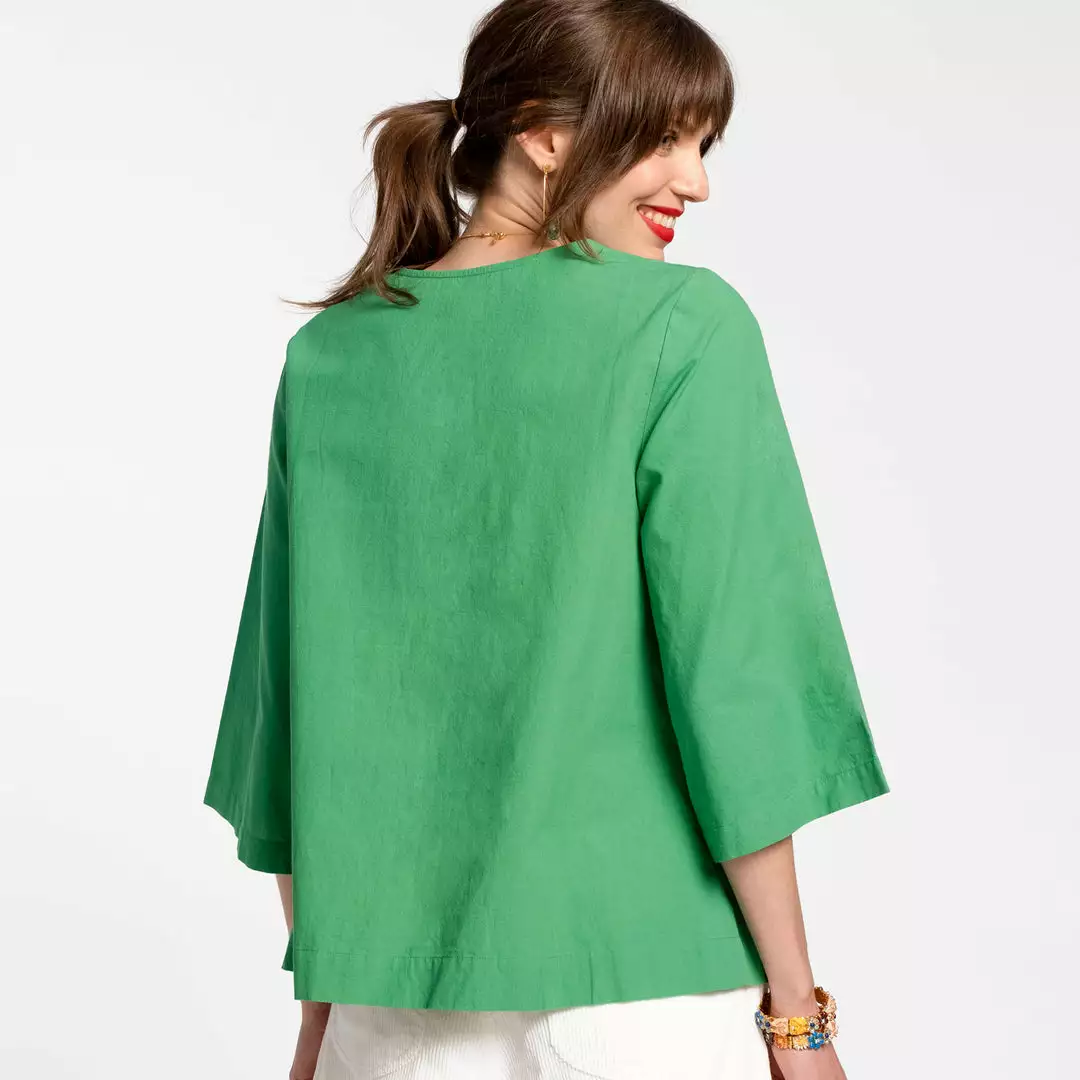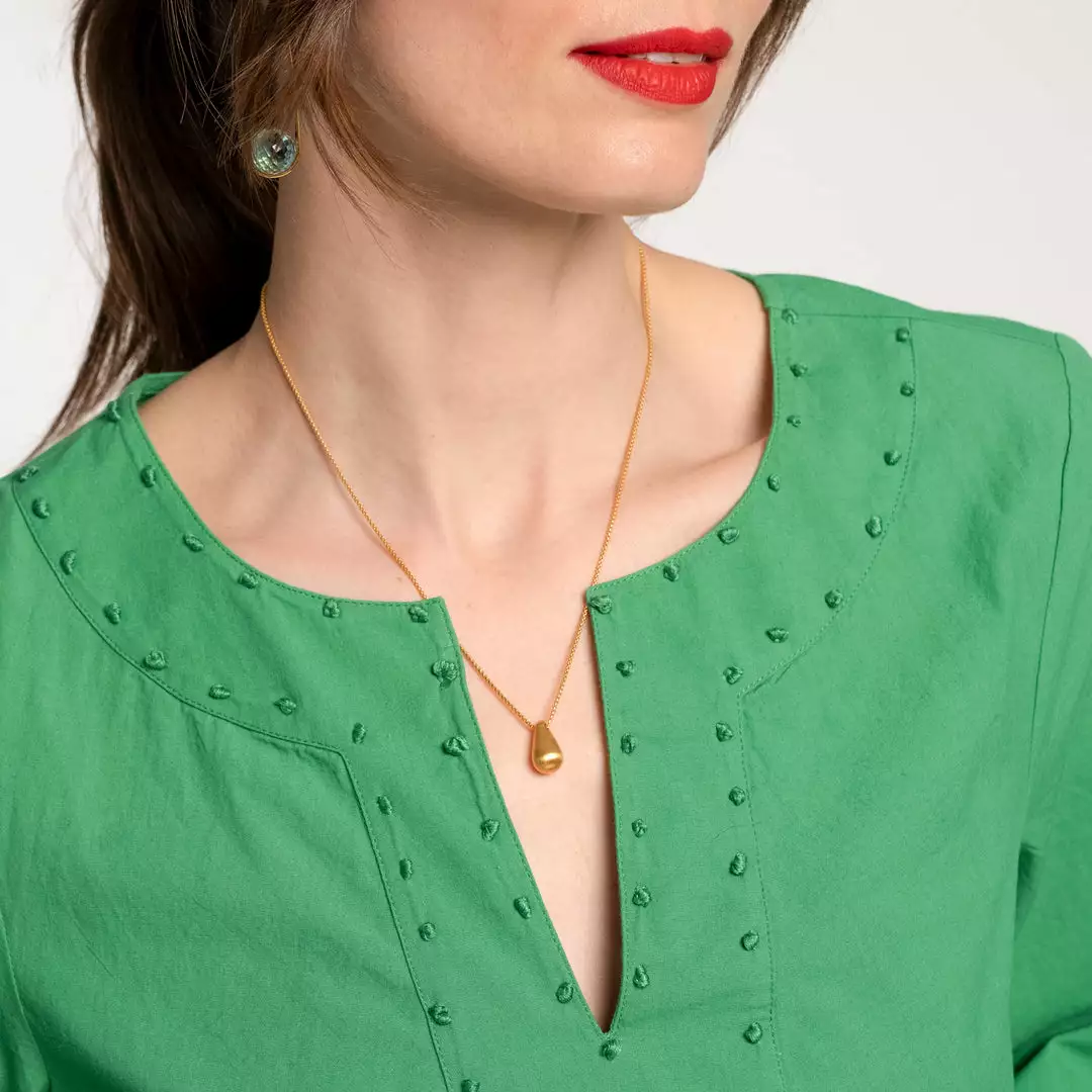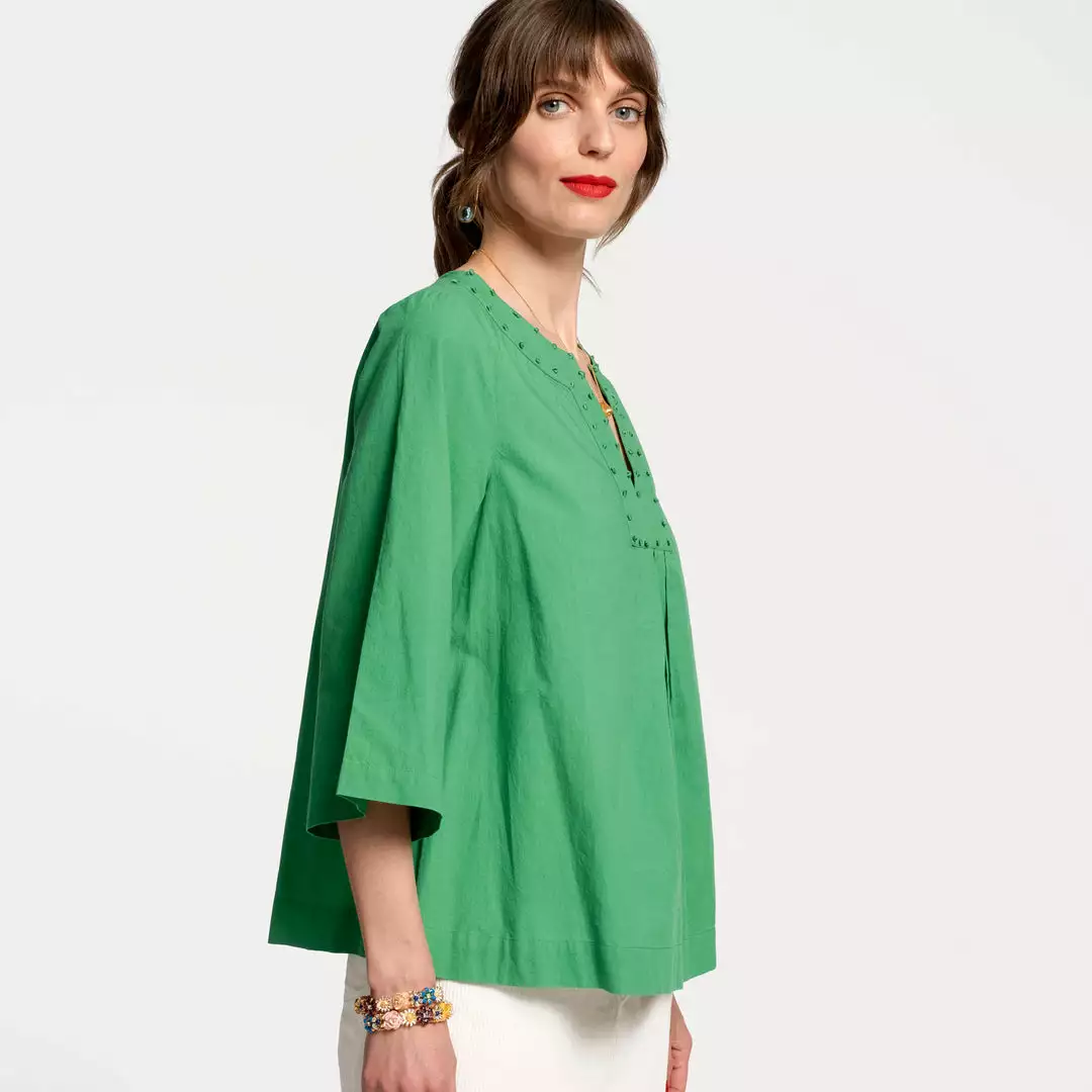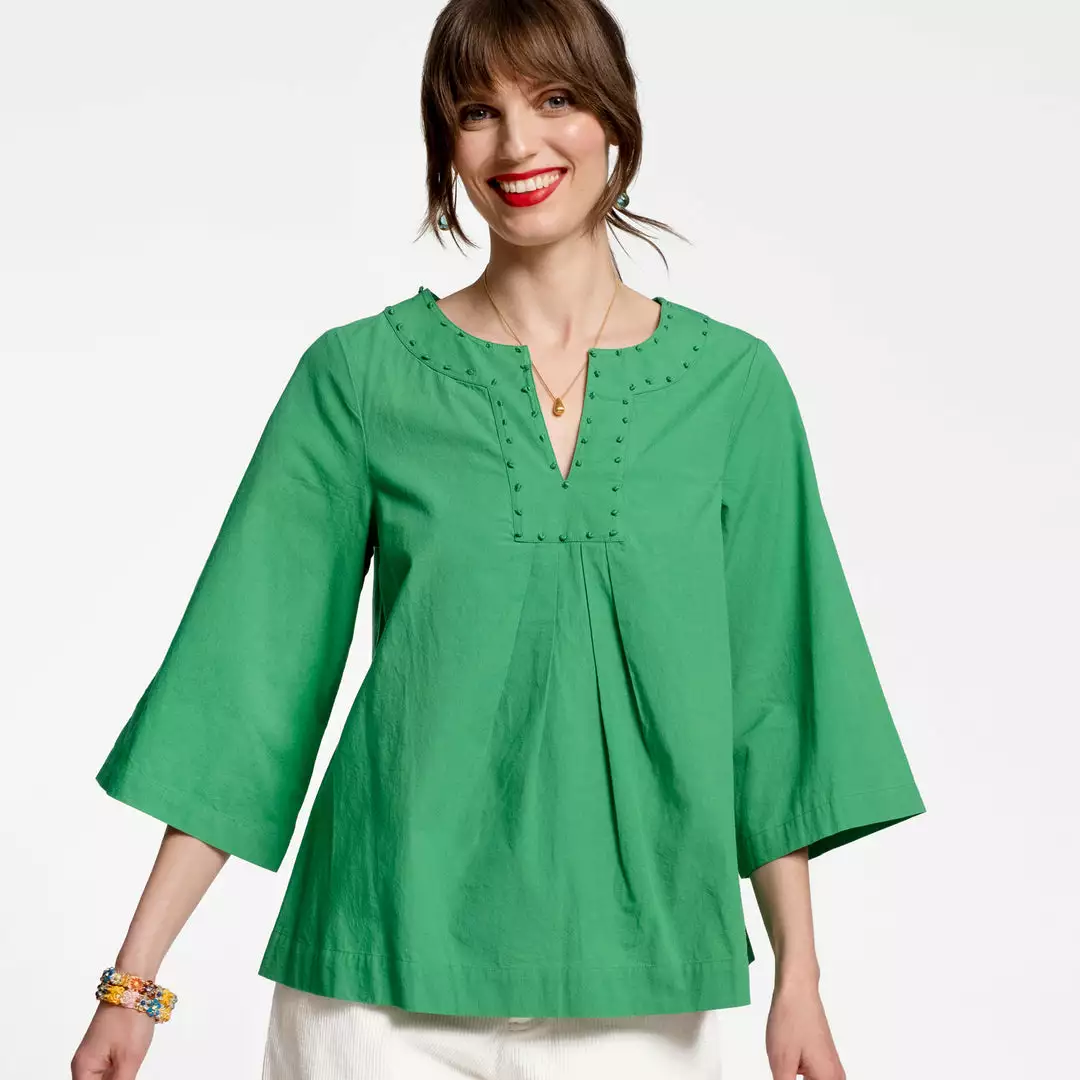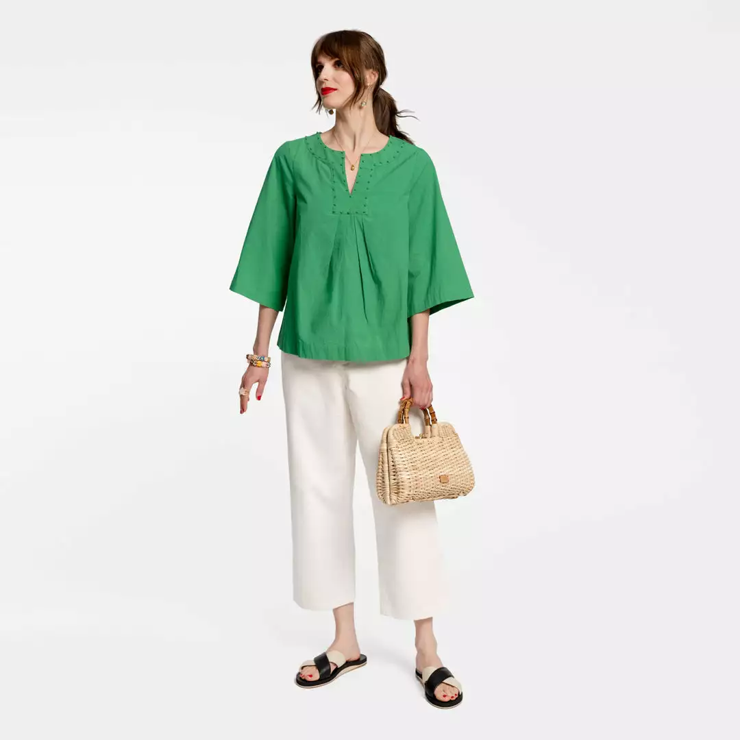 You cannot go wrong with our solid cotton poplin Easy Top, featuring a comfy silhouette that can be worn for any occasion, depending upon how you accessorize it. We adorned the neckline with tiny pompoms, for that little touch of fun. Pair with a statement making necklace and any of our new colorful pants for the perfect outfit.