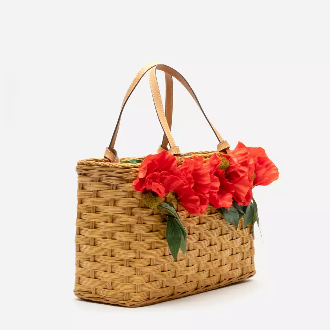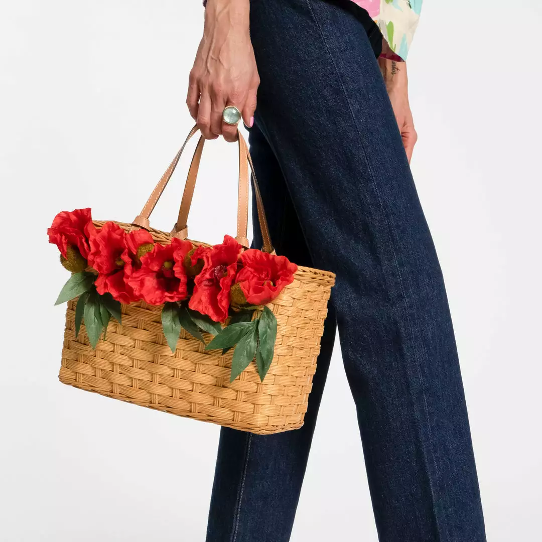 Reintroducing a Frances Valentine original, the Edie Basket. This open top wicker basket with red poppy embellished flowers is your new quintessential warm weather bag.