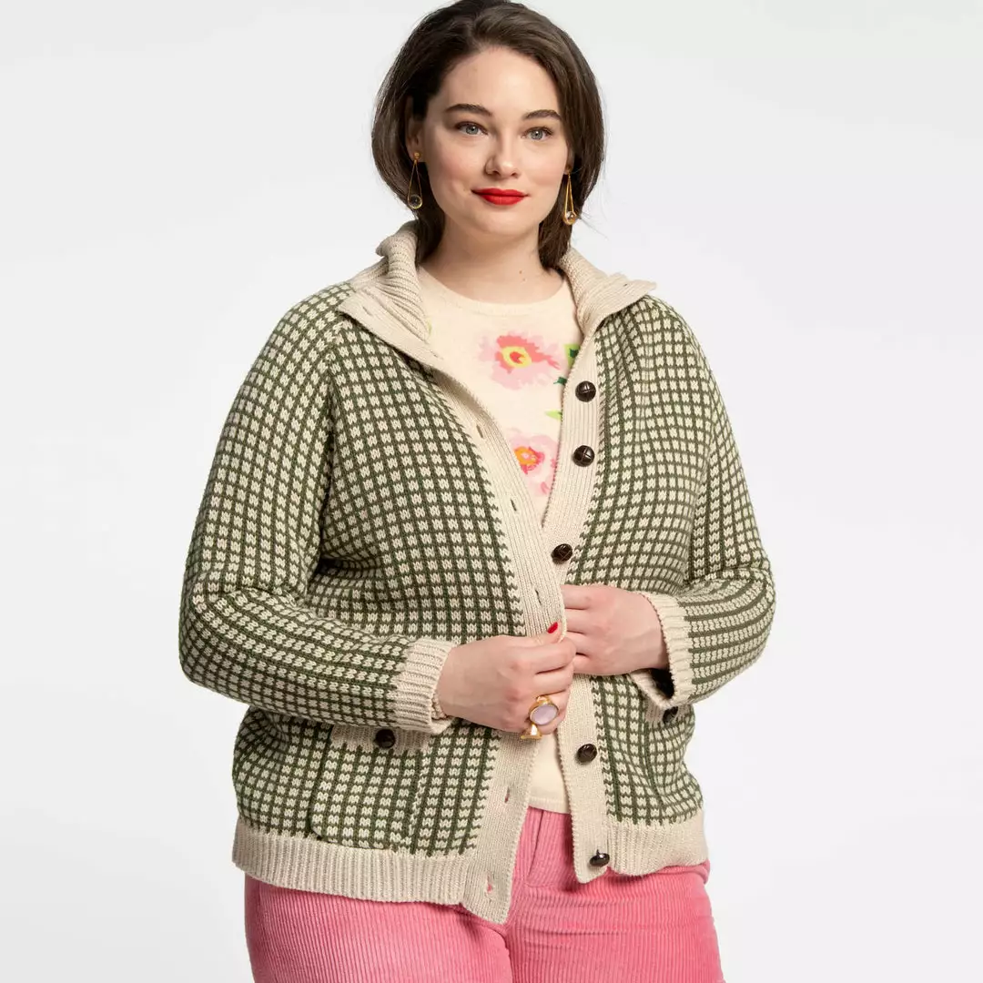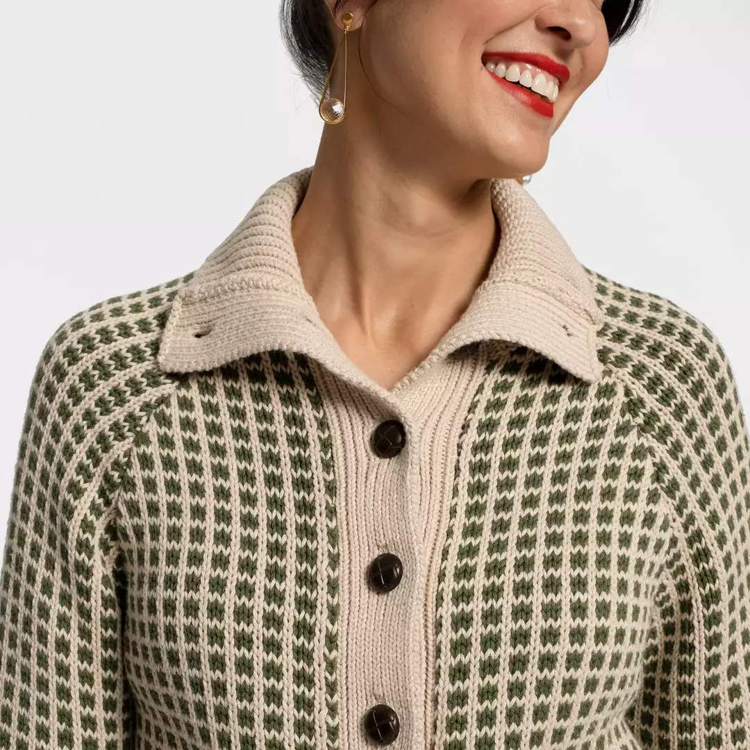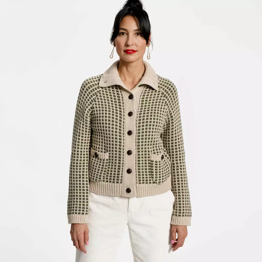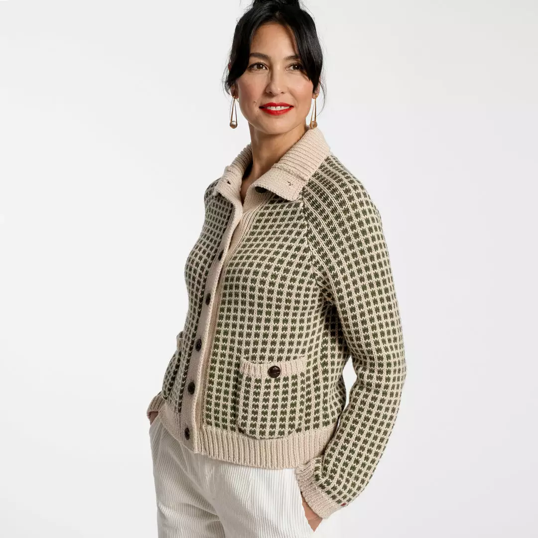 Based on our favorite fisherman cardigan silhouette, the Archie Cardigan features a handmade gauge knit with small window pane pattern in green and oyster. Added to any look it becomes the perfect layering piece, we are sure this will be the sweater you reach for every day.Â