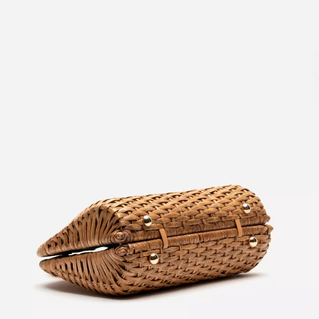 Hand woven painted wicker. Wooden bamboo handle. Metal ball & pin closure. Floral cotton twill lining. Interior zippered pocket. Metal feet.