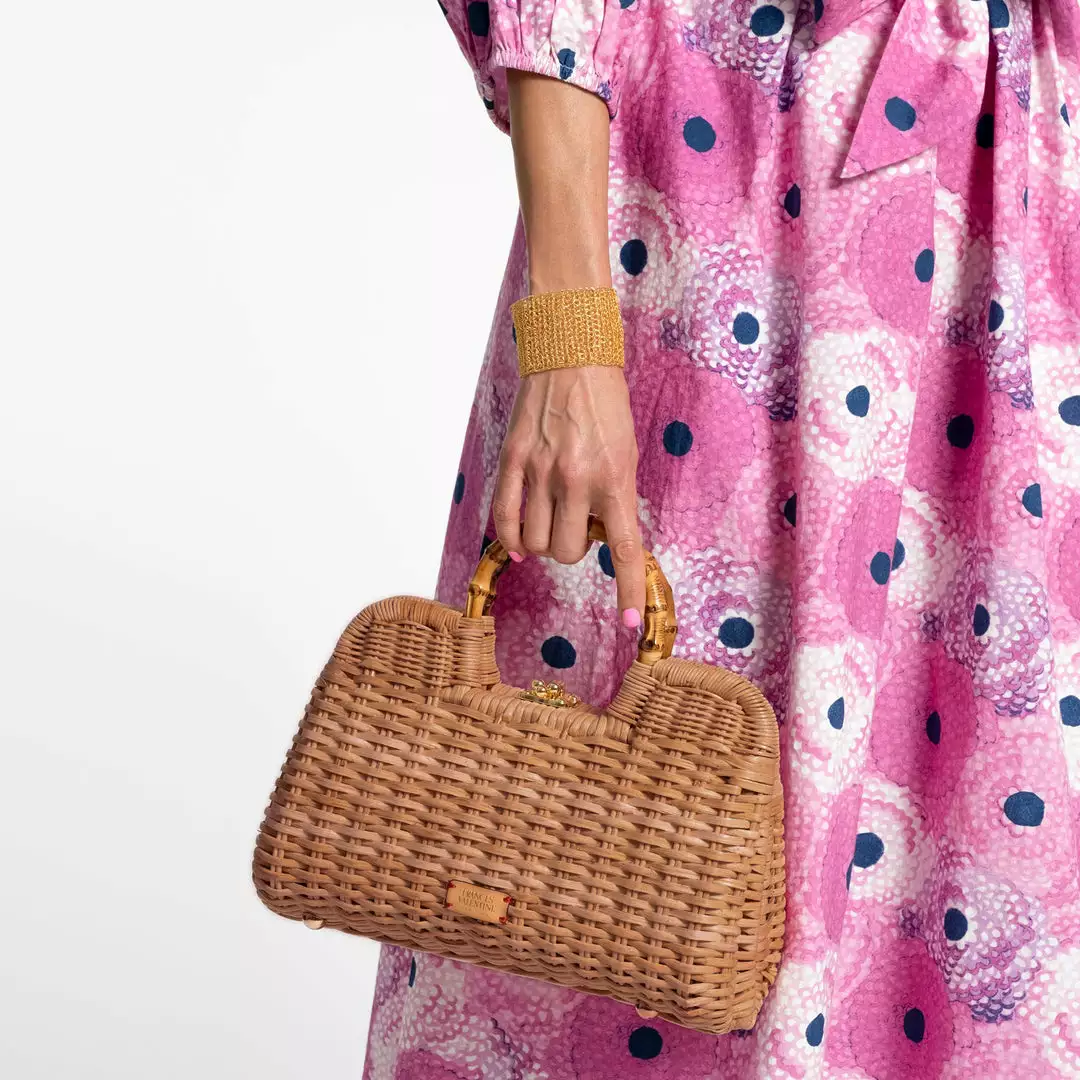Our latest basket, Buzzy, is sure to be your new favorite bag. This top handle wicker bag fits all your essentials and features a cheerful cotton floral lining – a detail we love!