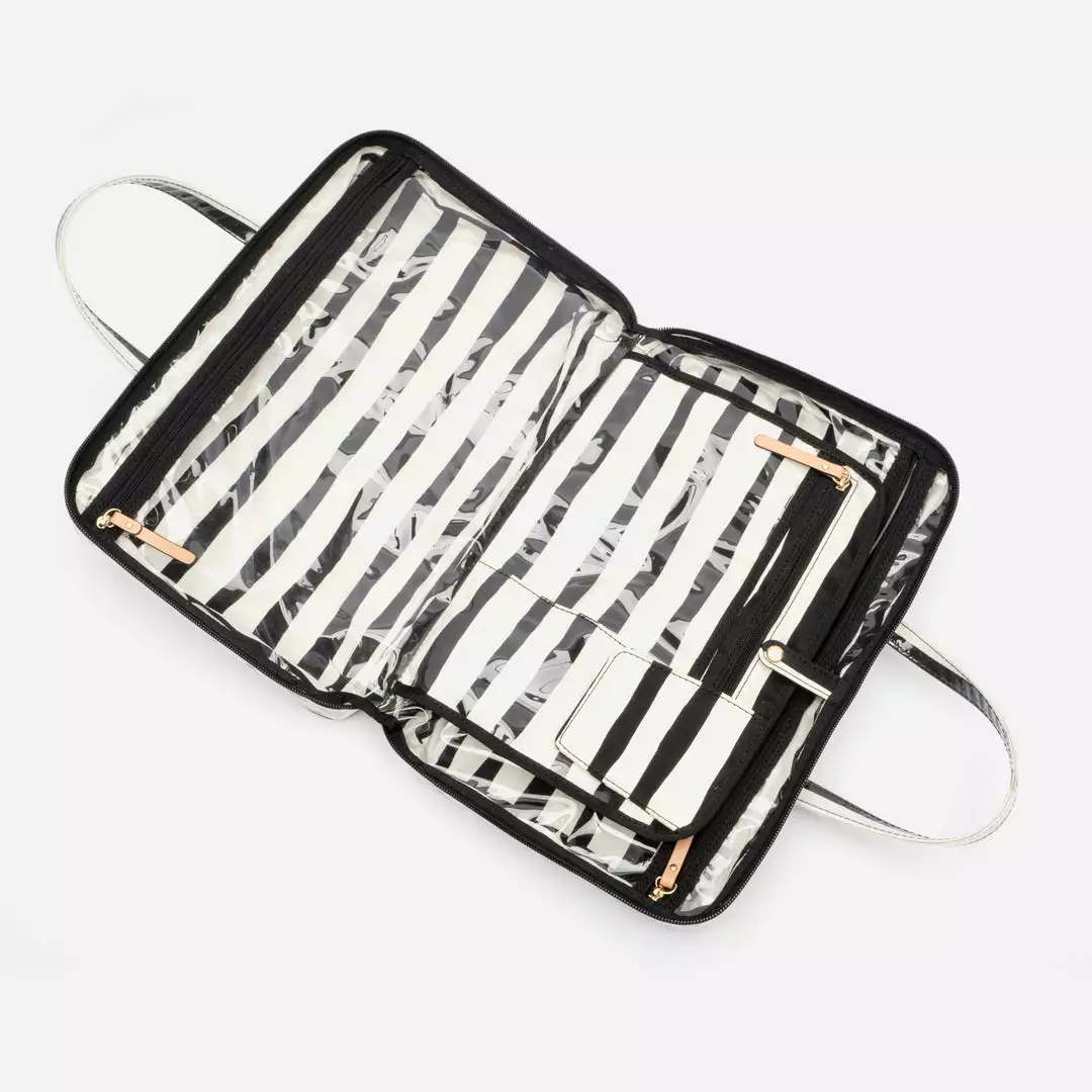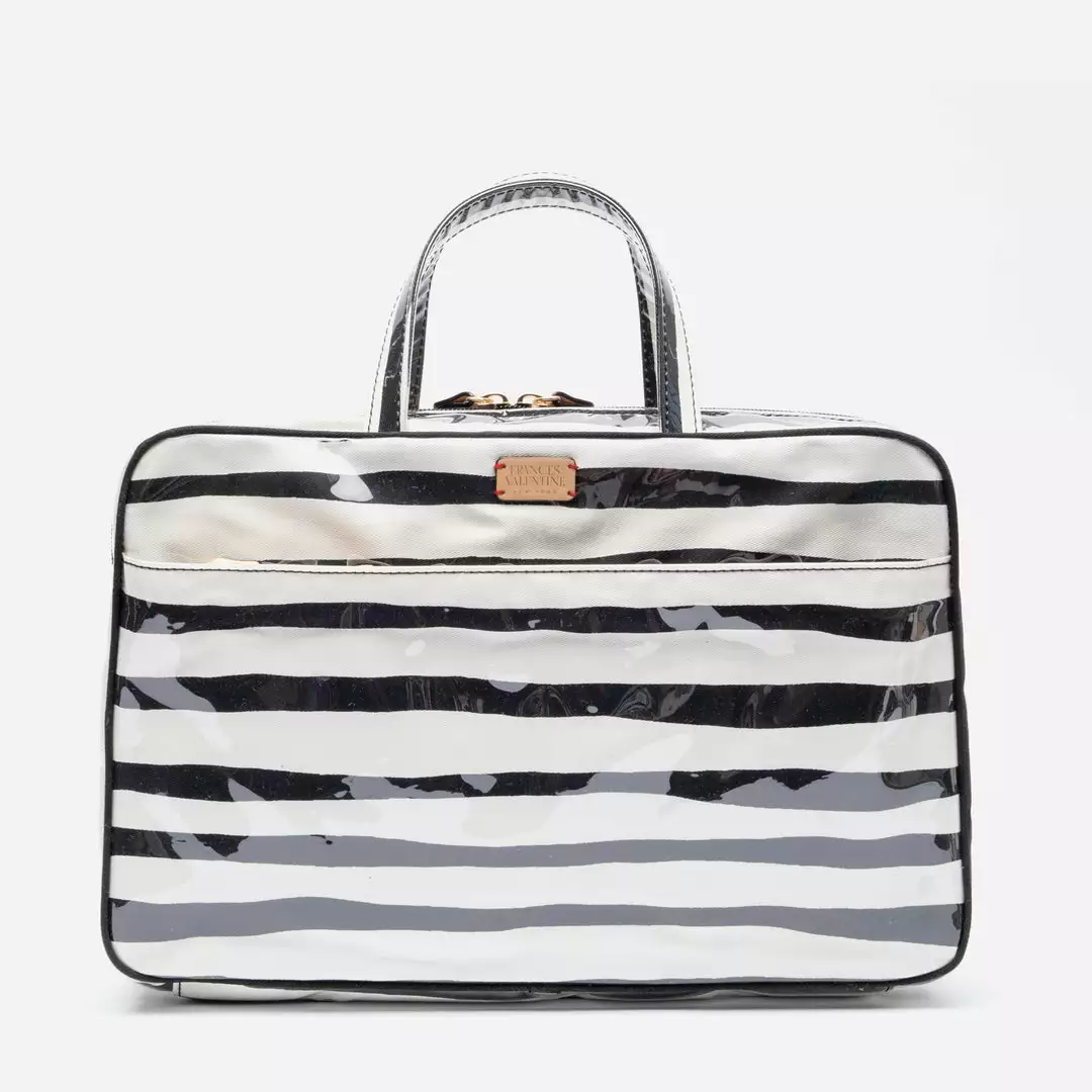 Painterly stripe print. Waterproof PVC exterior and interior. Interior cotton twill brushstroke lining. Exterior zip pocket. Dual interior zip pockets. Middle divider with with dual zipper pockets and toothbrush compartment.