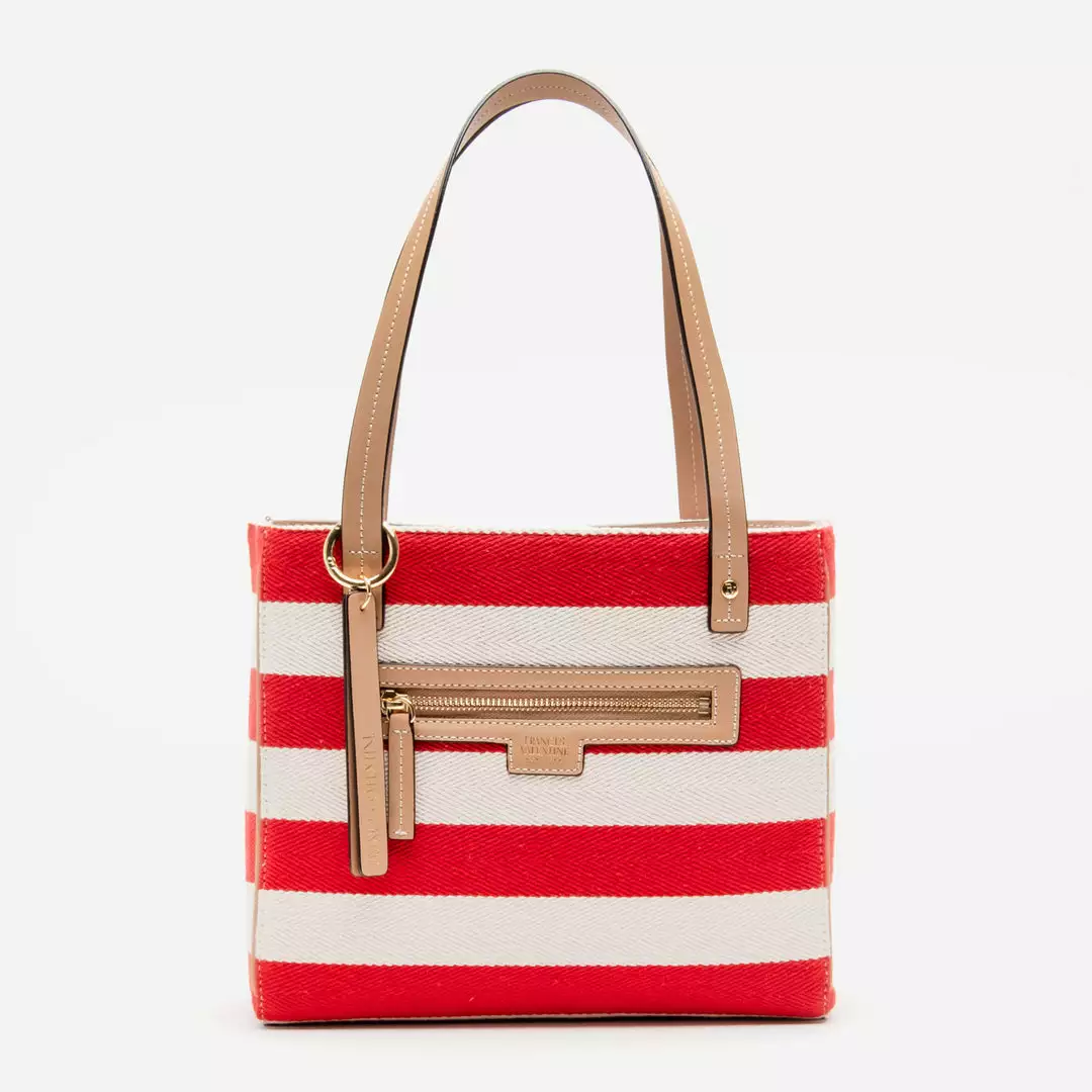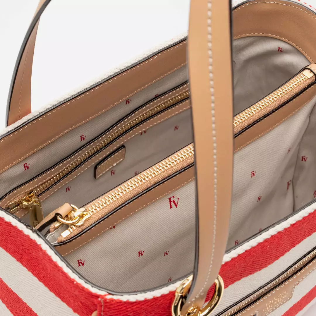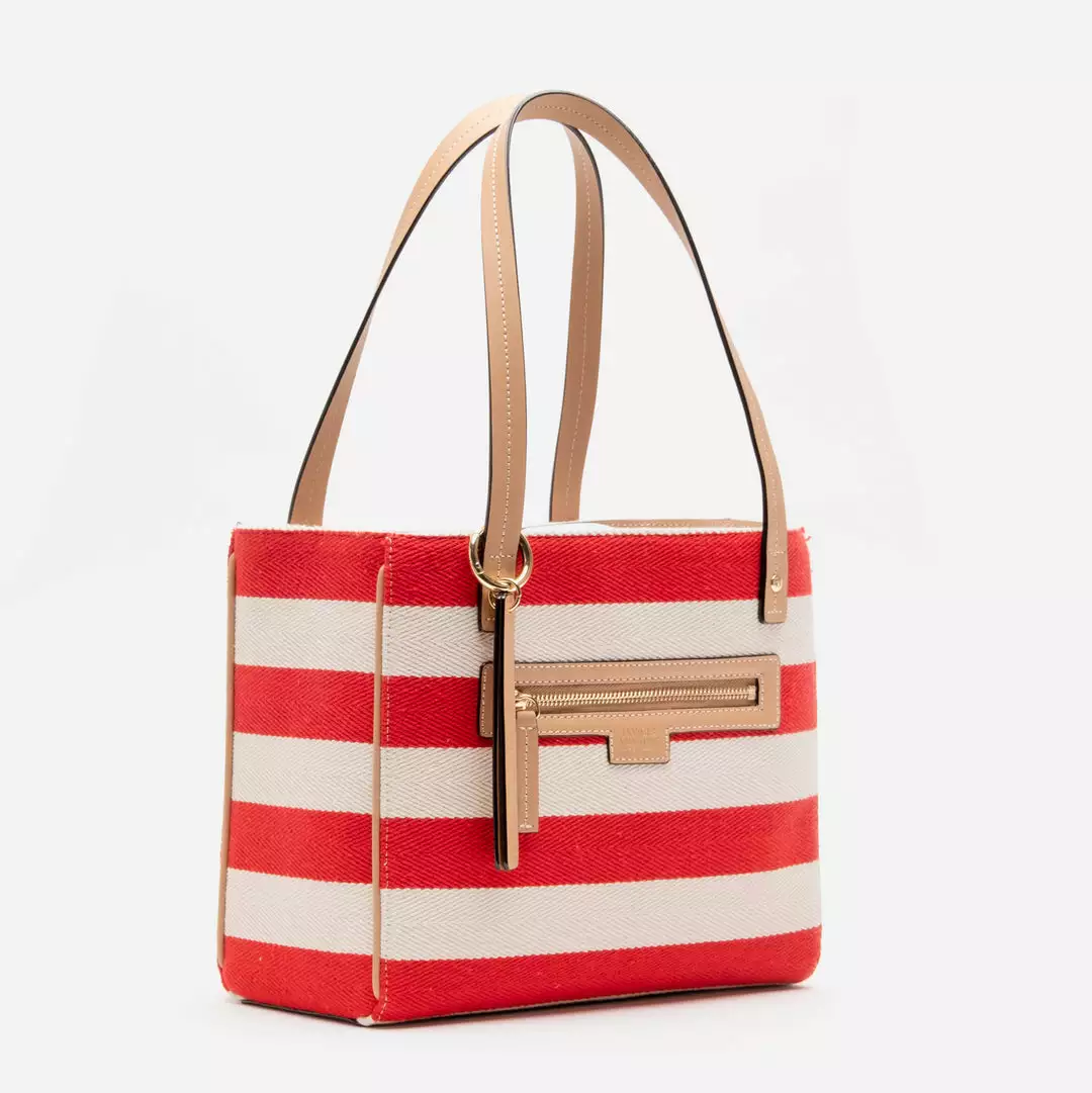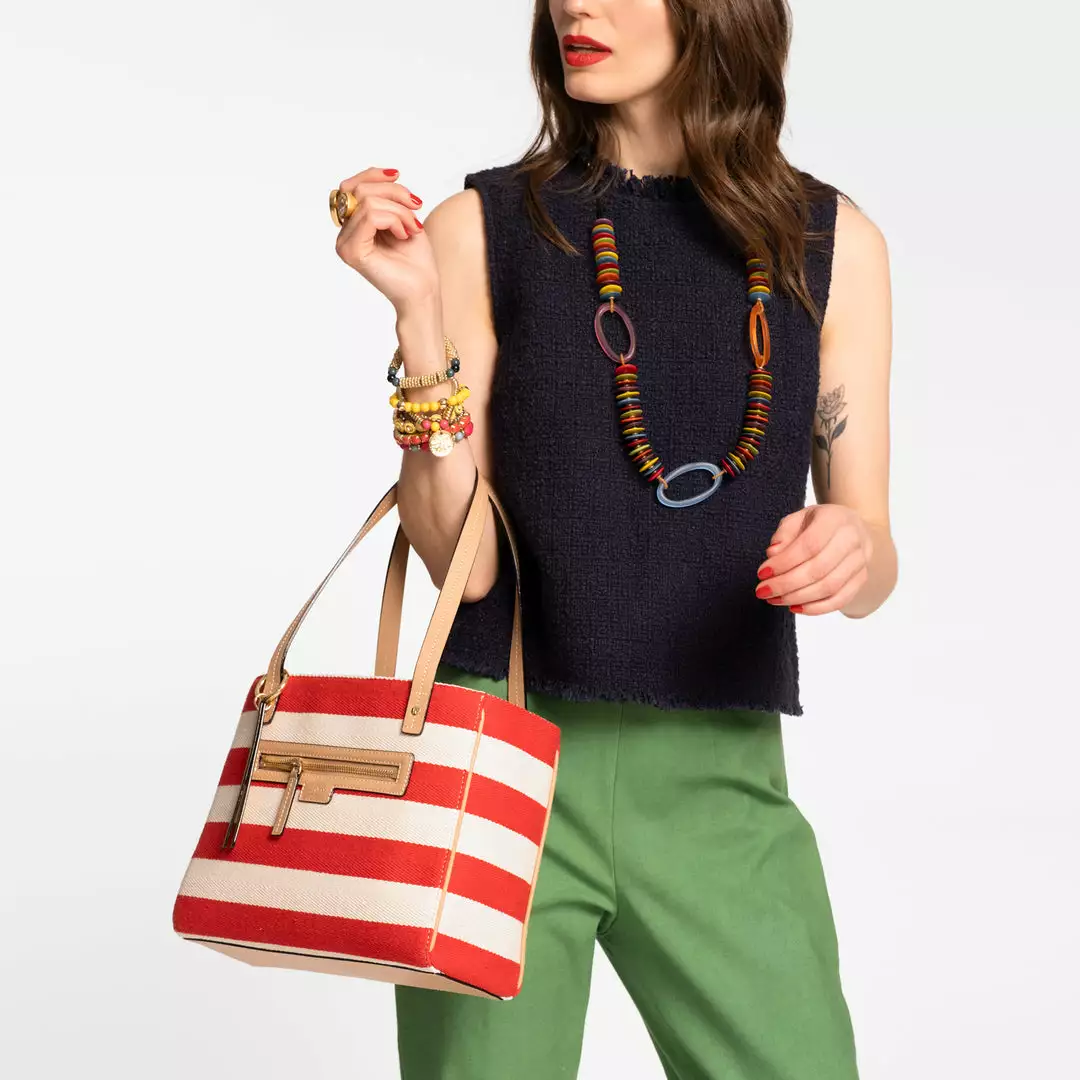 Our Henry Tote in striped natural and red canvas with vachetta leather trim details, the perfect tote to carry all of your essentials this season.