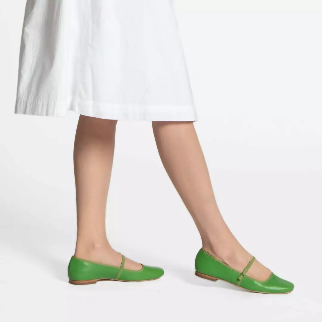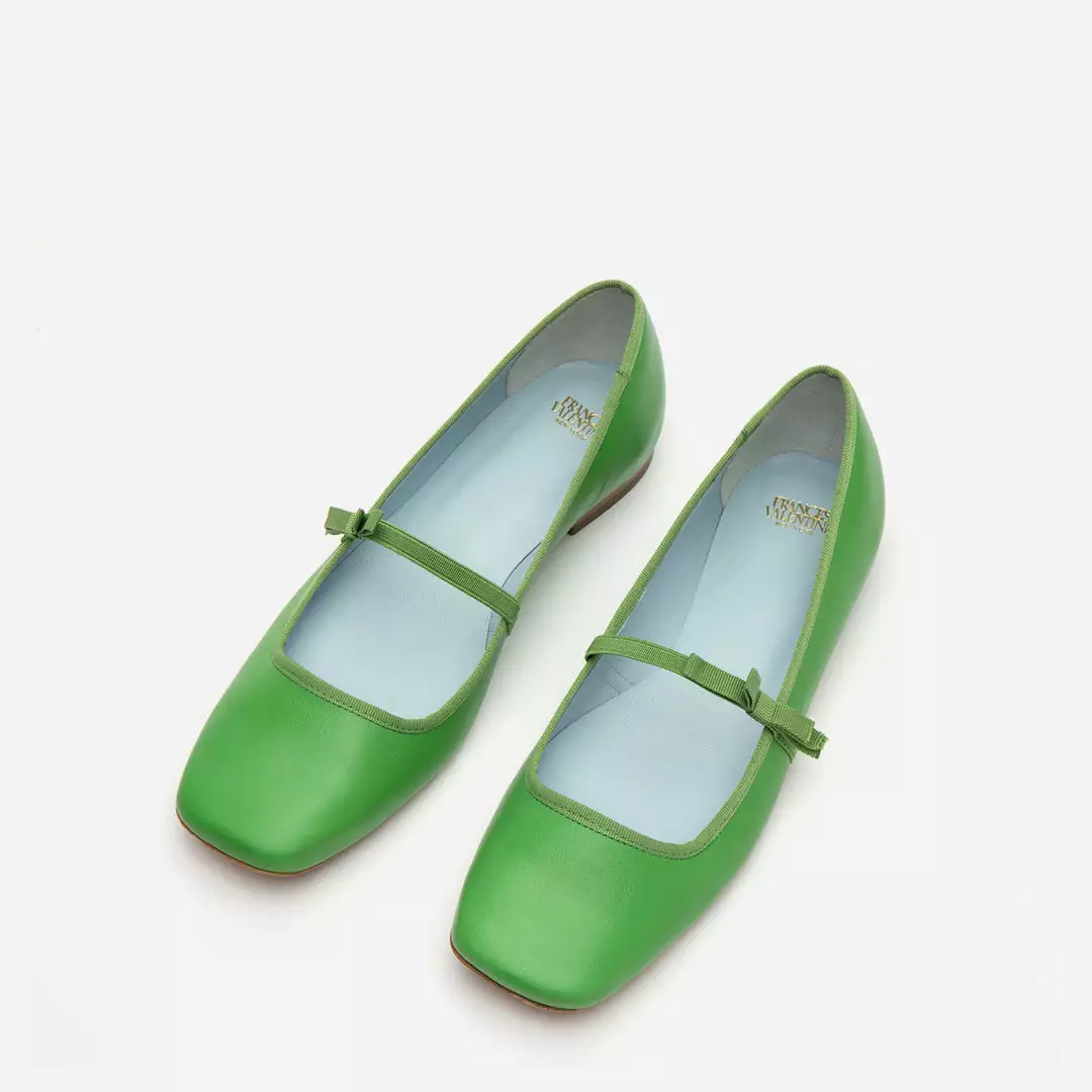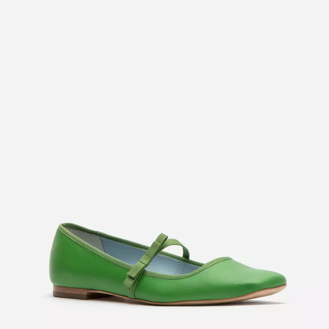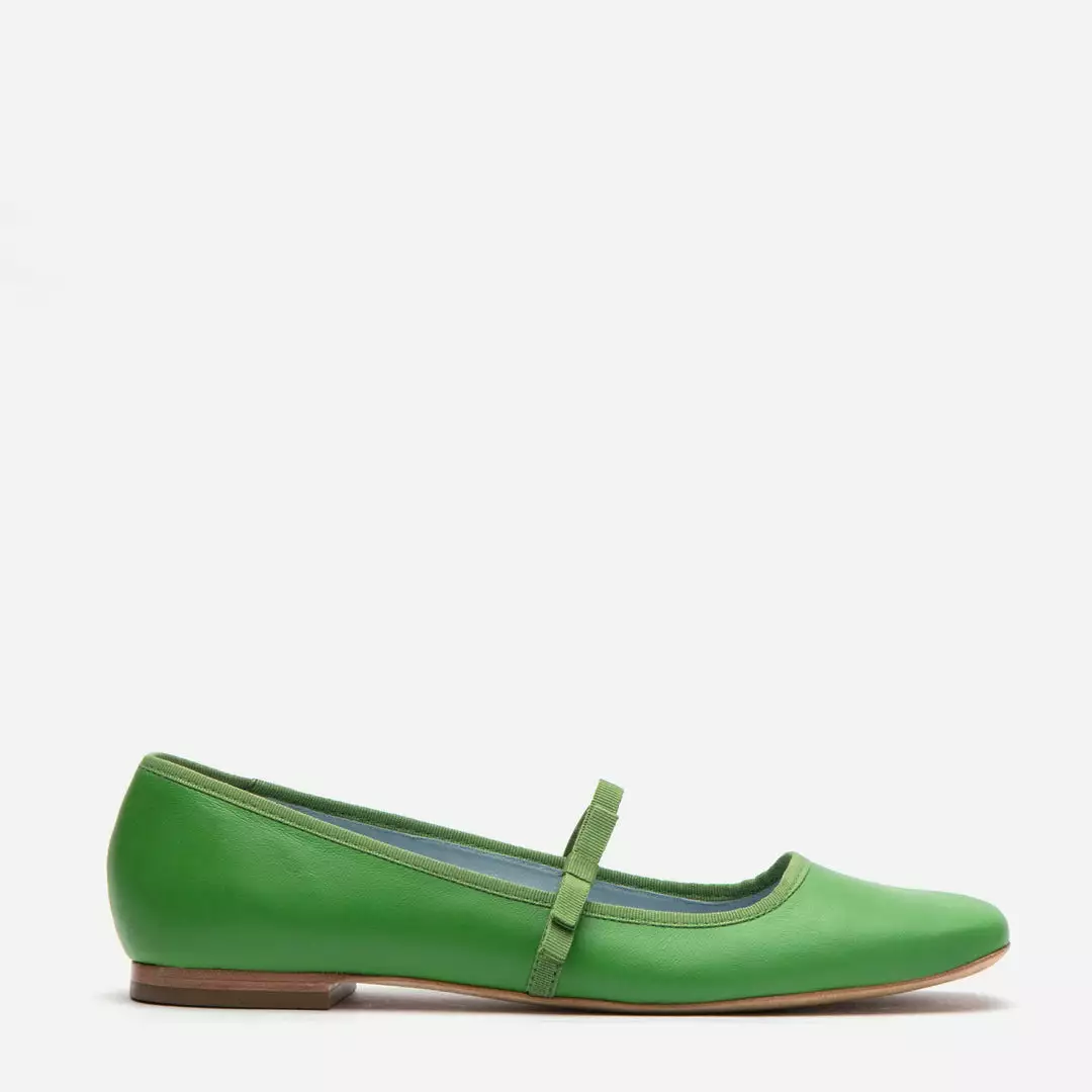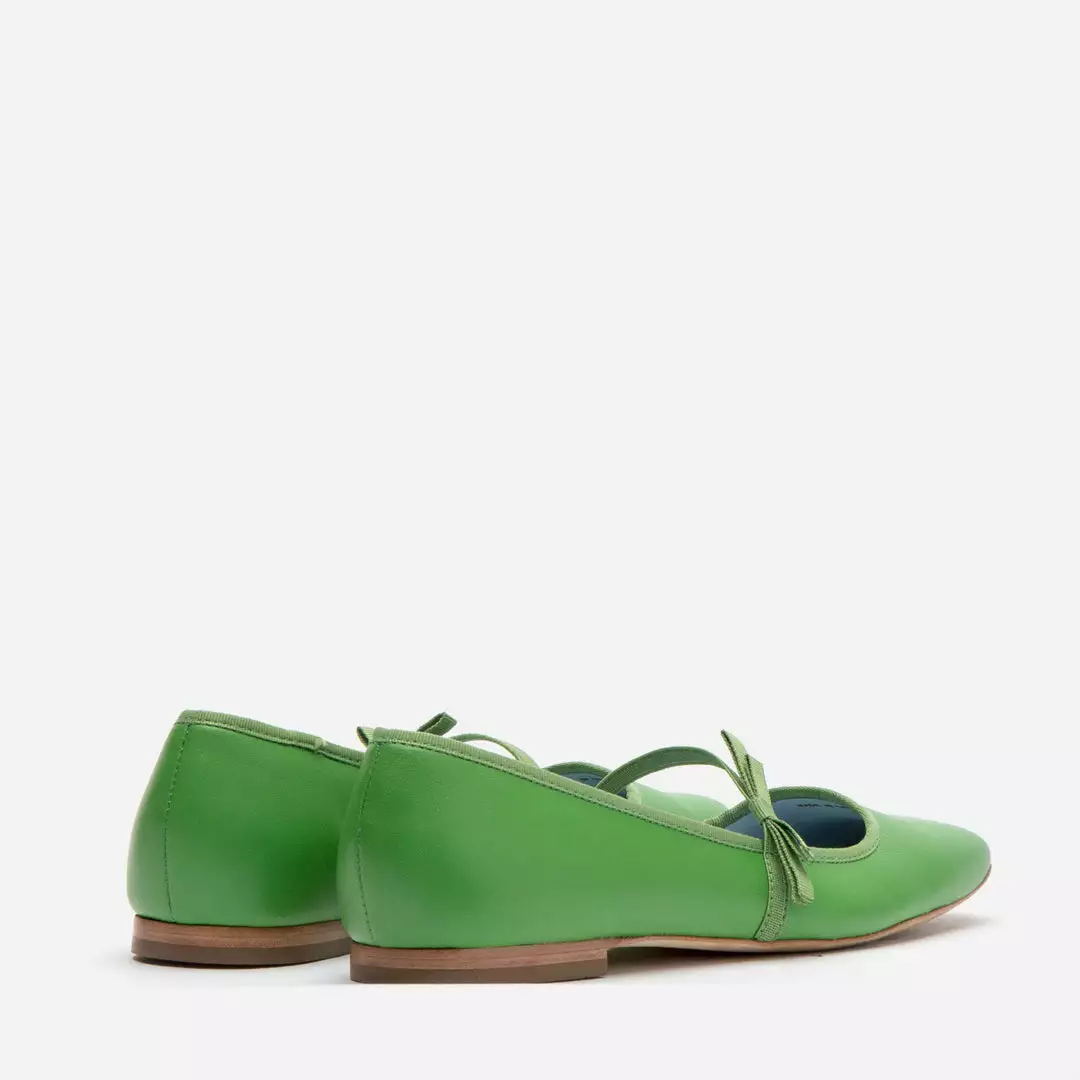 Jude Mary Jane Leather Flat in soft calf leather with elastic bow details. Grass green leather flats are a fun update from the basic ballet flats.