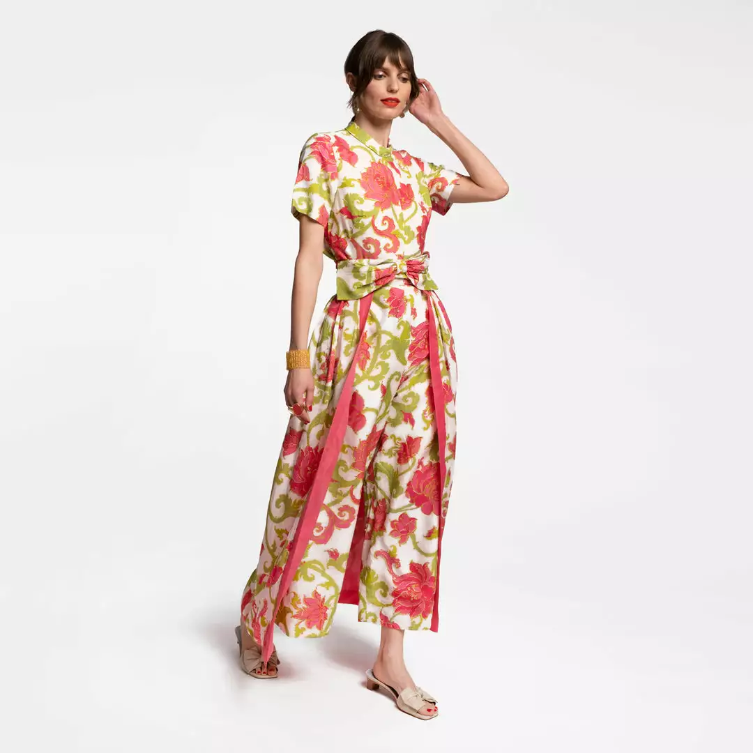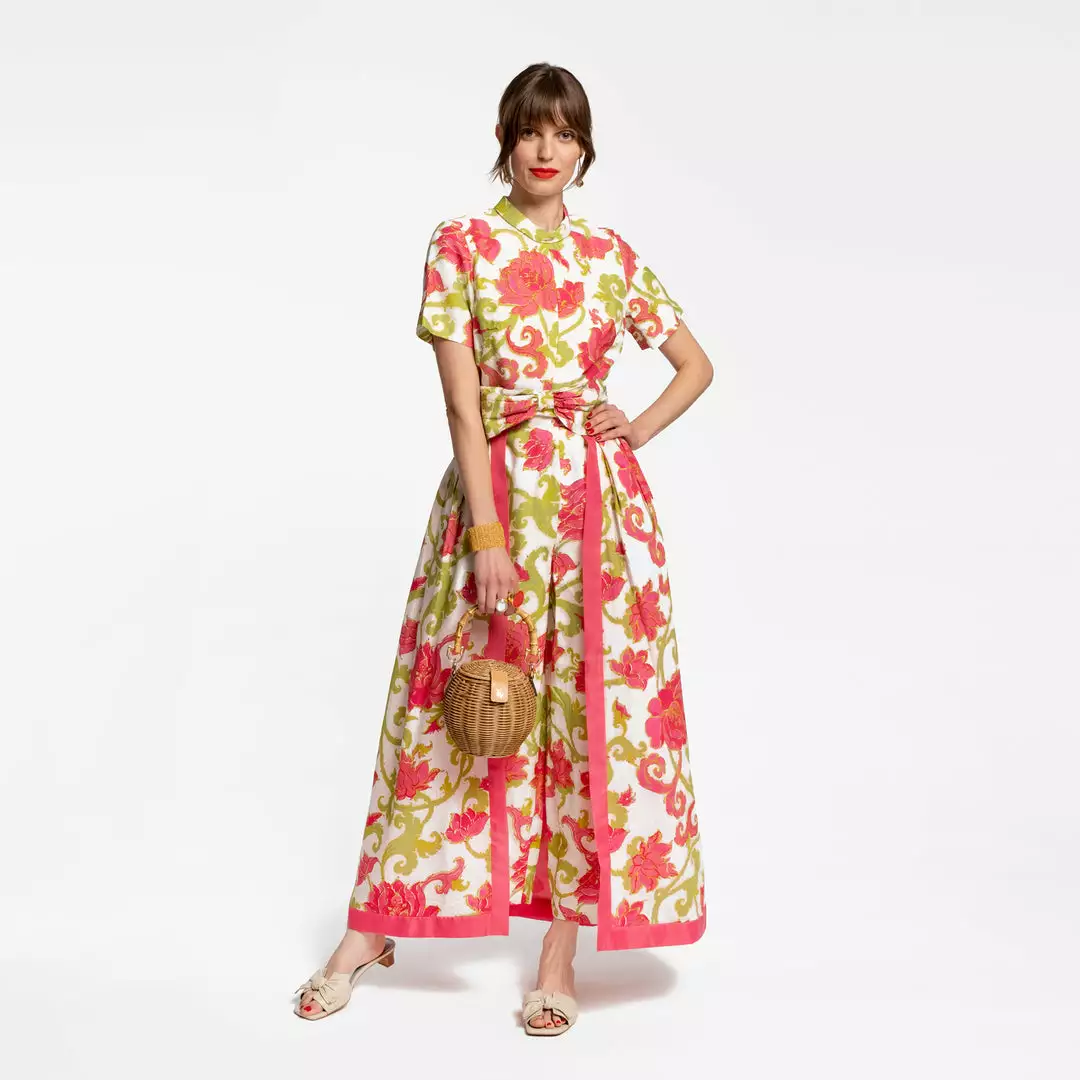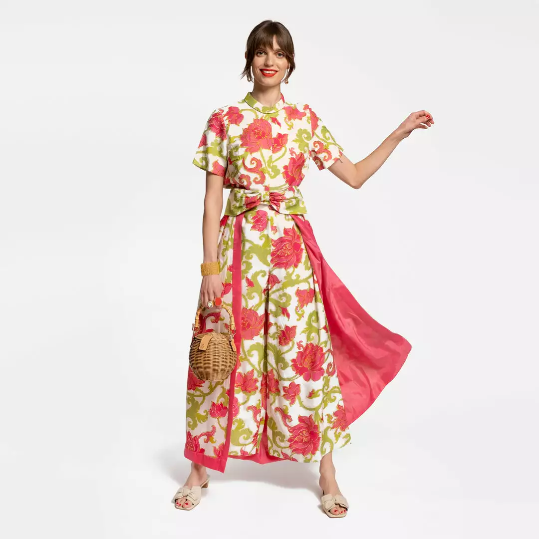 A natural choice for a cocktail party or wedding, this chic Jumpsuit can be worn alone or with the removable bow skirt attachment. Strike a pose in this powerful silhouette featuring our new Rococo Vine print. Pair with any of our Sandy Slides and you will be ready for any event this season.
