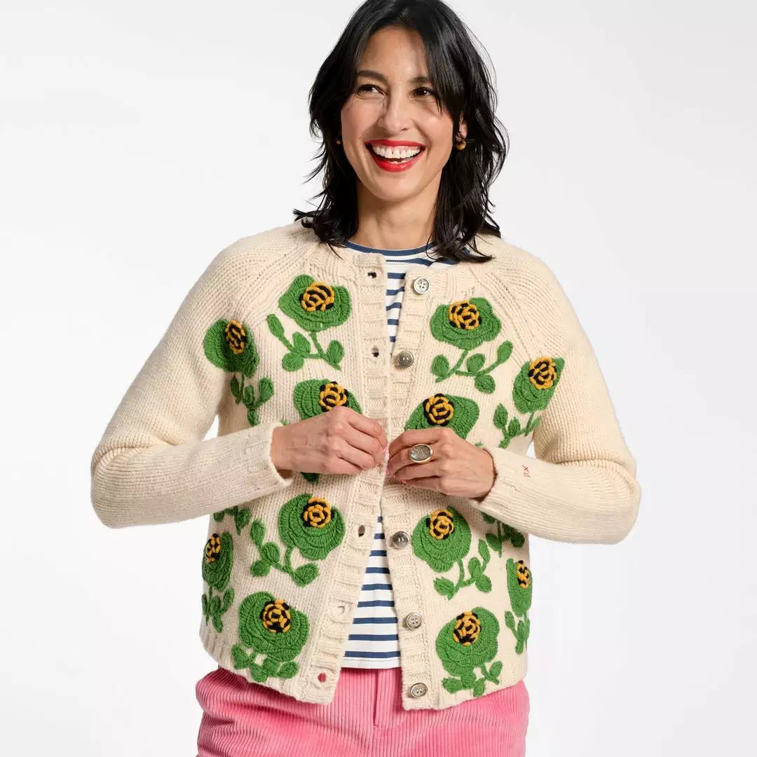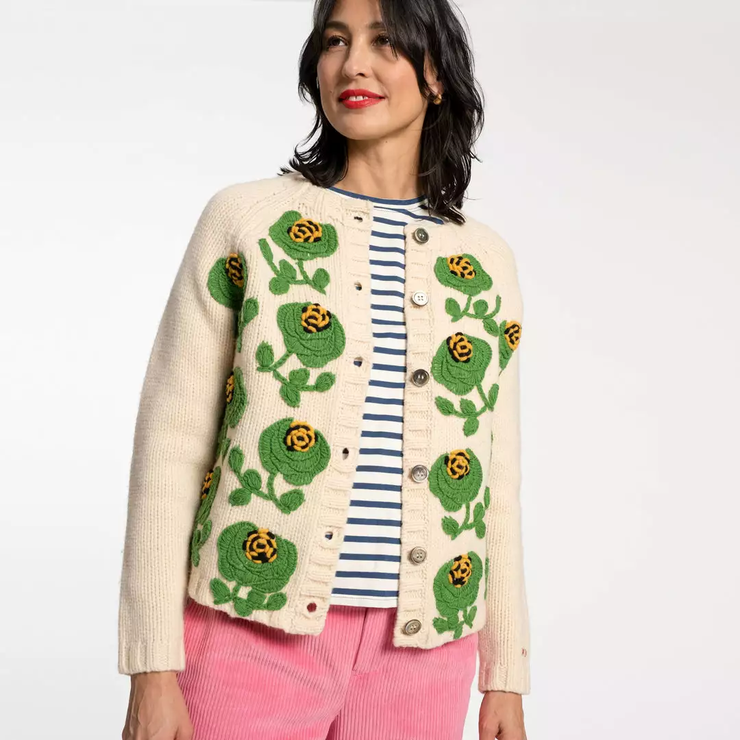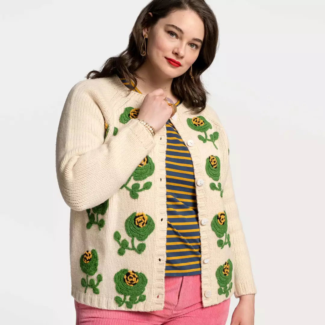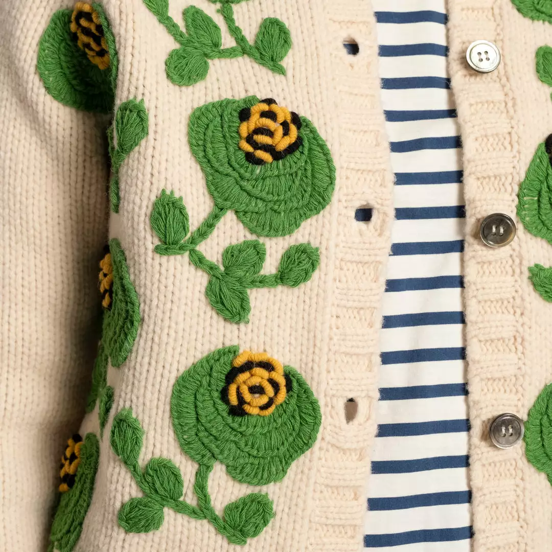 Our Lucky Cardigan is a traditional raglan style cardigan with oversized hand embroidered flowers and French knot clusters. Pair with any of our striped long sleeve shirts, a pair of corduroys, and flats for the perfect look.
