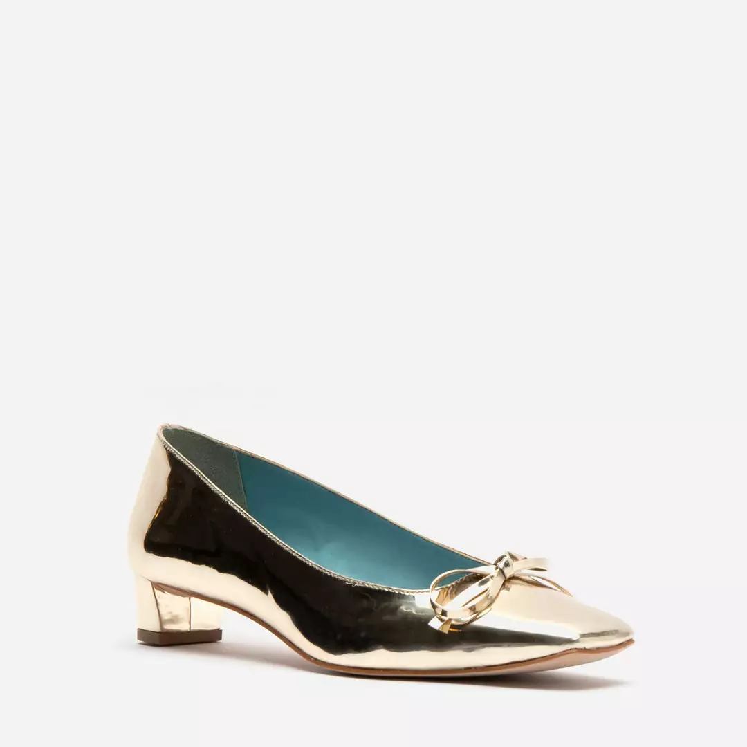 Our best selling Mary Mini Block Heel is now offered in vegan platino metallic with bow detail. This shoe has quickly become a Frances Valentine style staple!Â