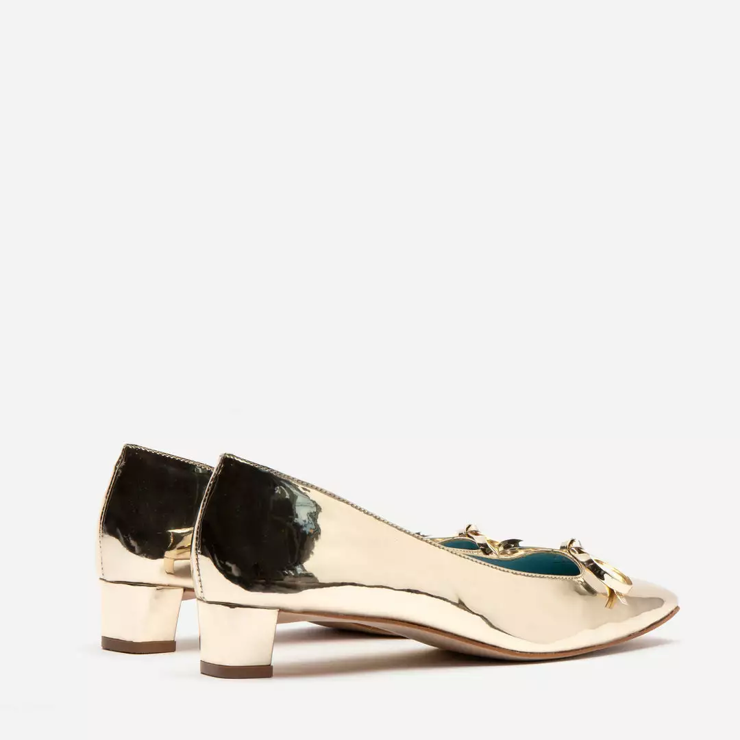 Vegan metallic heel with bow . Squared toe. Stacked heel. Vegan sole.