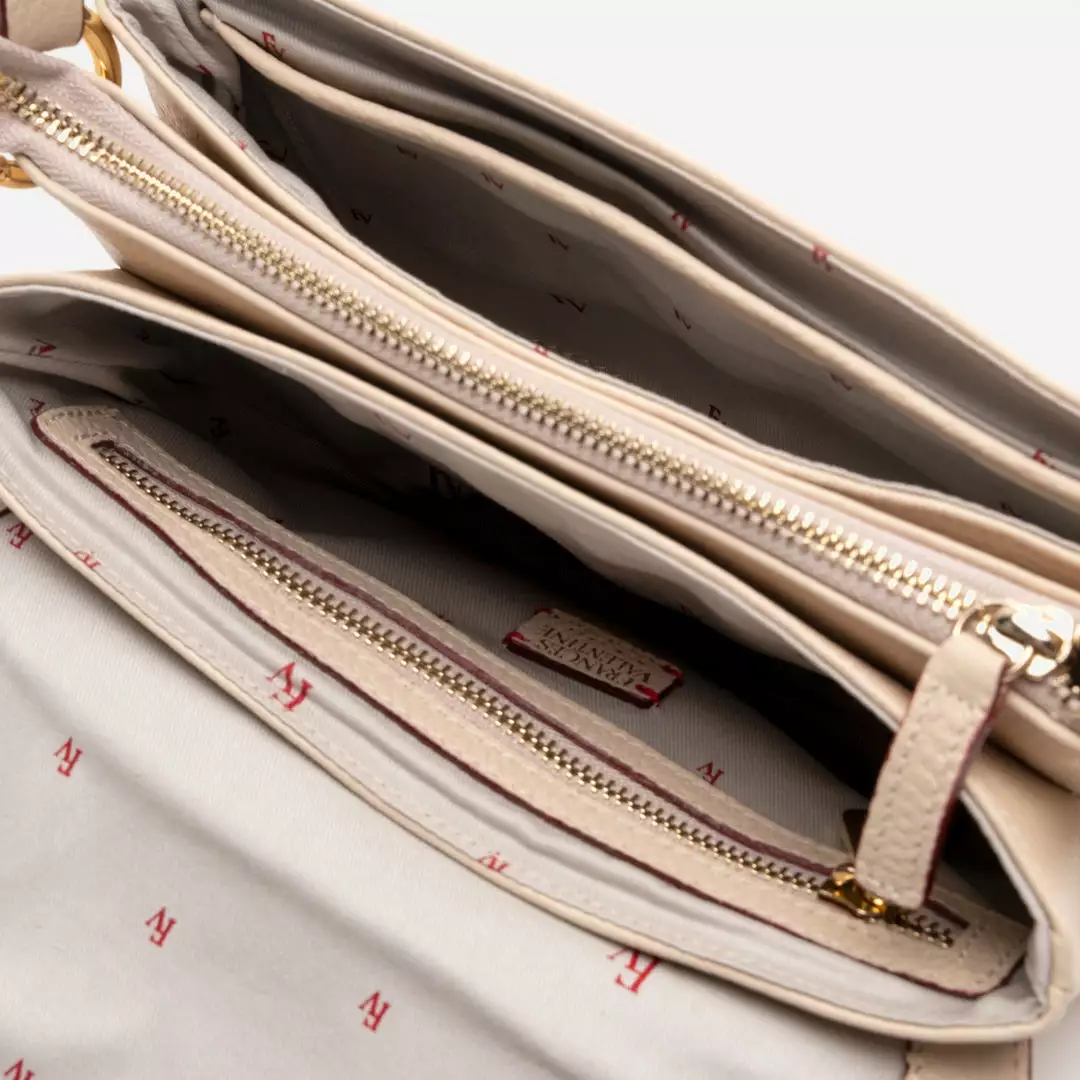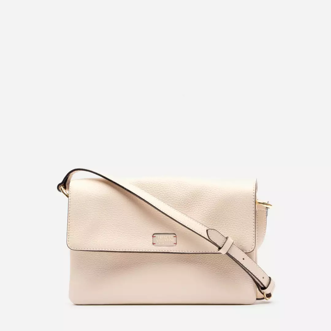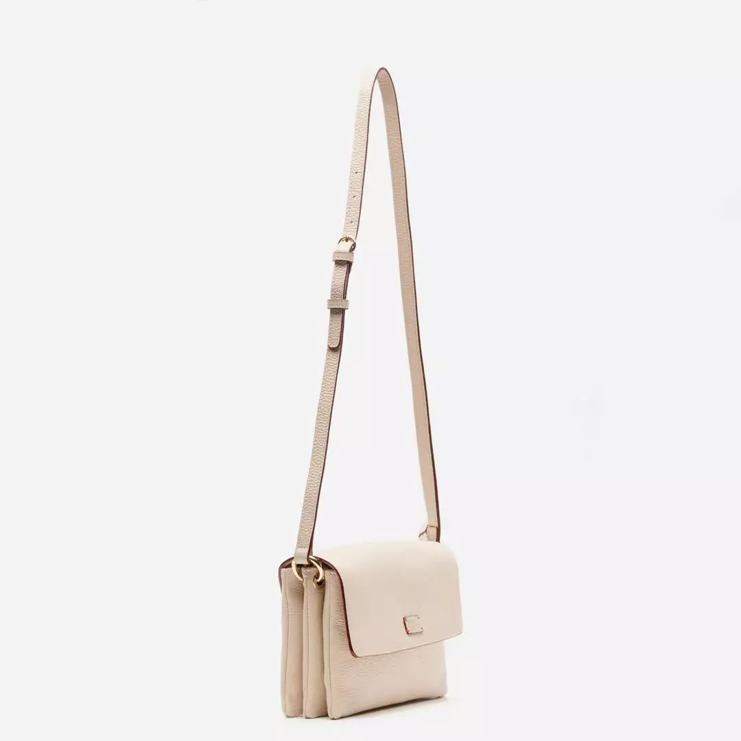 Tumbled leather. Interior slip pocket. Adjustable crossbody strap. FV logo cotton twill lining. Magnetic flap closure.
