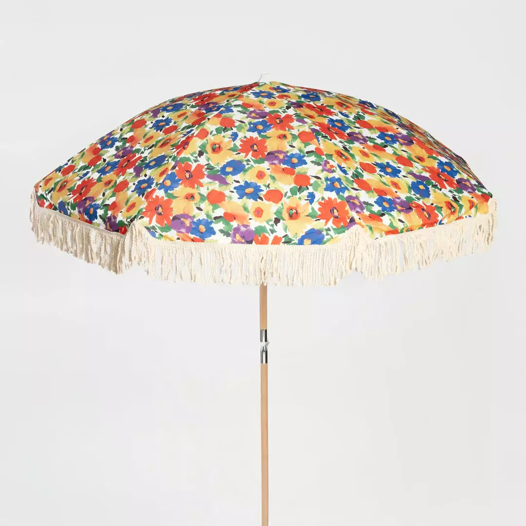 From the beach to your own backyard oasis, cool down in the shade of our new Beach Umbrella! Featuring our multi colored Floral Explosion print and fringe edge detailing, this is not your ordinary beach umbrella!