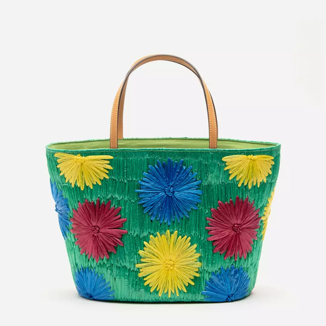 Embroidered woven basket. Interior slip pockets. Vachetta leather details. Cotton twill lining.