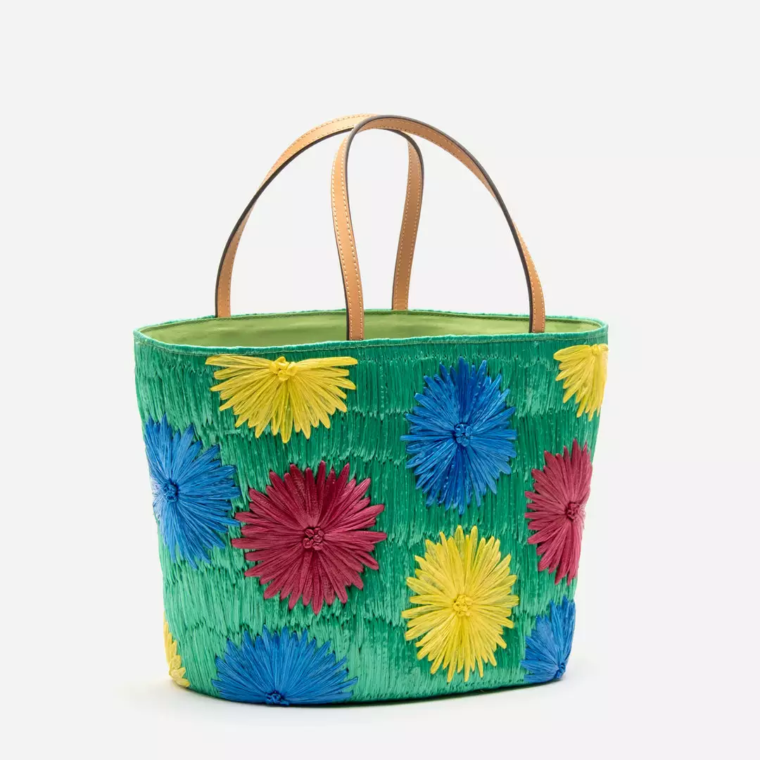 Add a pop of color to your look with our Embroidered Flower Basket. Woven raffia flowers adorn this perfect tote, your new go to basket this season.