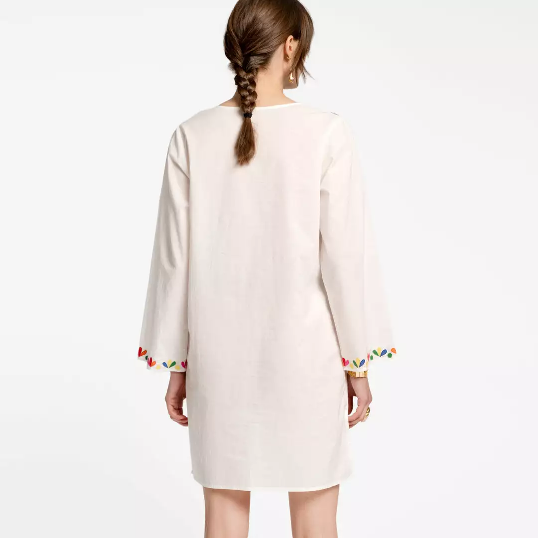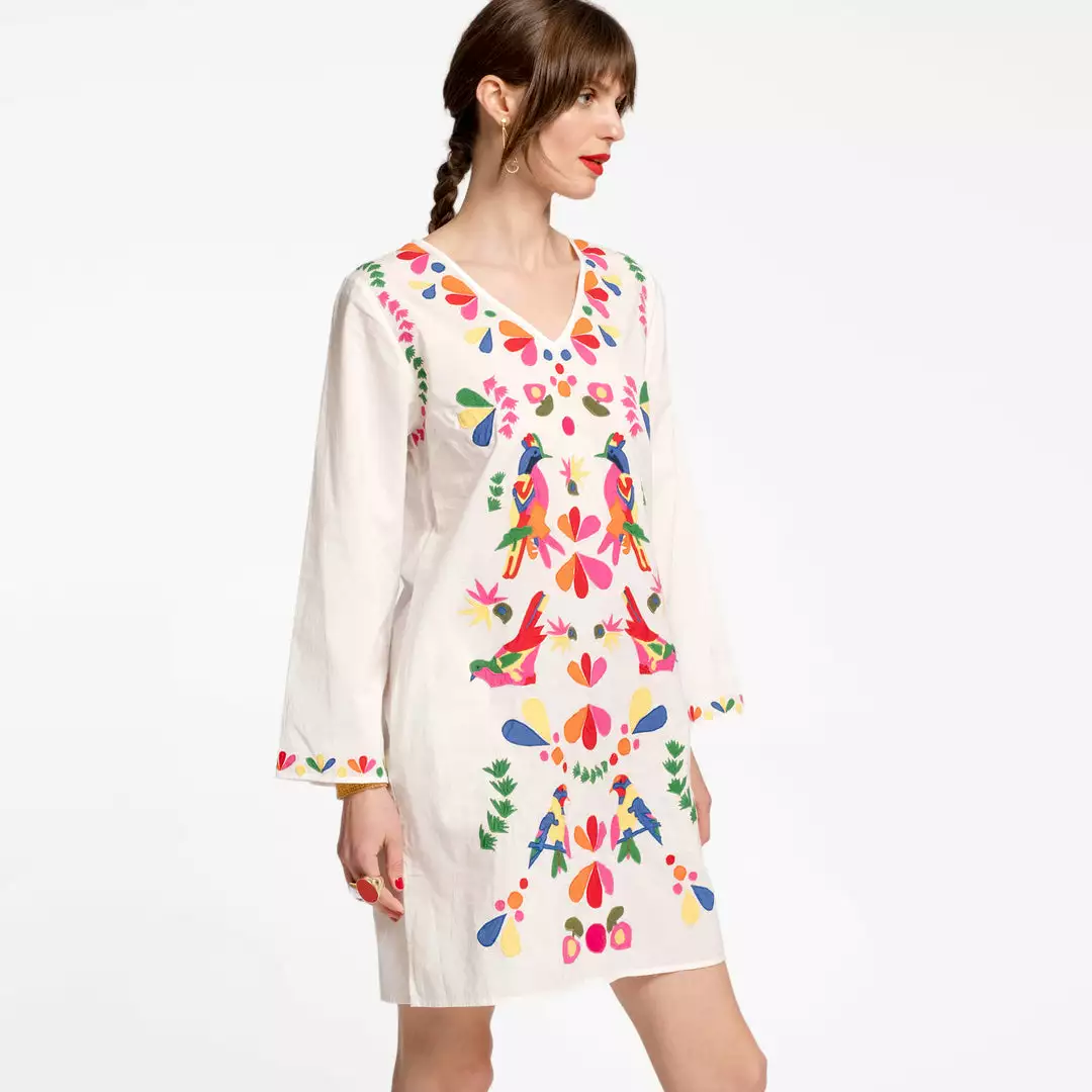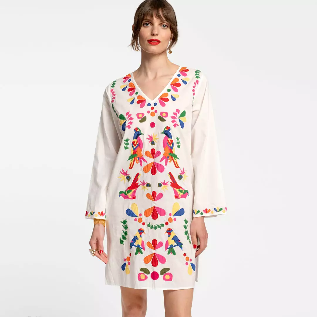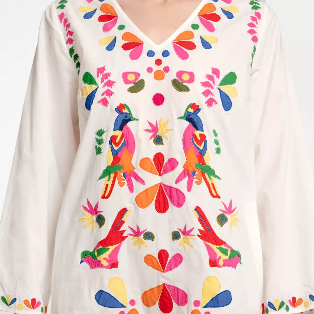 Our Bird is the Word print reimagined in patch applique on our Goldie Tunic silhouette. We love to throw this style on as a beach cover up, top or dress.Â