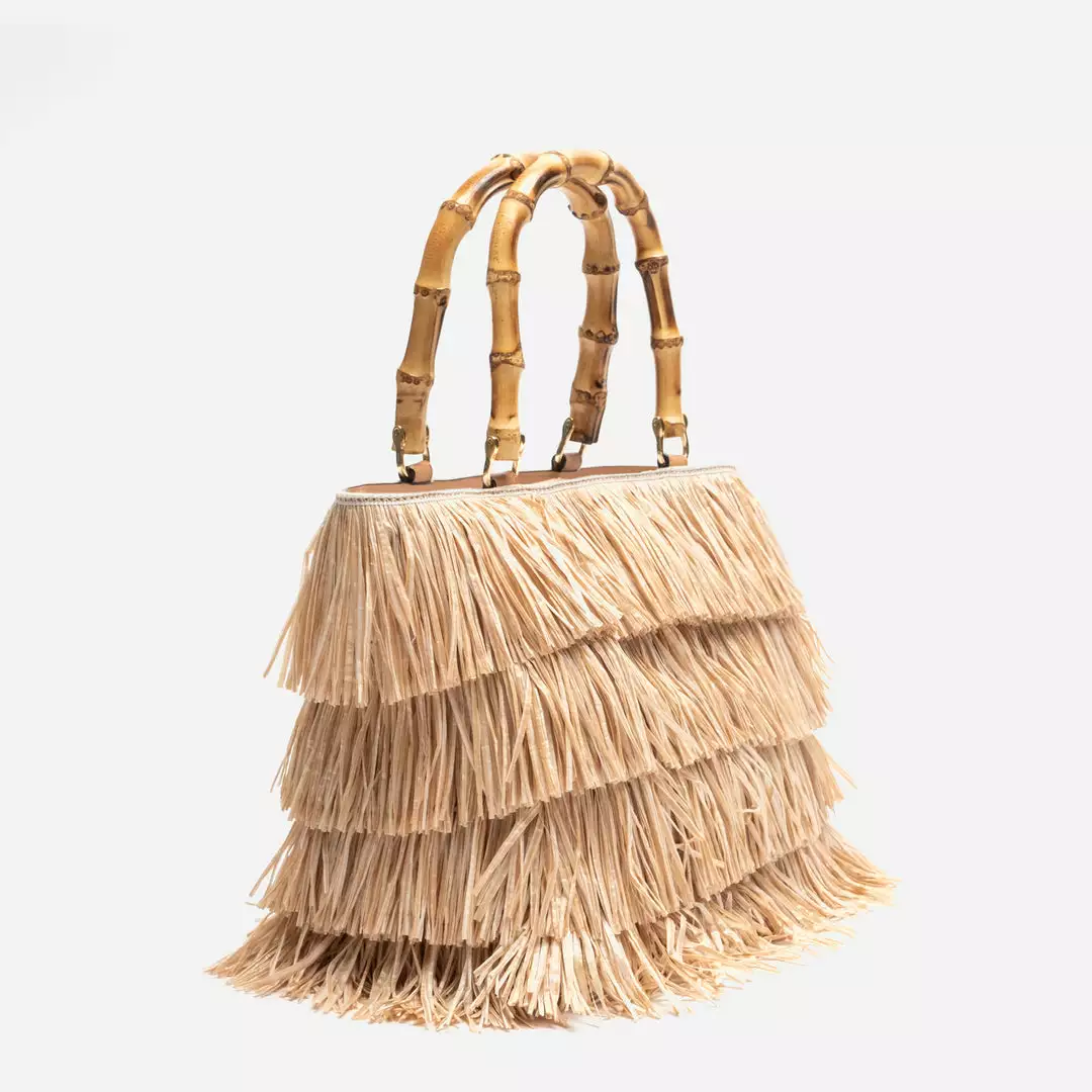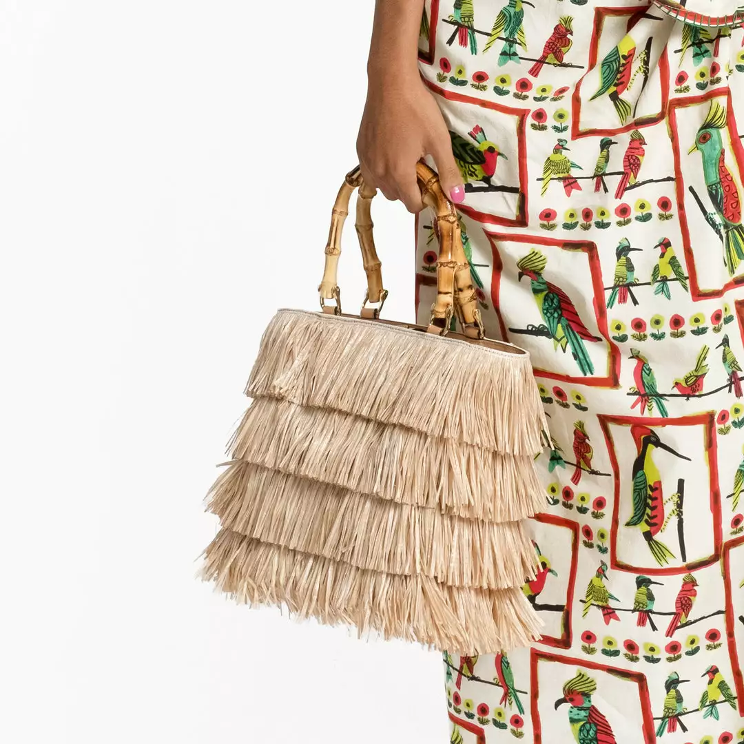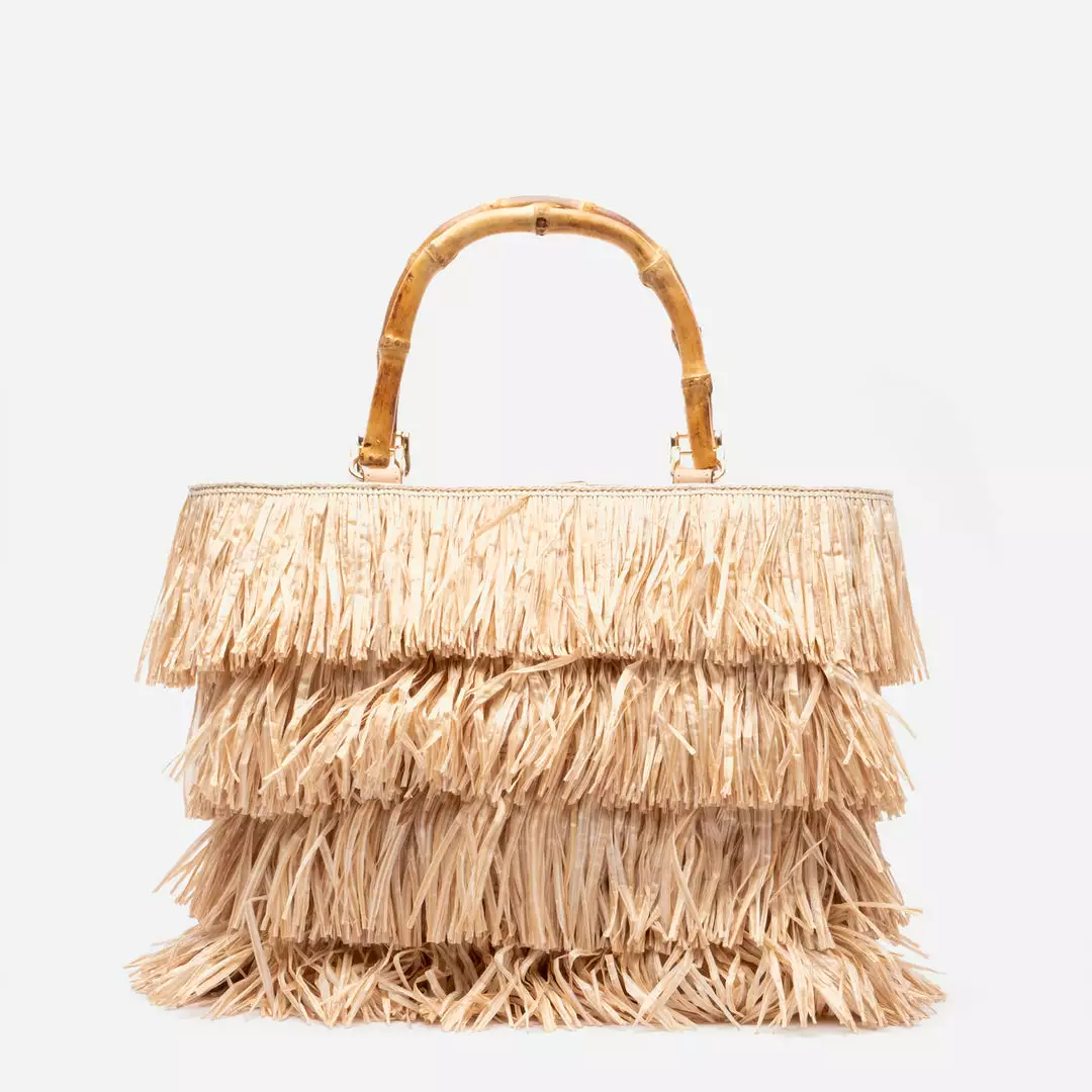 Canvas tote with raffia fringe. Wooden bamboo handles. Interior zippered pocket and dual interior slip pockets. FV cotton twill lining.