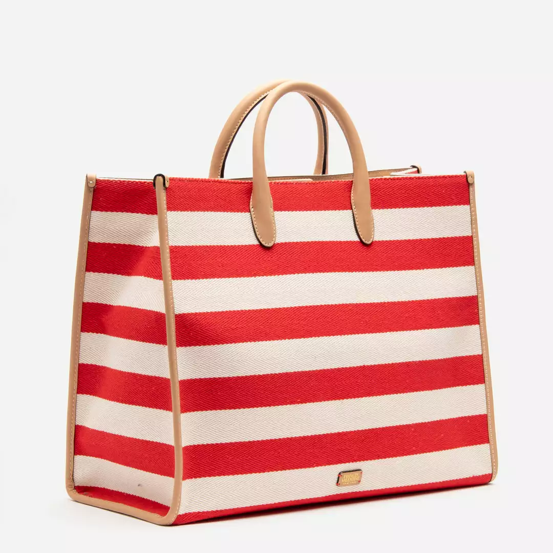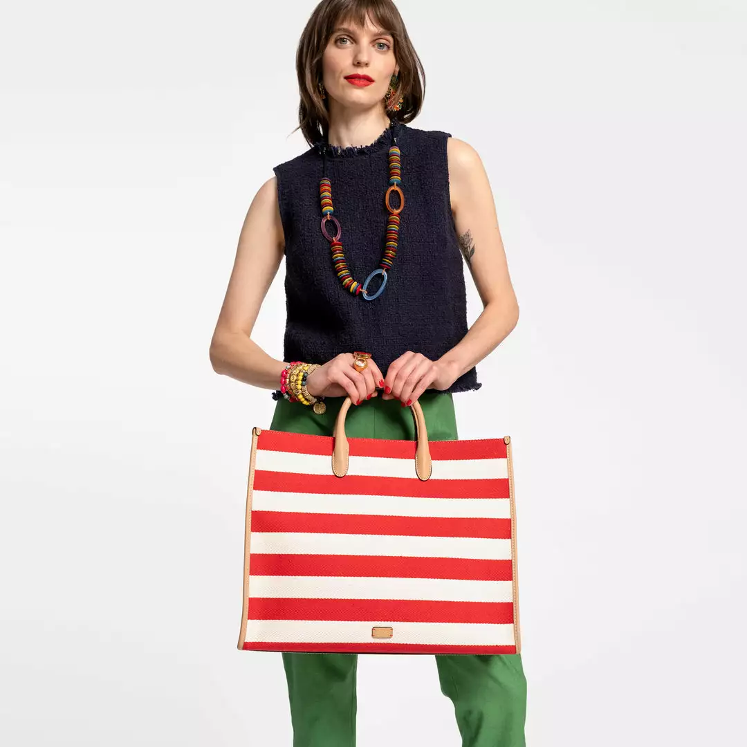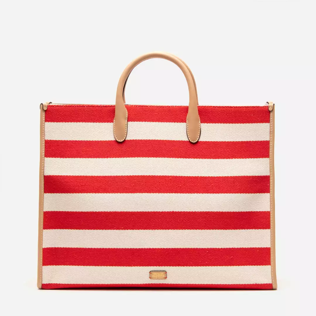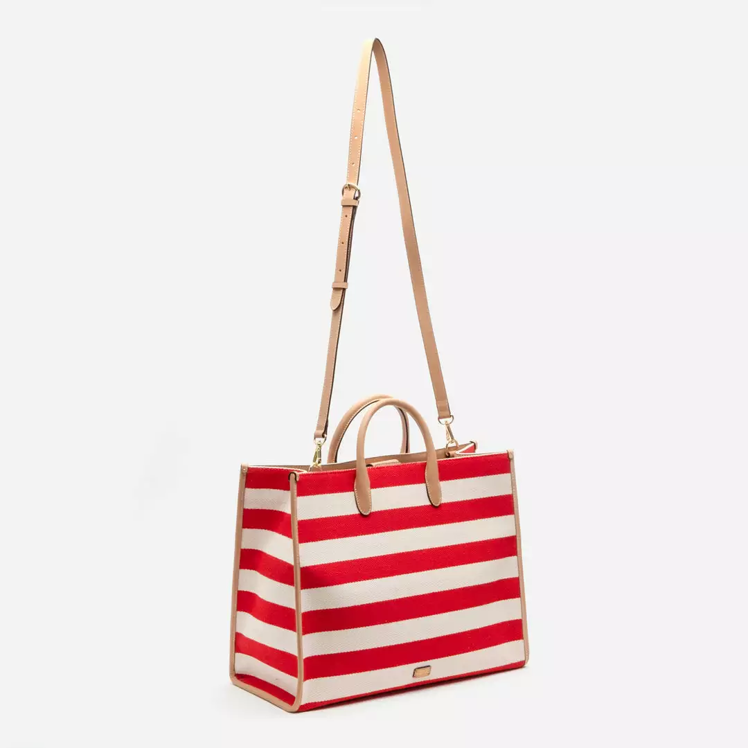 Perfect for a weekend adventure of a trip to the beach, our Large Tote in striped canvas will fit all your belongings. We love the red leather accents and the detachable and adjustable crossbody strap.Â