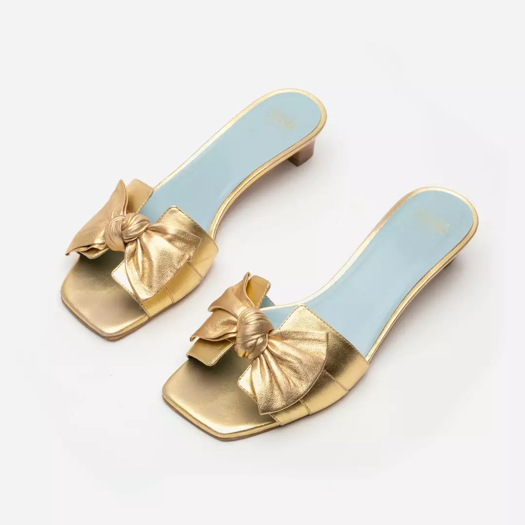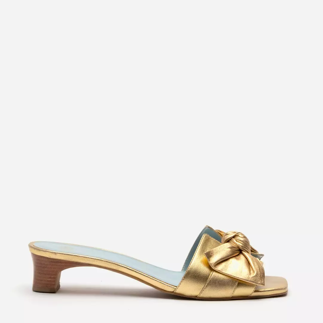 Featuring a playful metallic bow detail and a stacked wooden heel, the Sandy Slide Heel is not your average mule.