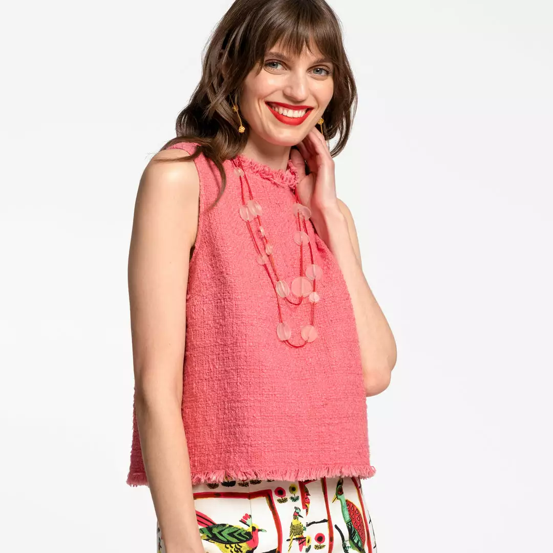 Our Sleeveless Fringe Top in cotton boucle is darling and just screaming for a cocktail. This solid tops features fringed edges and act as the perfect building block for any warm weather look. Add a fun necklace and pair with any of our bright bottoms for a head to toe FV look.