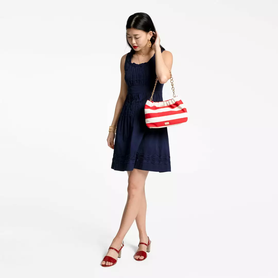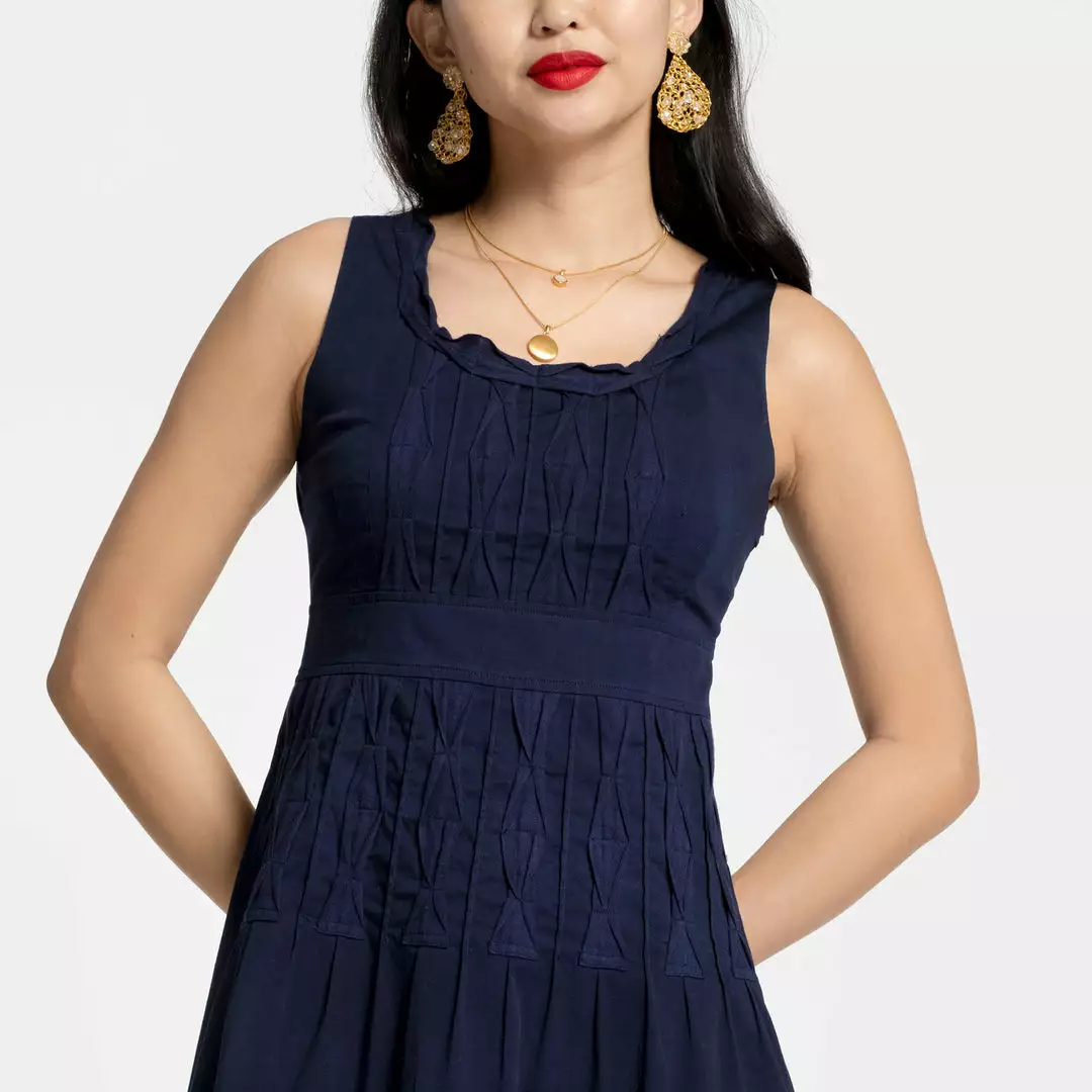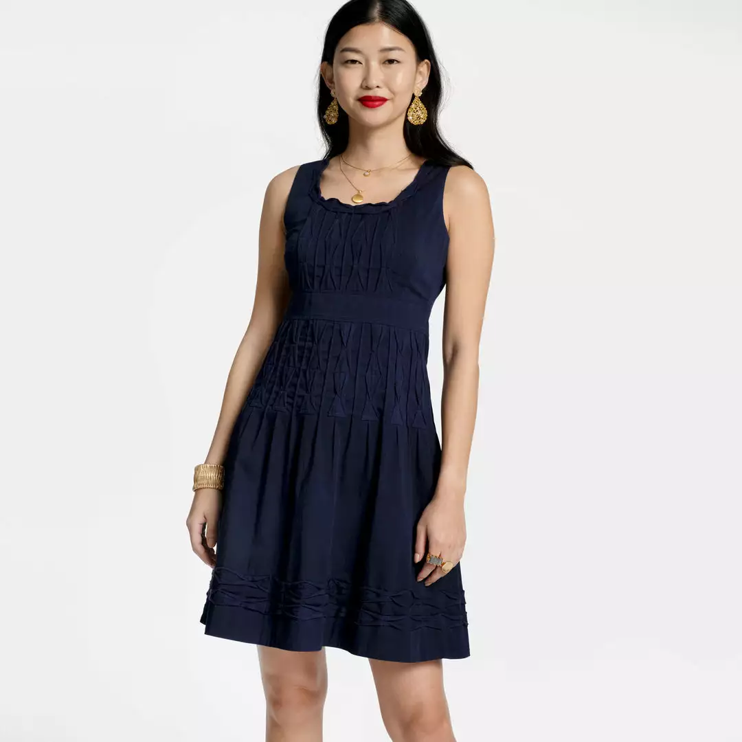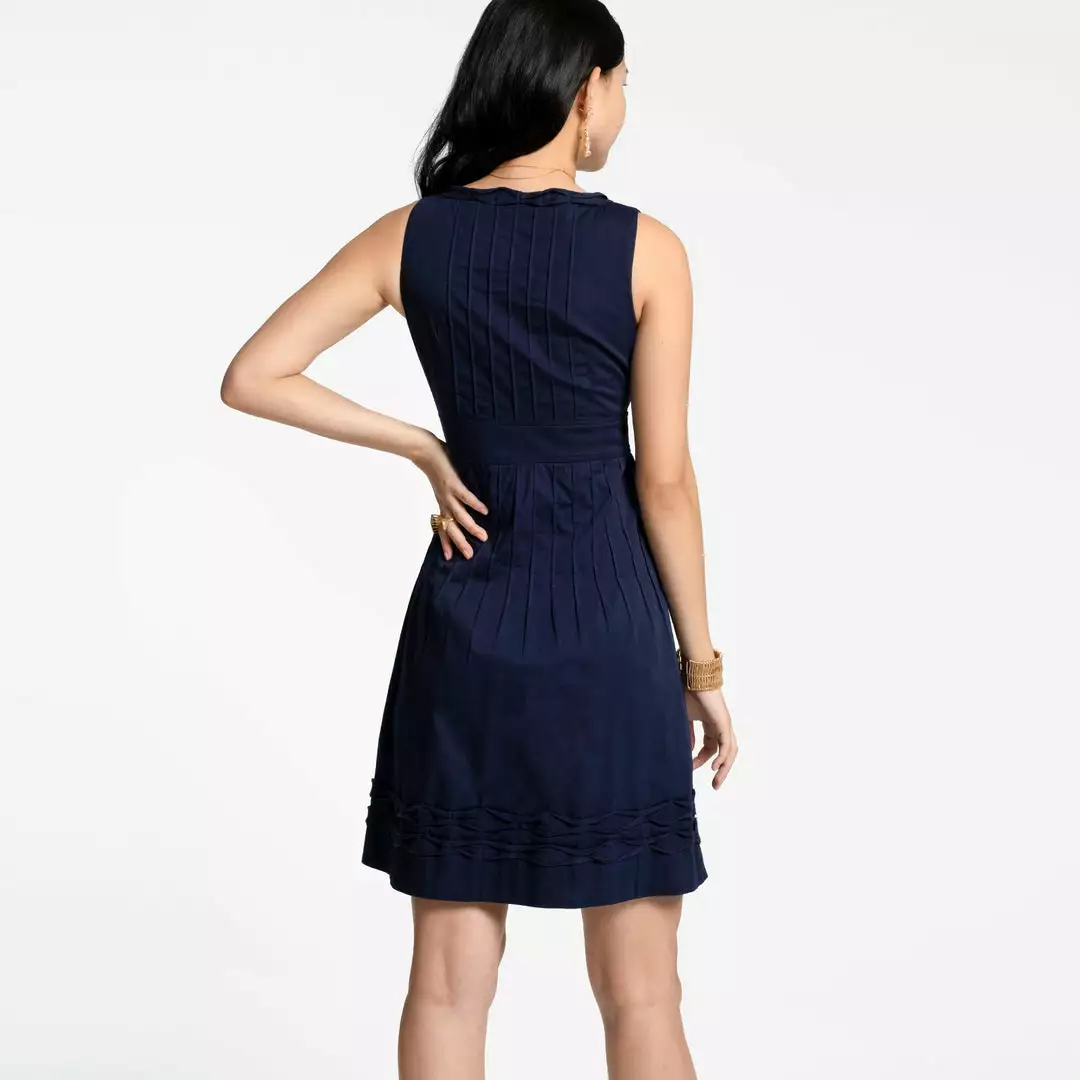 Slim and sleeveless, the timeless shape of the ribbon dress will be one that you reach for time and time again. Our mid length hem dress is gently pleated and adorned with pintucked ribbons from top to bottom.