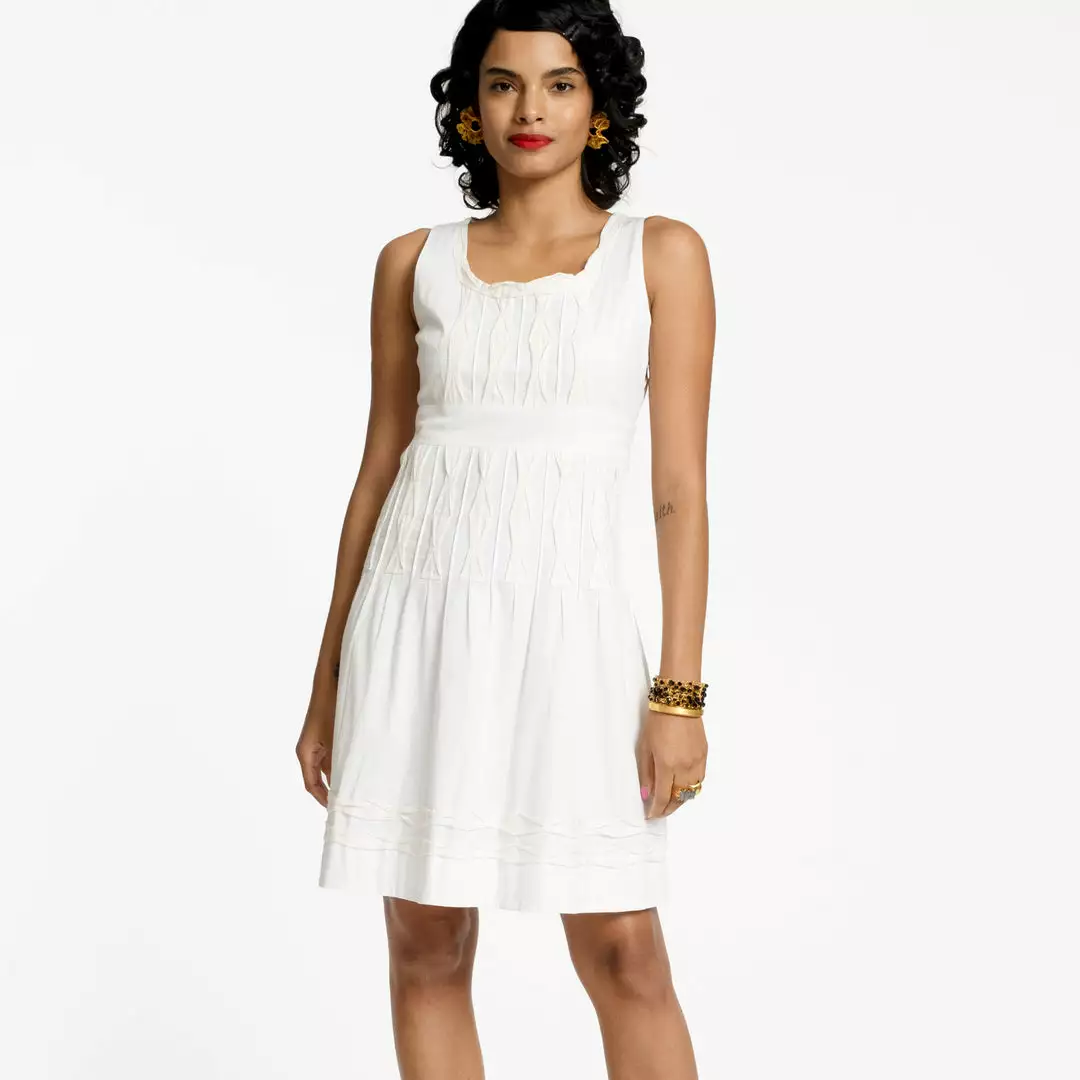 Slim and sleeveless, the timeless shape of the ribbon dress will be one that you reach for time and time again. Our mid length hem dress is gently pleated and adorned with pintucked ribbons from top to bottom.