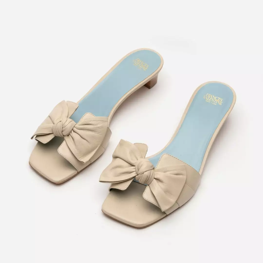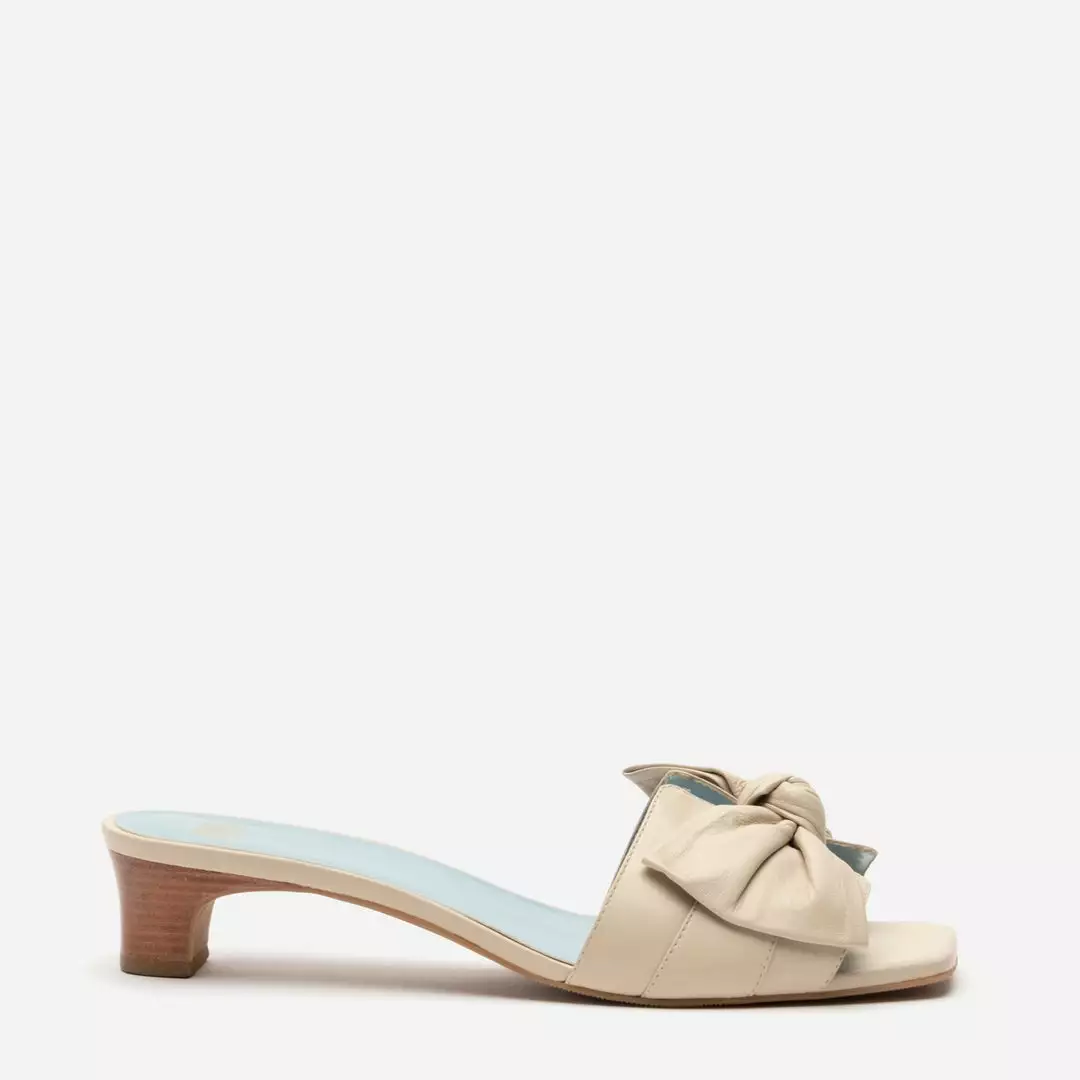 Featuring a nappa bow detail and a stacked wooden heel, the Sandy Slide Heel is not your average mule.