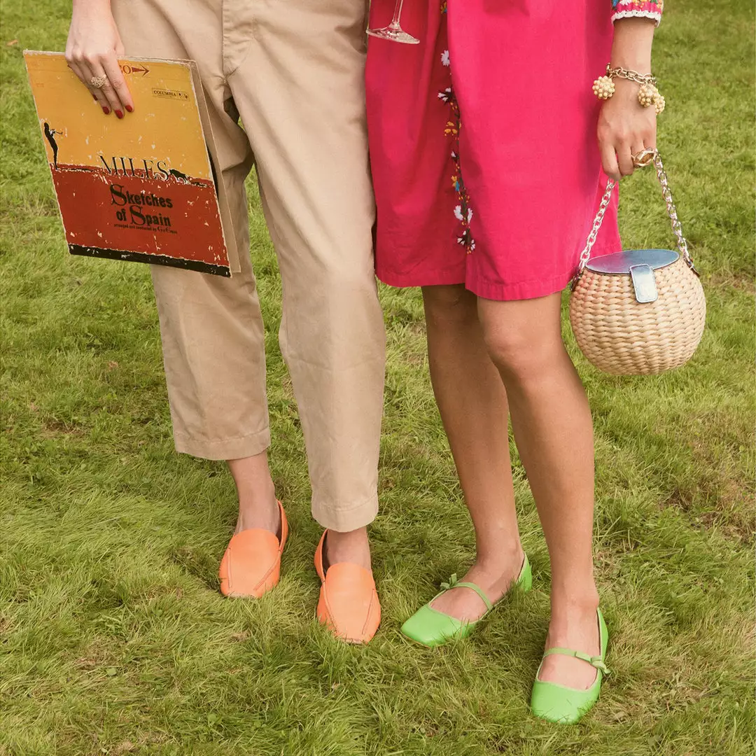 Calfskin leather with elastic bow strap. Squared toe. Leather sole.
