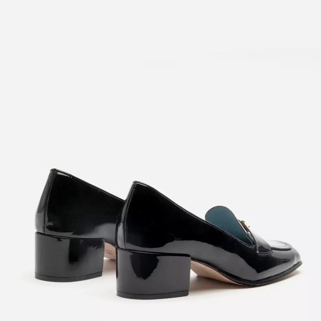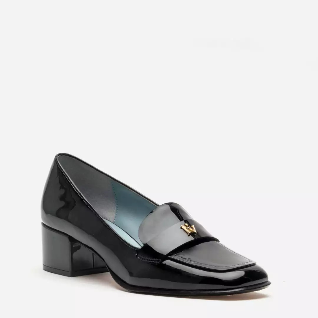 Meet Twiggy, our new soft patent square-toed loafer which features subtle gold FV logo-buckle hardware and a stacked block heel.