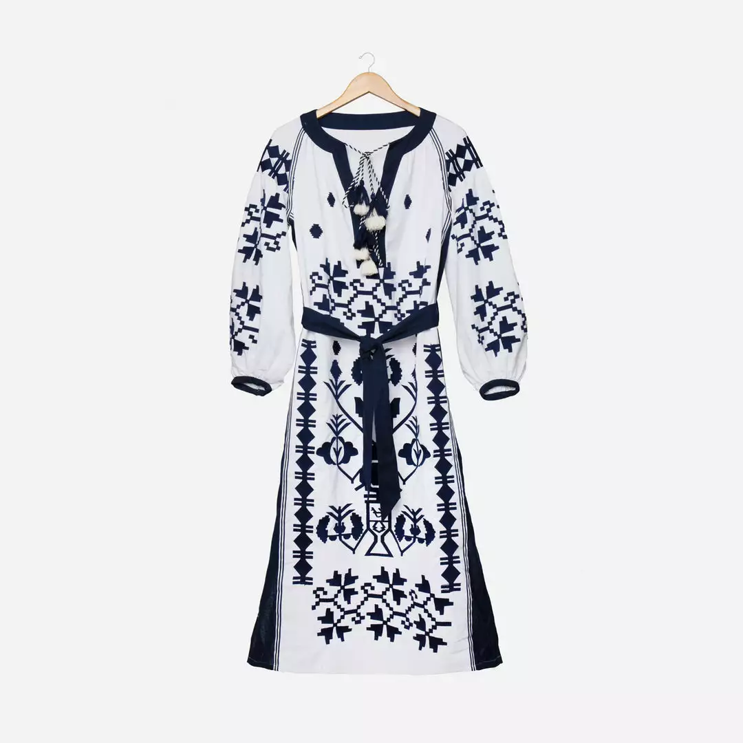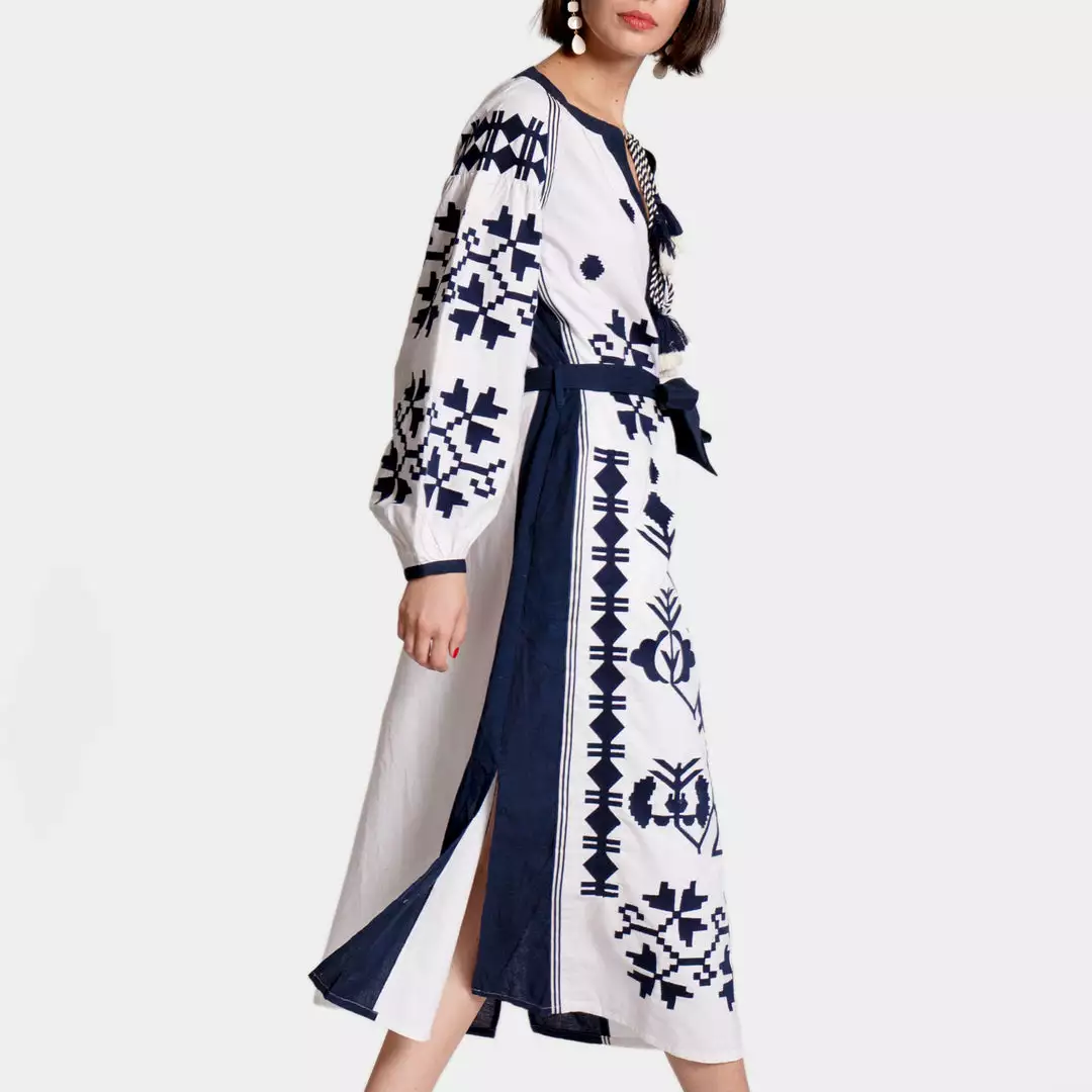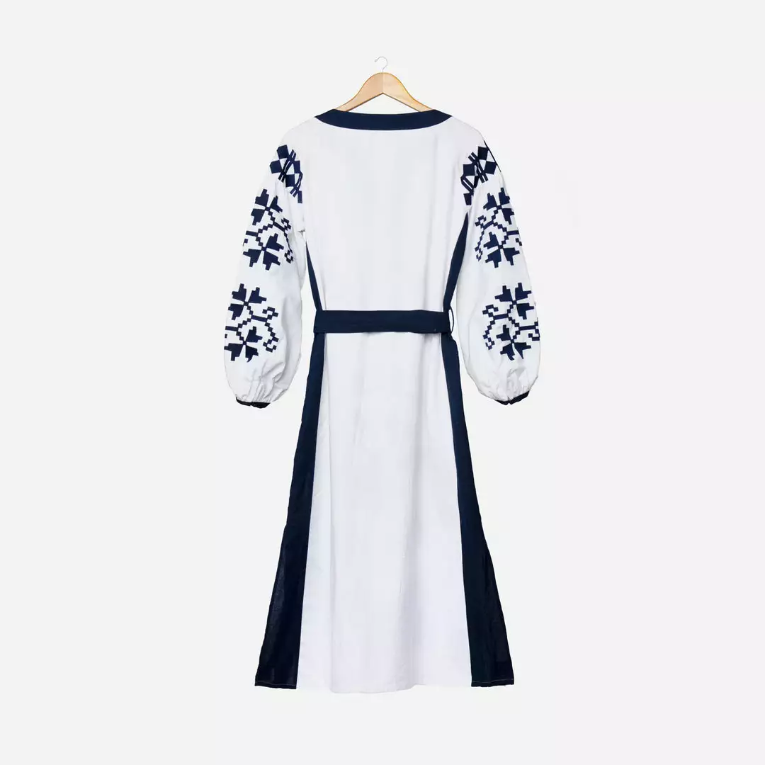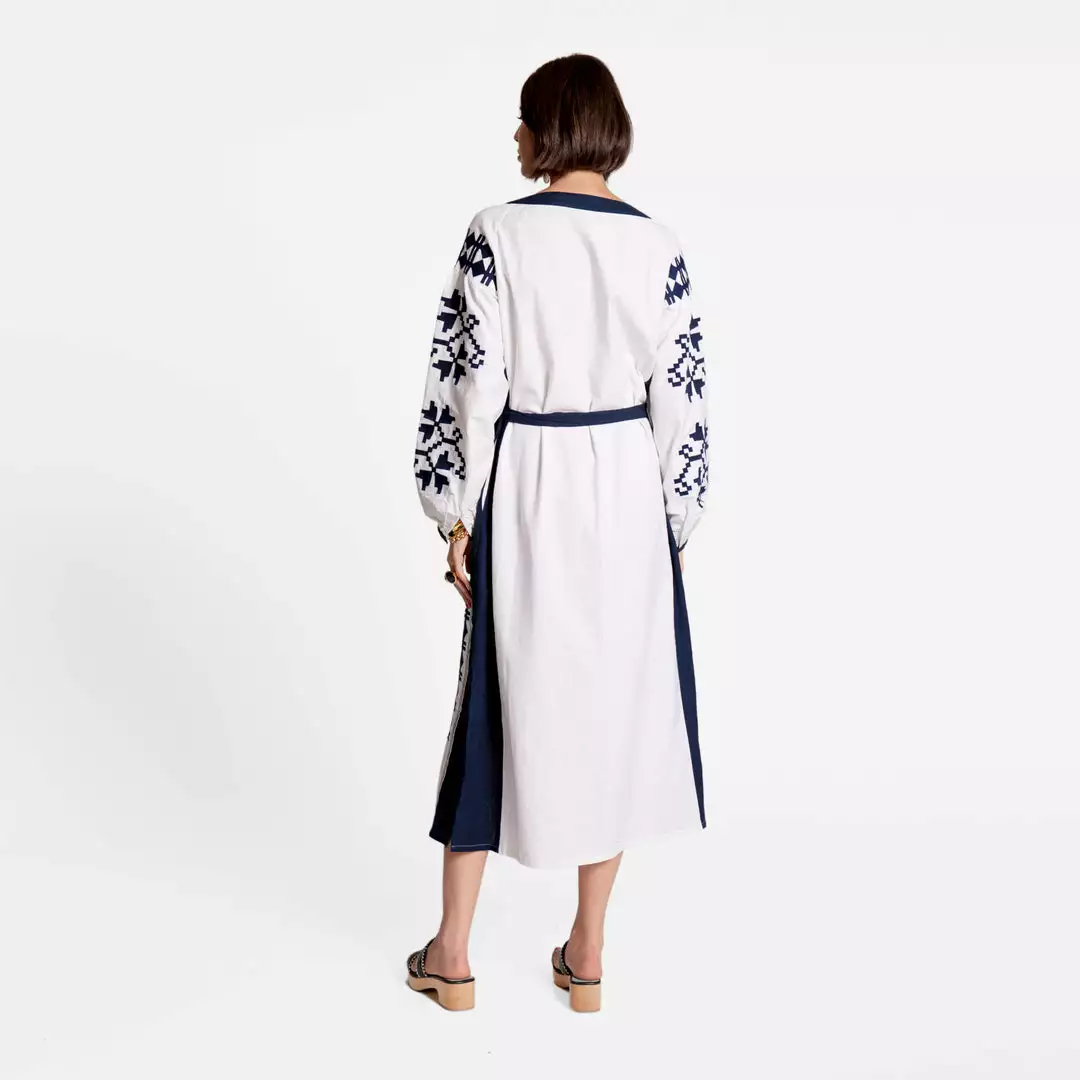 - Navy and white embroidered details