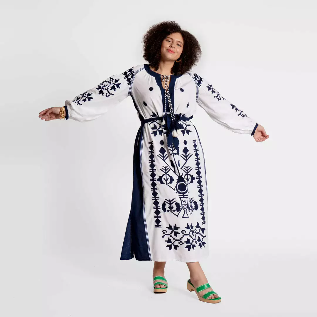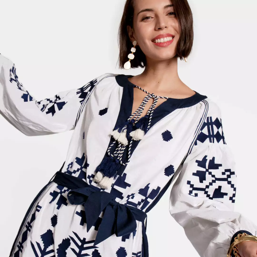Step into warmer weather in the Stephanie Dress, our new embroidered dress crafted in cotton featuring intricate embroidered details and contrast tassel ties. The flattering silhouette features navy and white front tassel tie closures with a matching tie belt at the waist.